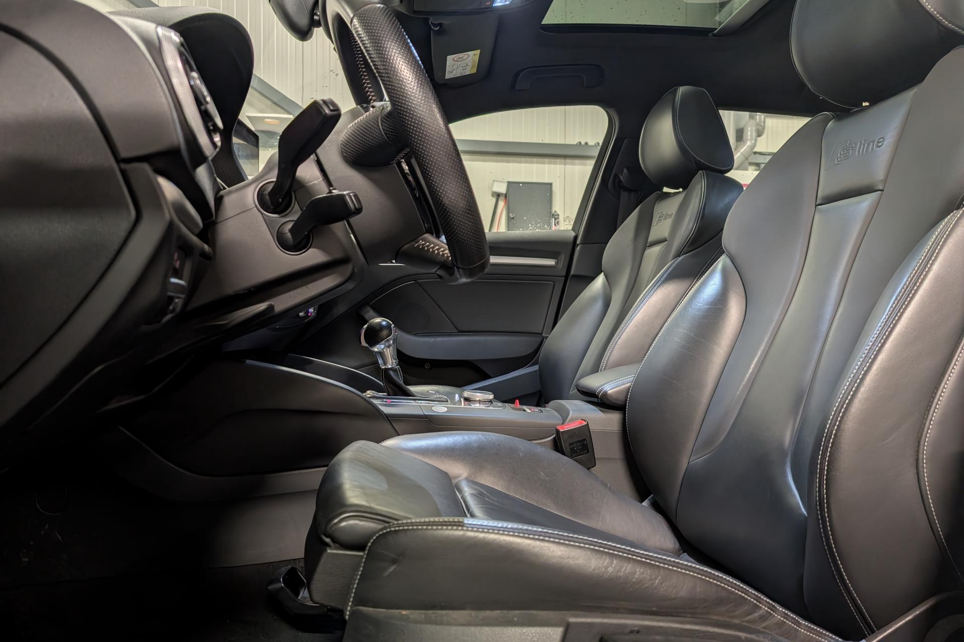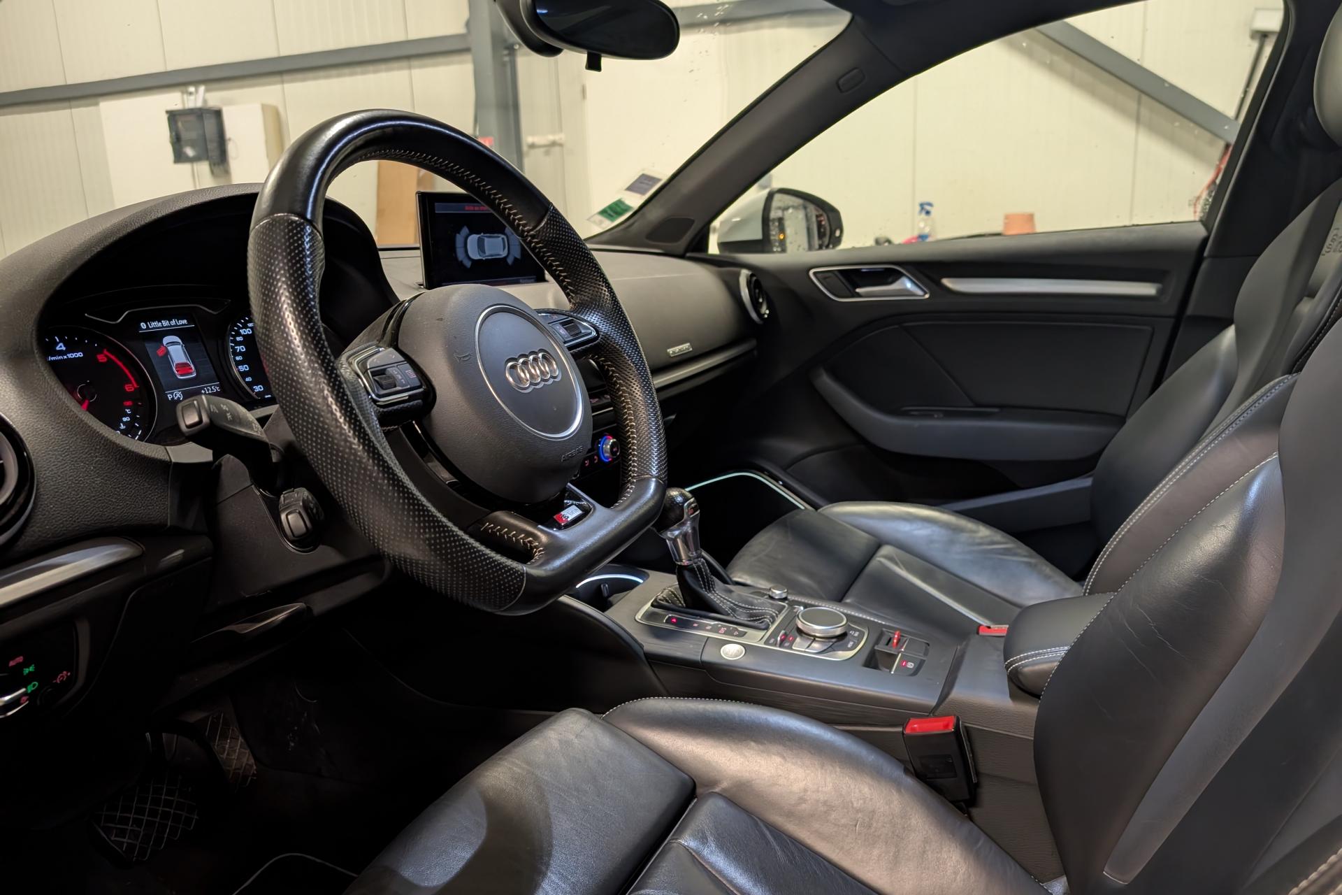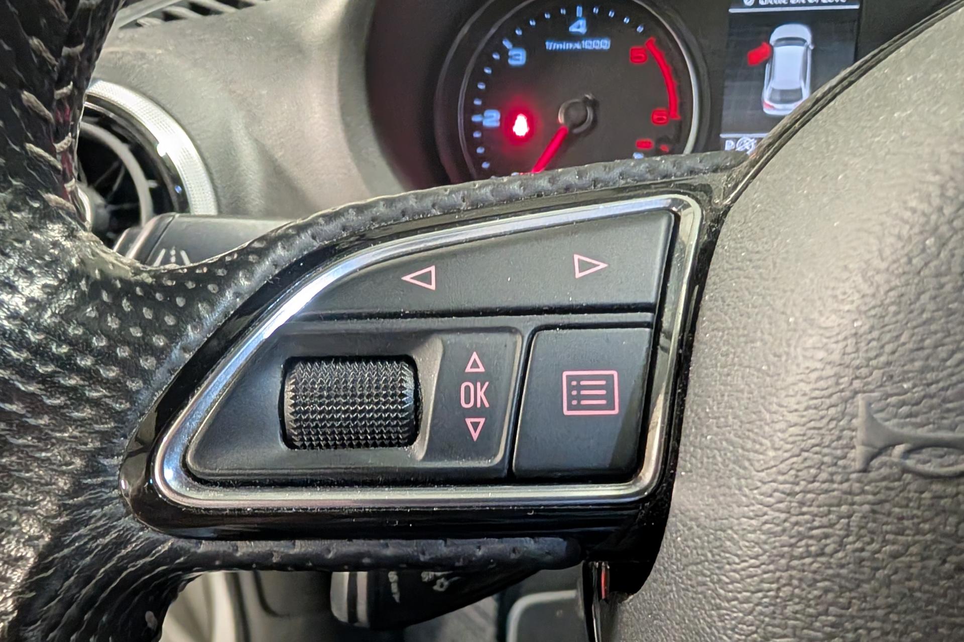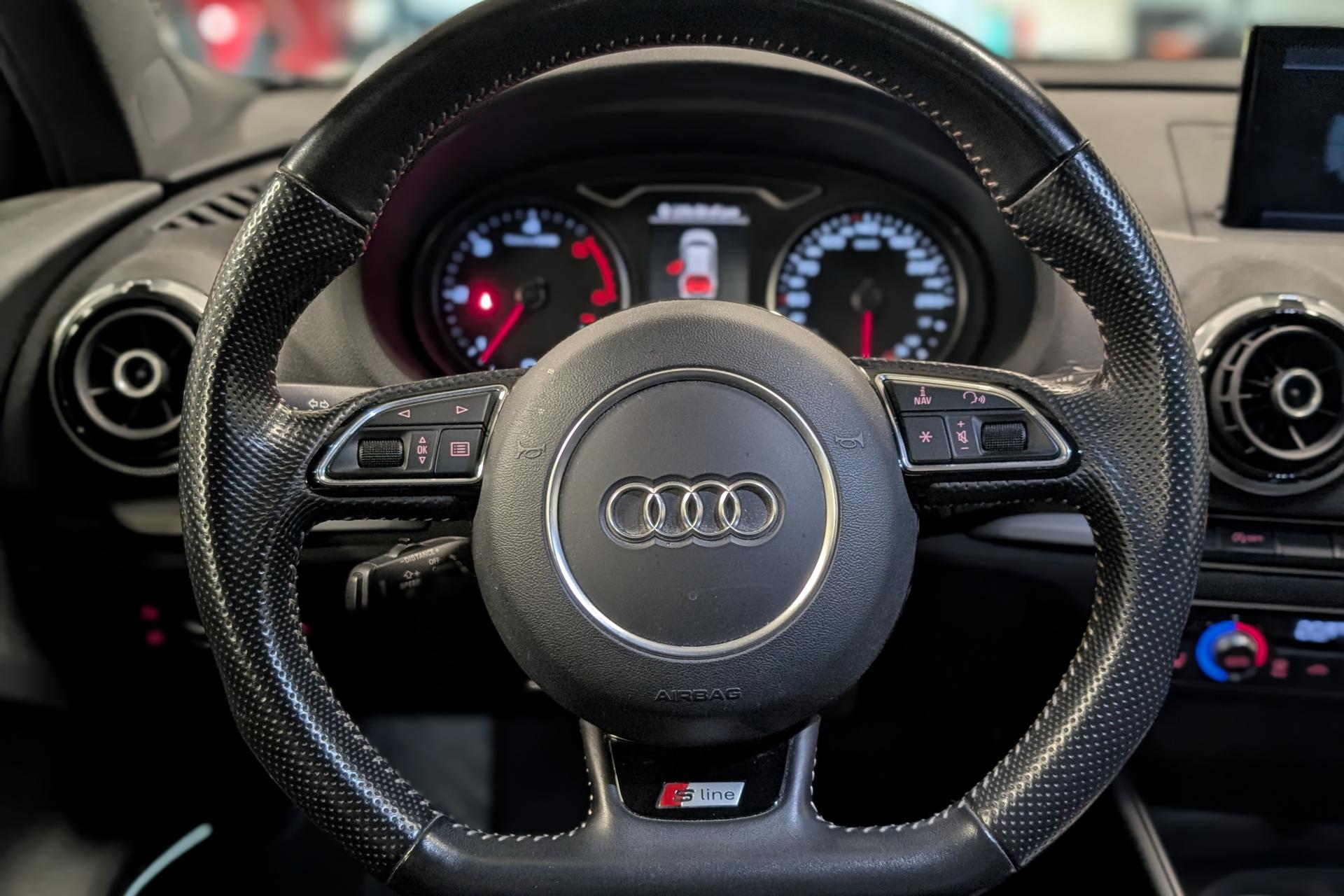 Accoudoir central avant coulissant en longueur, avec vide-poches relevable et inclinaison réglableAirbag genoux conducteurAirbags grand volume pour le conducteur et le passagerAirbags latéraux à l'avant intégrés au dossier des siègesAllume-cigare et cendrier amovible, couvercle chromé avec anneaux AudiAntipatinage (ASR)Applications décoratives sur les contre-portes et tableau de bord “Aluminium brossé mat”Audi drive select, permet différents réglages:Efficience, Confort, Dynamique, Auto et IndividuelAudi Singleframe avec encadrement chromé de la calandreBecquet de pavillon laqué dans la couleur de la carrosserie, avec inserts aérodynamiques latéraux noir brillantBlocage électronique de différentiel (EDS)Boîte à gants grand volume côté passager avant, éclairéeCache-bagages amovibleCarrosserie galvaniséeCeintures de sécurité 3 points automatiques pour toutes les places, prétensionneurs pyrotechniques, réglage des ceintures en hauteur à l'avant ; limiteurs de tension sur toutes les places extérieuresChâssis Sport, carrosserie surbaissée de 15 mm, avec suspension et amortisseurs plus fermesCiel de pavillon en tissu noirClimatisation automatique Confort avec réglage asservi à la position du soleilContrôle de ceinture attachée pour toutes les placesContrôle de pression des pneus ( TPMS )Contrôle électronique de stabilisation (ESC) désactivable, avec amplificateur hydraulique de freinage d'urgenceDétecteur de pluie et de luminosité incluant bande grise dans la partie supérieure du pare-briseDirection assistée électromécanique avec assistance asservie à la vitesse (servotronic)Dossier de banquette arrière rabattable en deux parties 40/60 ou complètementEclairage intérieur à l'avant et à l'arrièreEcrous antivolEssuie-glace arrière avec déclenchement automatique en marche arrièreFeux arrière avec feux de recul blancs et feux de brouillard arrière, incluant troisième feu stop surélevé et éclairage de plaque à LEDFeux de freinage adaptatifsFixation pour sièges enfants ISOFIX et Top Tether pour les places arrière extérieuresIdentification du modèle/technologie sur le capot de coffreInscription “S line” sur les ailes avantInscription quattro sur la calandre, le capot de coffre et le tableau de bord côté passagerJantes en aluminium coulé style 5 branches parallèles partiellement polies, 7,5 J x 18" avec pneus 225/40 R 18"Lave-essuie-glace 2 vitesses, 4 intervalles de balayage réglablesLève-vitres à l'avant et à l'arrière, électriques, avec protection antipincement, ouverture/fermeture par le verrouillage centralisé, fonction ouverture/fermeture par impulsionLunette arrière dégivrante, avec minuterieMiroir de courtoisie éclairéMMI RadioMoulures de seuils avec insert en aluminium et inscription “S line”Œilletons de fixation, 4 dans le coffre, pour maintenir les bagages et objets dans le coffre, points de fixation pour le filet mixte en optionOutillage de bord dans le coffre incluant un cricPack aluminium extérieurPack rangement et coffrePack rangement et coffrePare-brise acoustique, améliore l'isolation phonique du pare-brise et réduit les bruits extérieursPare-chocs dans la couleur de la carrosseriePare-soleil rabattables et pivotants, côtés conducteur et passager avant, avec miroir de courtoisie occultablePatères à vêtements sur les montants de pavillon centraux, à gauche et à droite, simplesPhares antibrouillard halogènes, intégrés à la jupe avantPoignées de maintien. 4 poignées avec mécanisme amortisseur, rabattables, encastrées dans le pavillonPommeau du levier/sélecteur de vitesses en cuir perforé noirPréparation pour téléphone portable (Bluetooth)Prise de courant 12 volts sur la console centrale à l'avantProtection antidémarrage électronique, intégrée à la gestion du moteur, activation automatique par la clé du véhiculeProtection latérale anticollision avec barres extrêmement rigides dans les portières et une structure latérale de carrosserie renforcéeRecommandation de repos qui analyse le comportement routier au moyen de différents capteursRégulateur de vitesseRétroviseur intérieur électrochromeRétroviseurs extérieurs avec clignotants à LED intégrés réglables électriquement et dégivrants, miroir asphérique à gauche, convexe à droite. Buses de lave-glace dégivrantesRoue de secours temporaire de type galetteSellerie mixte en tissu Biathlon et cuirSièges à l'avant avec positionnement en longueur et inclinaison de dossier réglables manuellementSièges conducteur et passager avant réglables en hauteurSièges Sport à l'avant avec bourrelets latérauxSignal sonore pour oubli d'extinction des feuxSorties d'échappement doubles à gauche chroméesSupport pour téléphone portable et clé avec compatiment séparé pour le rangement du téléphone portable et la clé du véhicule. Rangement intégré avec encadrement chromé sur la console centraleSystème d'airbags de têteSystème d'information du conducteur avec écran couleur haute résolution de 3,5 poucesSystème de freinage avec antiblocage (ABS) et répartiteur électronique de freinage (EBV)Système de ventilation et chauffage 4 diffuseurs d'air rondsTapis complémentaires à l'avant et à l'arrière assortis à la couleur de la moquetteTémoins de contrôle pour, entre autres : airbag, ABS, ESC/ASR, frein de stationnement serré, électronique EDS, phares, clignotants, circuit de freinage, pression d'huile moteur, fermeture du coffre, système électrique du moteur, système de pr&eacuTriangle de présignalisation fixé sur l'intérieur du capot du coffreTrousse de secours dans le vide-poches sous le siège passagerVerrouillage centralisé à télécommandeVide-poches sur les habillages des portières ainsi que sur la console centrale avec porte-boissonVolant réglable en hauteur et en profondeurVolant Sport 3 branches multifonction en cuir badgé S line avec méplat et poignées de volant en cui