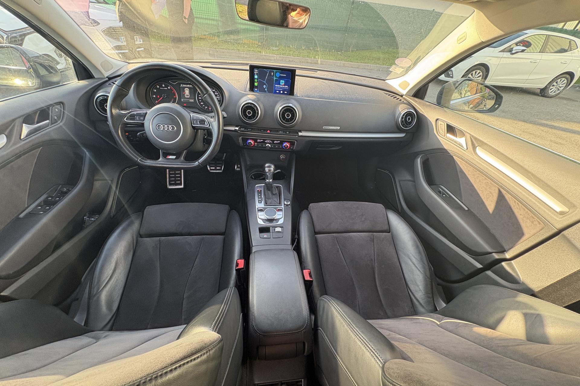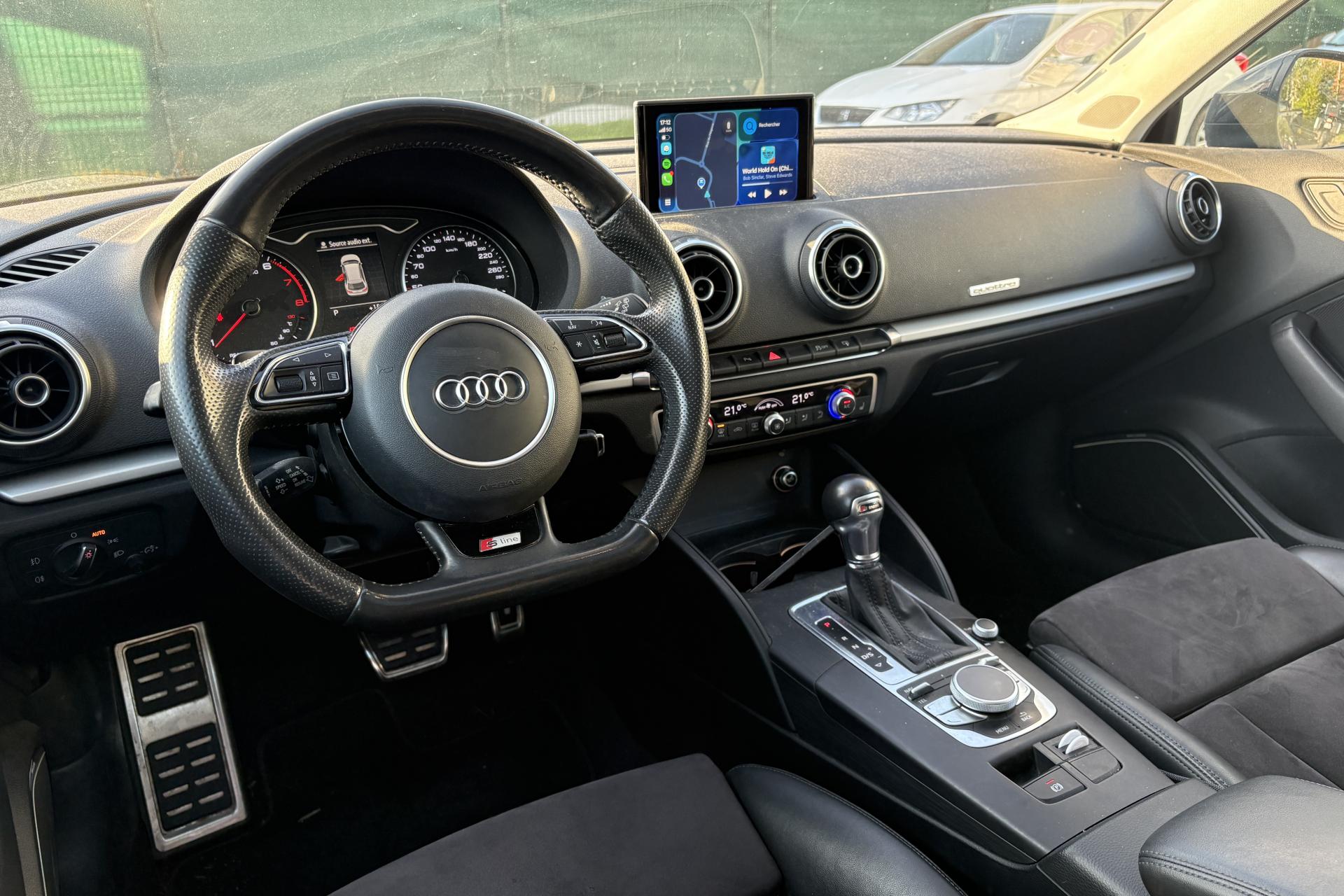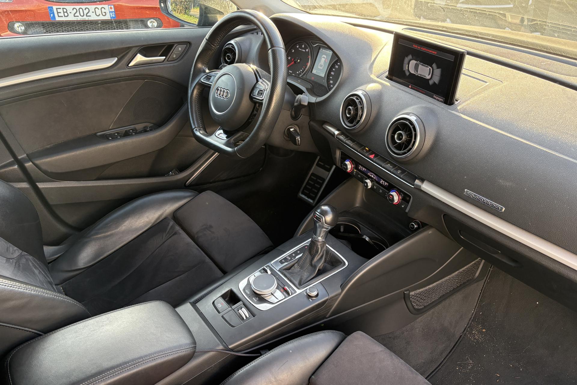 Accoudoir central avant coulissant en longueur, avec vide-poches relevable et inclinaison réglableAirbag genoux conducteurAirbags grand volume pour le conducteur et le passagerAirbags latéraux à l'avant intégrés au dossier des siègesAllume-cigare et cendrier amovible, couvercle chromé avec anneaux AudiAntipatinage (ASR)Applications décoratives sur les contre-portes et tableau de bord “Aluminium brossé mat”Audi drive select, permet différents réglages:Efficience, Confort, Dynamique, Auto et IndividuelAudi Singleframe avec encadrement chromé de la calandreBecquet de pavillon laqué dans la couleur de la carrosserie, avec inserts aérodynamiques latéraux noir brillantBlocage électronique de différentiel (EDS)Boîte à gants grand volume côté passager avant, éclairéeCache-bagages amovibleCarrosserie galvaniséeCeintures de sécurité 3 points automatiques pour toutes les places, prétensionneurs pyrotechniques, réglage des ceintures en hauteur à l'avant ; limiteurs de tension sur toutes les places extérieuresChâssis Sport, carrosserie surbaissée de 15 mm, avec suspension et amortisseurs plus fermesCiel de pavillon en tissu noirClimatisation automatique Confort avec réglage asservi à la position du soleilContrôle de ceinture attachée pour toutes les placesContrôle de pression des pneus ( TPMS )Contrôle électronique de stabilisation (ESC) désactivable, avec amplificateur hydraulique de freinage d'urgenceDétecteur de pluie et de luminosité incluant bande grise dans la partie supérieure du pare-briseDirection assistée électromécanique avec assistance asservie à la vitesse (servotronic)Dossier de banquette arrière rabattable en deux parties 40/60 ou complètementEclairage intérieur à l'avant et à l'arrièreEcrous antivolEssuie-glace arrière avec déclenchement automatique en marche arrièreExtension de bas de caisse pour réduire la valeur Cx et améliorer l'aérodynamiqueFeux arrière avec feux de recul blancs et feux de brouillard arrière, incluant troisième feu stop surélevé et éclairage de plaque à LEDFeux de freinage adaptatifsFixation pour sièges enfants ISOFIX et Top Tether pour les places arrière extérieuresIdentification du modèle/technologie sur le capot de coffreInscription “S line” sur les ailes avantInscription quattro sur la calandre, le capot de coffre et le tableau de bord côté passagerJantes en aluminium coulé style 5 branches parallèles partiellement polies, 7,5 J x 18" avec pneus 225/40 R 18"Lave-essuie-glace 2 vitesses, 4 intervalles de balayage réglablesLève-vitres à l'avant et à l'arrière, électriques, avec protection antipincement, ouverture/fermeture par le verrouillage centralisé, fonction ouverture/fermeture par impulsionLunette arrière dégivrante, avec minuterieMiroir de courtoisie éclairéMMI RadioMoulures de seuils avec insert en aluminium et inscription “S line”Œilletons de fixation, 4 dans le coffre, pour maintenir les bagages et objets dans le coffre, points de fixation pour le filet mixte en optionOutillage de bord dans le coffre incluant un cricPack aluminium extérieurPack rangement et coffrePare-brise acoustique, améliore l'isolation phonique du pare-brise et réduit les bruits extérieursPare-chocs dans la couleur de la carrosseriePare-soleil rabattables et pivotants, côtés conducteur et passager avant, avec miroir de courtoisie occultablePatères à vêtements sur les montants de pavillon centraux, à gauche et à droite, simplesPhares antibrouillard halogènes, intégrés à la jupe avantPoignées de maintien. 4 poignées avec mécanisme amortisseur, rabattables, encastrées dans le pavillonPommeau du levier/sélecteur de vitesses en cuir perforé noirPréparation pour téléphone portable (Bluetooth), commande sur volant multifonction, mains libres et audiostreamingPrise de courant 12 volts sur la console centrale à l'avantProtection antidémarrage électronique, intégrée à la gestion du moteur, activation automatique par la clé du véhiculeProtection latérale anticollision avec barres extrêmement rigides dans les portières et une structure latérale de carrosserie renforcéeRecommandation de repos qui analyse le comportement routier au moyen de différents capteursRégulateur de vitesseRétroviseur intérieur électrochromeRétroviseurs extérieurs avec clignotants à LED intégrés réglables électriquement et dégivrants, miroir asphérique à gauche, convexe à droite. Buses de lave-glace dégivrantesRoue de secours temporaire de type galetteSellerie mixte en tissu Biathlon et cuirSièges à l'avant avec positionnement en longueur et inclinaison de dossier réglables manuellementSièges conducteur et passager avant réglables en hauteurSièges Sport à l'avant avec bourrelets latérauxSignal sonore pour oubli d'extinction des feuxSorties d'échappement doubles à gauche chroméesSupport pour téléphone portable et clé avec compatiment séparé pour le rangement du téléphone portable et la clé du véhicule. Rangement intégré avec encadrement chromé sur la console centraleSystème d'airbags de têteSystème d'information du conducteur avec écran couleur haute résolution de 3,5 poucesSystème de freinage avec antiblocage (ABS) et répartiteur électronique de freinage (EBV)Système de ventilation et chauffage 4 diffuseurs d'air rondsTapis complémentaires à l'avant et à l'arrière assortis à la couleur de la moquetteTémoins de contrôle pour, entre autres : airbag, ABS, ESC/ASR, frein de stationnement serré, électronique EDS, phares, clignotants, circuit de freinage, pression d'huile moteur, fermeture du coffre, système électrique du moteur, système de pr&eacuTriangle de présignalisation fixé sur l'intérieur du capot du coffreTrousse de secours dans le vide-poches sous le siège passagerVerrouillage centralisé à télécommandeVide-poches sur les habillages des portières ainsi que sur la console centrale avec porte-boissonVolant réglable en