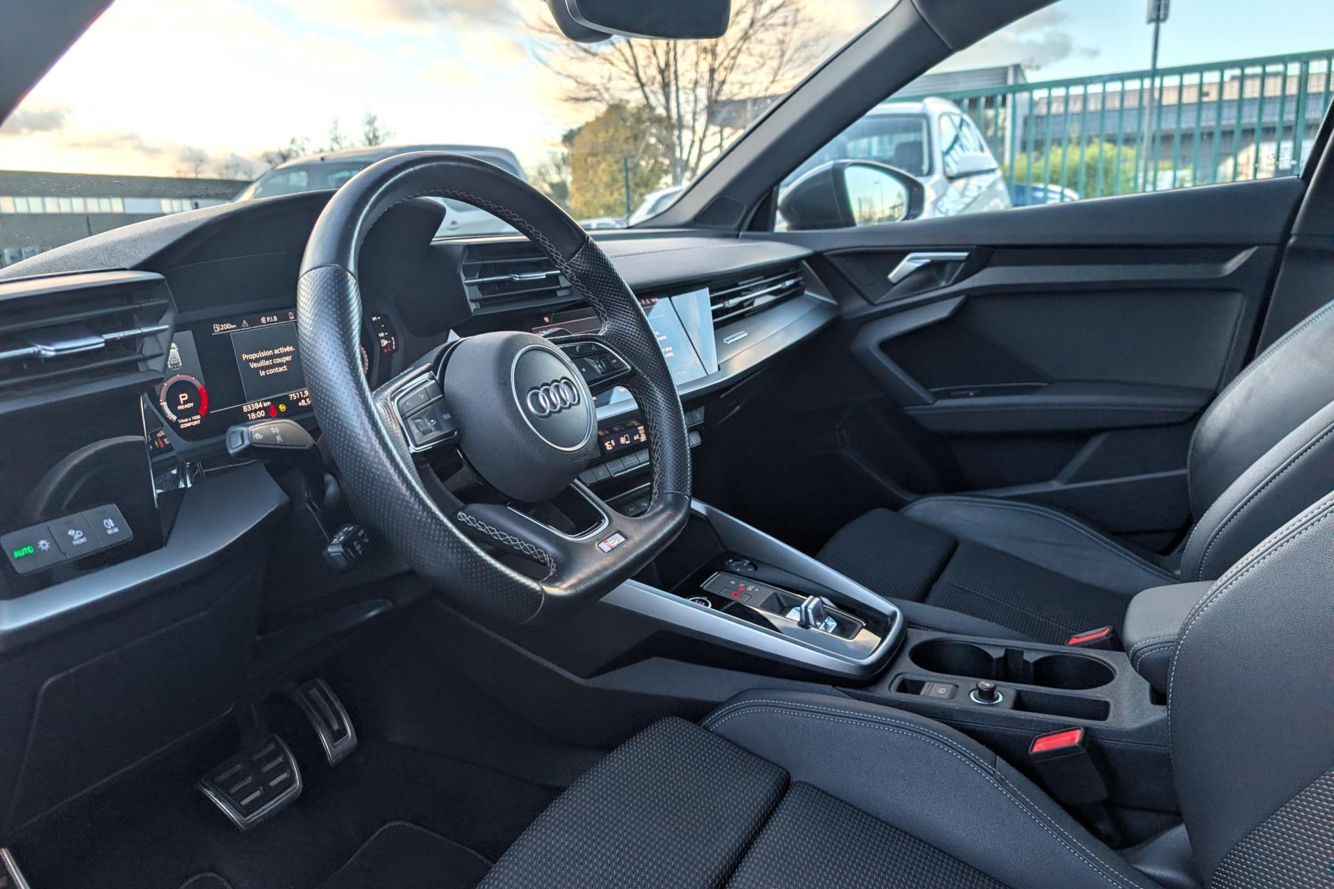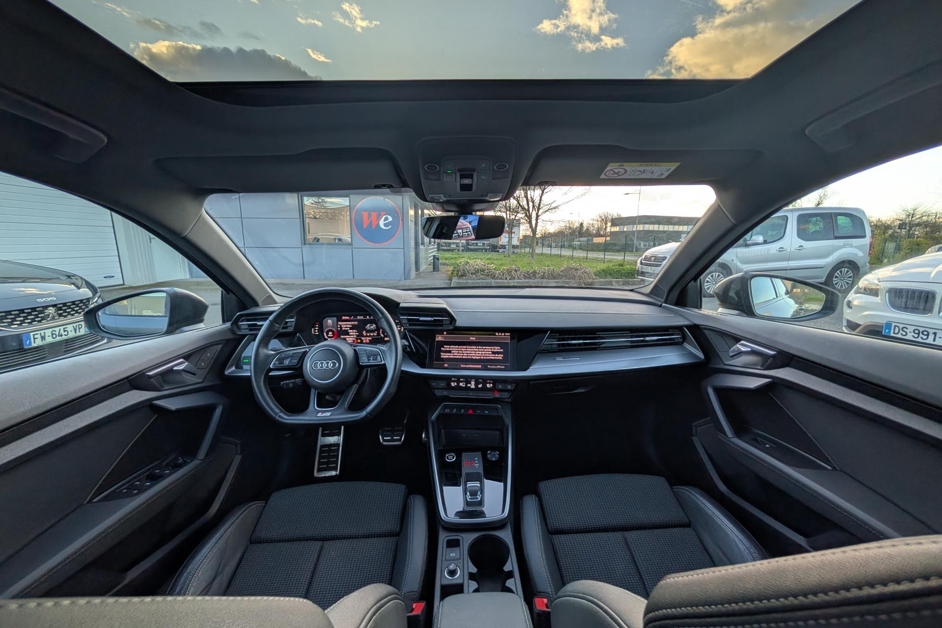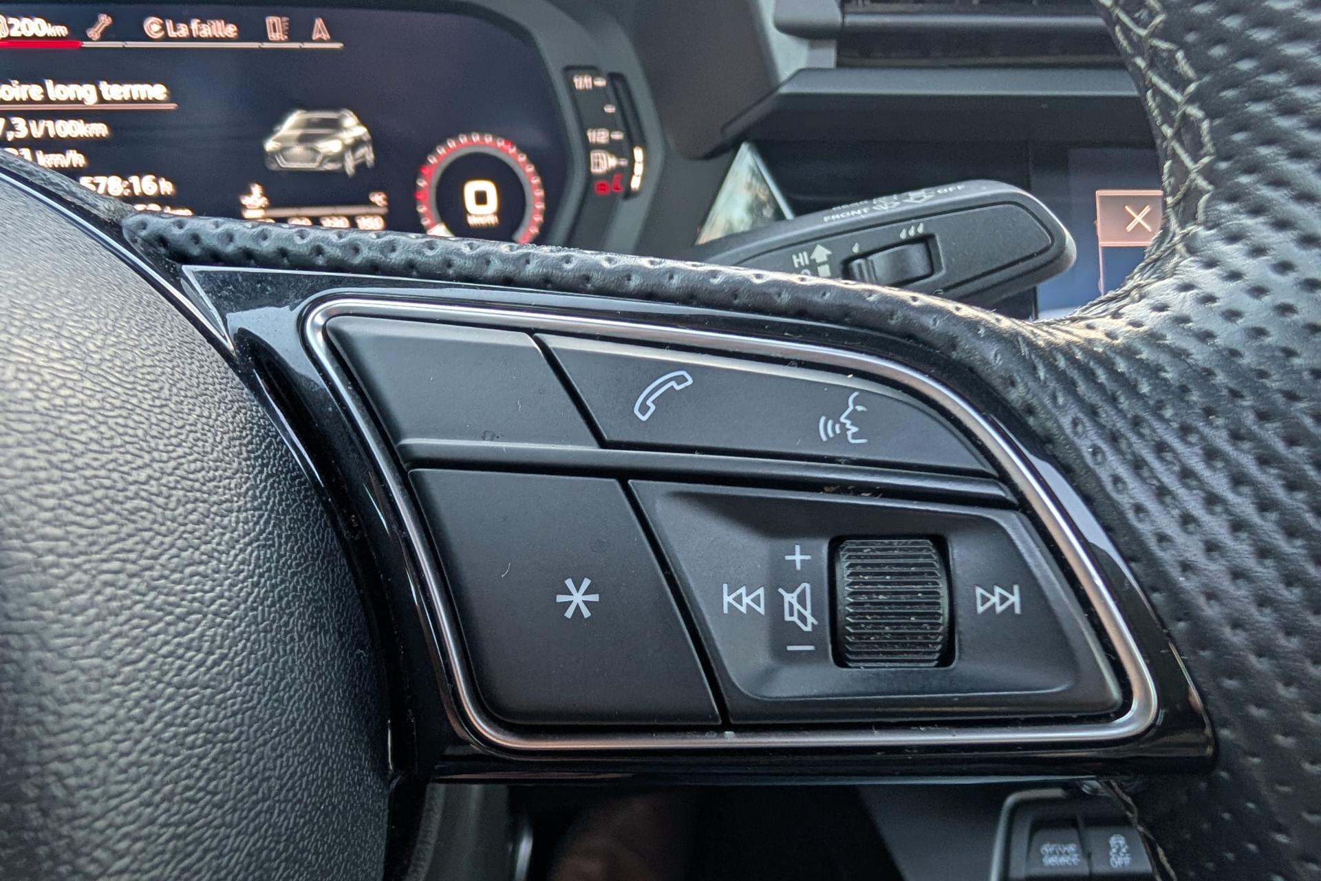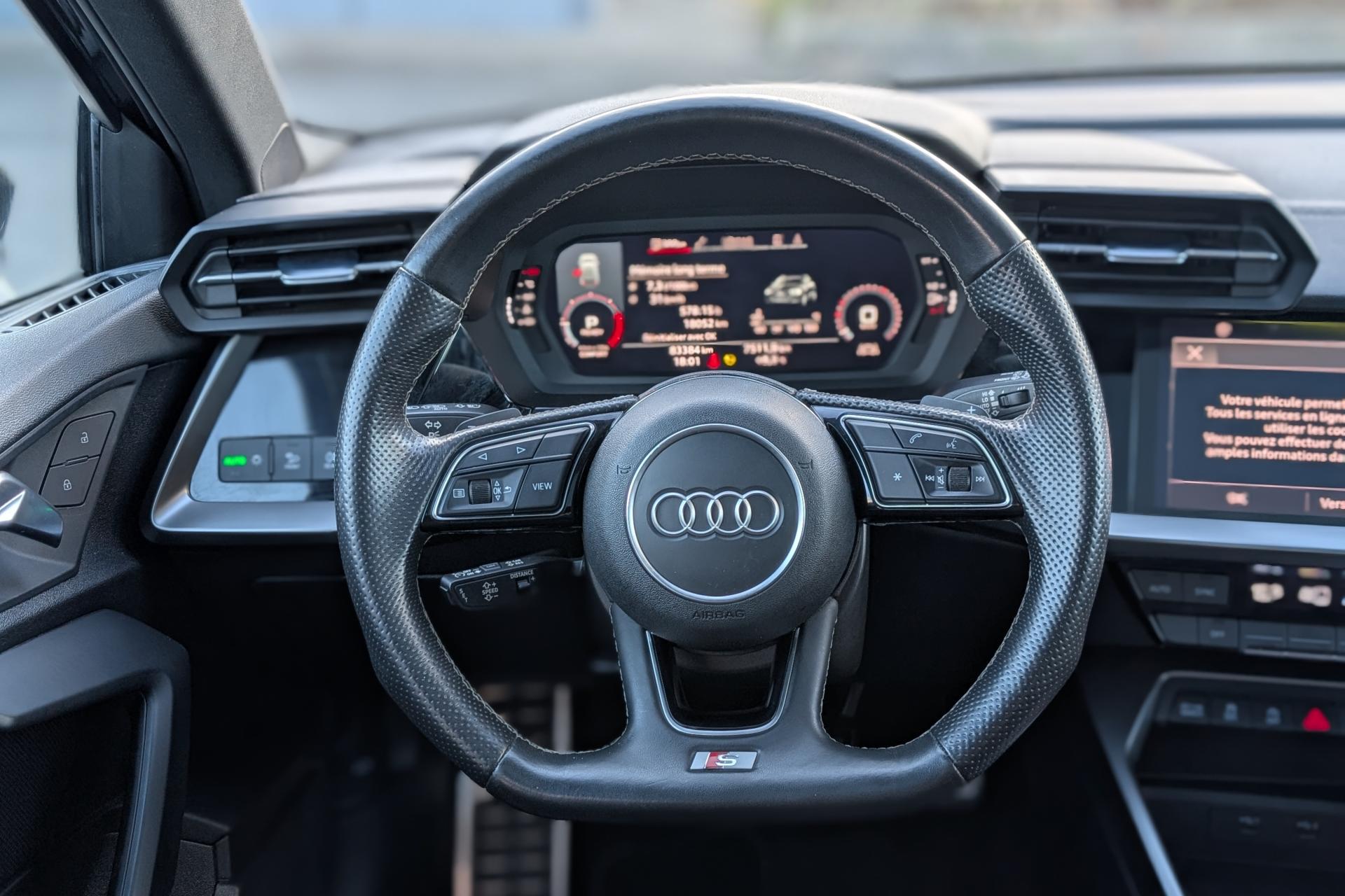 2 prises USB à l'arrièreAirbags latéraux à l'avant, avec airbags de têteAppel d’urgence Audi connectApplications décoratives en aluminium spectre foncéAudi connect Appel d’urgence & ServiceAudi Drive SelectAudi Park AssistAudi pre sense frontAudi smartphone interfaceAudi sound system : 10 haut-parleurs incluant un haut-parleur central et un subwoofer ; amplificateur à 6 canaux avec une puissance totale de 180 wattsAudi virtual cockpit : combiné d'instruments entièrement numérique de 10,25"Avertissement de sortie de voieBanquette arrière rabattable 40/60Caméra de reculCiel de pavillon en tissu noirClé à fréquence radio (sans safelock)Climatisation automatique confort 2 zonesCommande de désactivation d'airbag passager avantContrôle de la pression des pneumatiquesDétecteur de pluie et allumage automatique des projecteursDirection assistée électromécanique asservie à la vitesseEcrous antivolI-Size et Top Tether pour les sièges arrière extérieursInterface BluetoothJantes en alliage léger, 5 branches en Y, Gris Graphite, tournées brillantes, dimension 8,0J x 18 avec pneus 225/40 R18Kit anticrevaison (compresseur et produit de colmatage)Limiteur de vitesseMMI navigation plus avec MMI touchOutillage de bordPack Eclairage intérieurPack Extérieur S linePack Intérieur S linePare-brise avec isolation acoustiquePeinture verniePhares à LED avec clignotants dynamiques à l’arrièreRappel de ceinture de sécurité avec dispositif arrière de détection d’occupation du siègeRéception radio numérique (DAB)Régulateur de vitesseRétroviseur intérieur à position nuit automatique, sans encadrementRétroviseurs extérieurs couleur carrosserieRétroviseurs extérieurs réglables, dégivrants, rabattables électriquement avec fonction rabat automatique (côté passager avant, marche arrière enclenchée) et fonction jour/nuit automatique des deux côtésSécurité enfant électriqueSièges avant réglables manuellementTrousse de secours, triangle de présignalisation et 2 vestes de sécuritéVolant 3 branches multifonctions plus en cuir