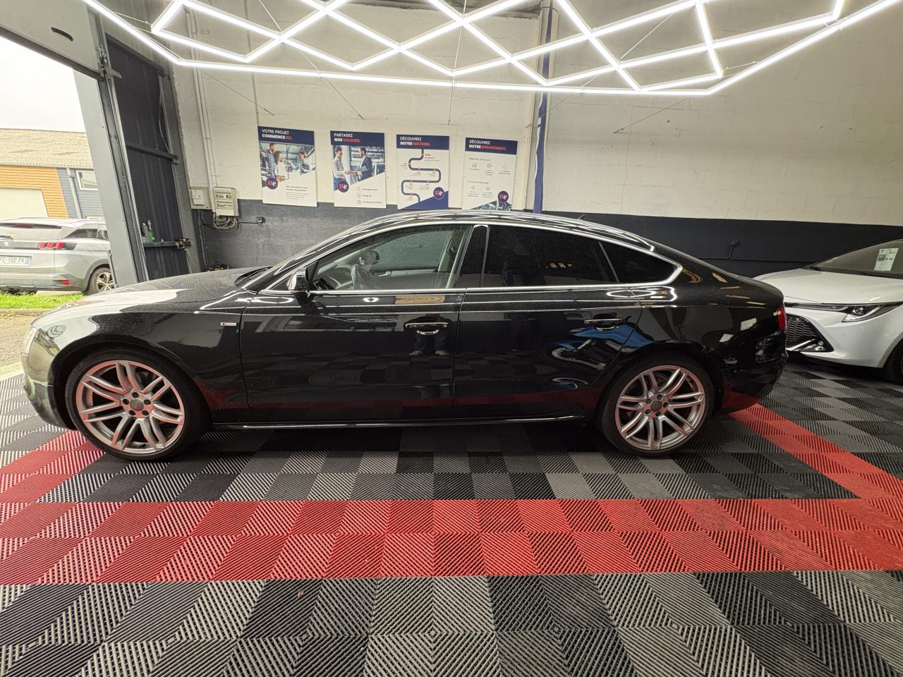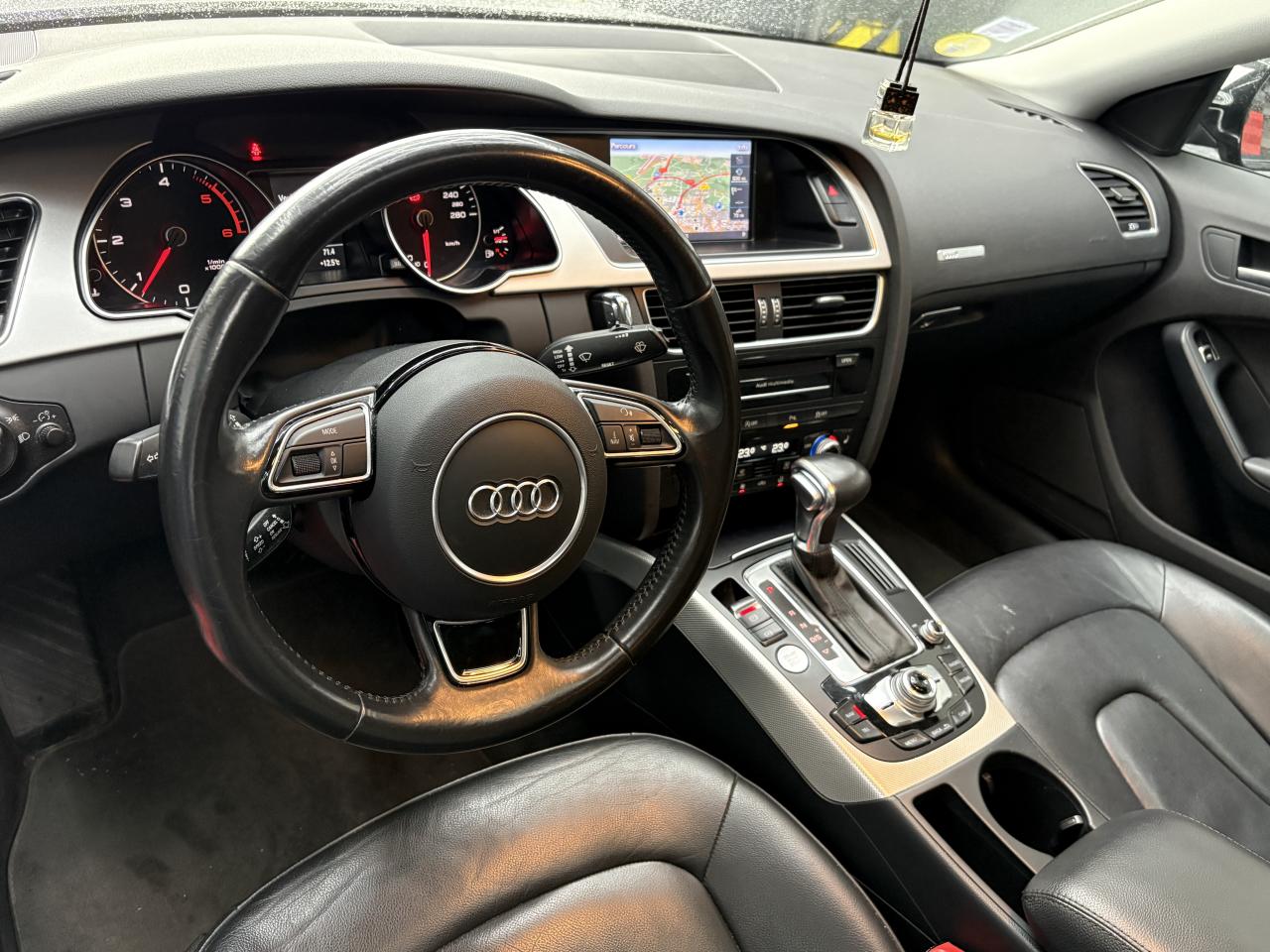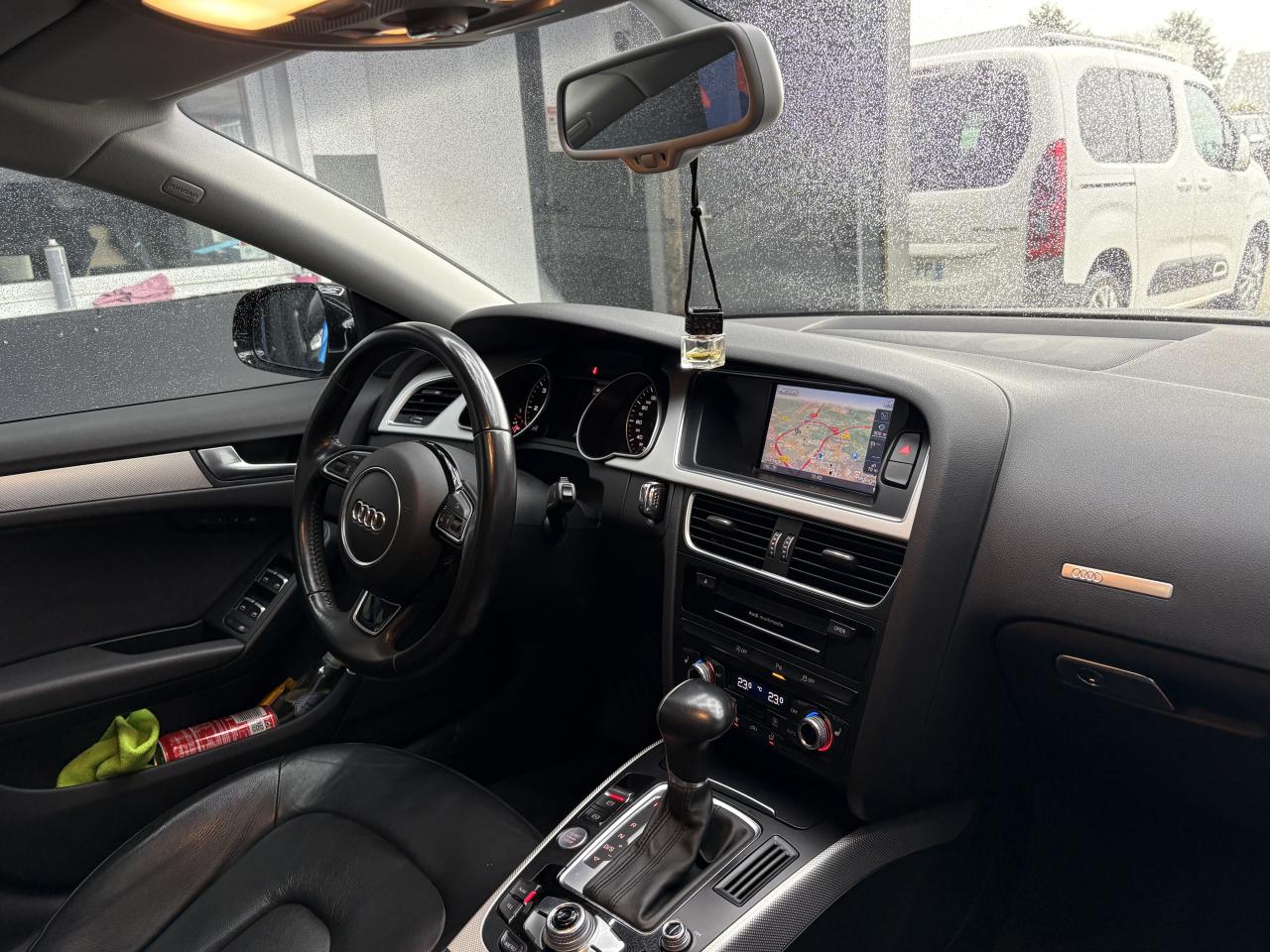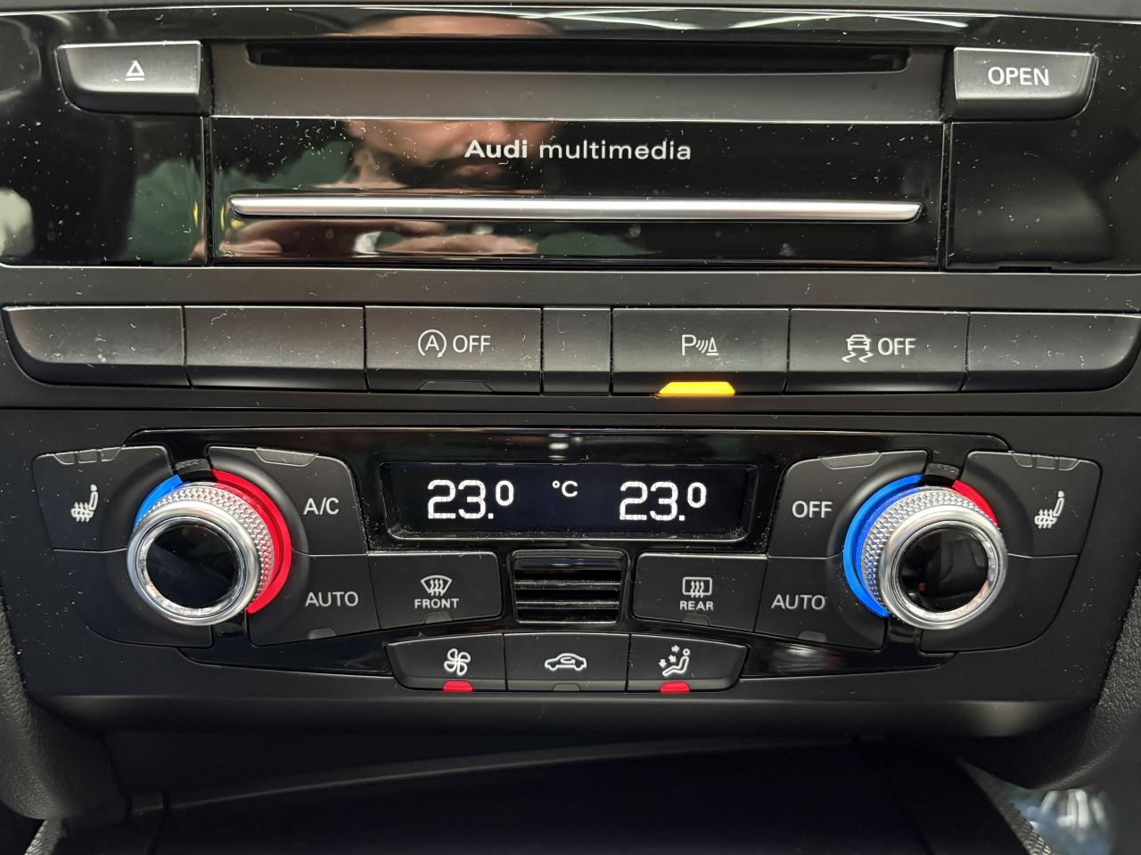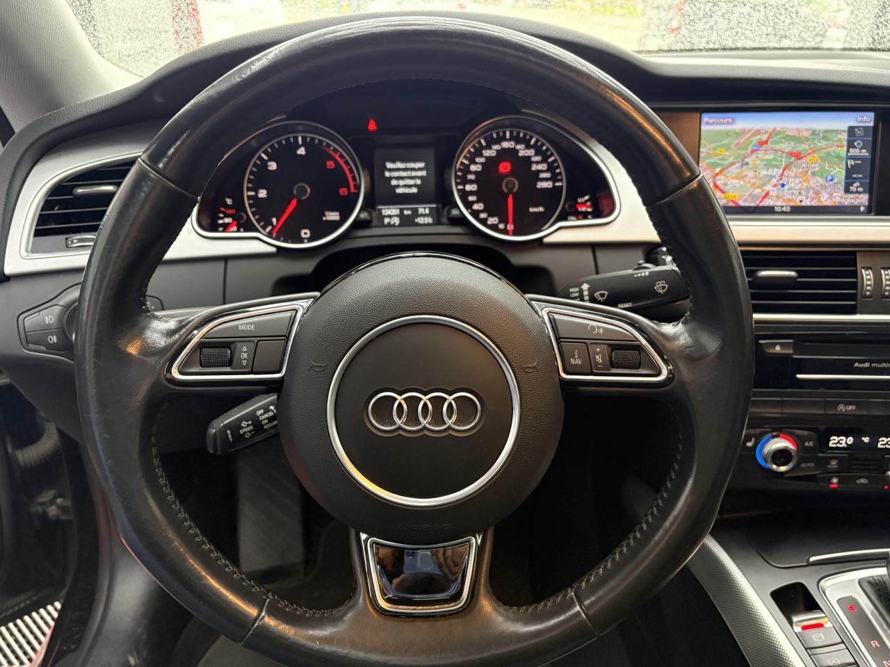 Accoudoir central avant avec vide-poches et 2 prises 12 V dans la console centraleAdvanced Key : système d'autorisation d'accès et de démarrage main libreAirbags grand volume pour conducteur et passager avant avec détecteur de la position d'assise ; airbag adaptatif pour le conducteur et passager avantAirbags latérauxAllume-cigare intégré dans le cendrier avantAntipatinage ASR pour une motricité optimale, empêche le patinage des roues motricesApplications en aluminium Trigon sur contre portes et console centraleAppuie-têtes réglables à l'avant et à l'arrièreAudi Hold Assist : maintient le véhicule à l'arrêt en côte comme en descente, sans limite de temps. Le système est activé par pression sur une touche et permet au conducteur un redémarrage confortable sans actionner le frein à mainAudi Music InterfaceAvertisseur deux tons avec commande au centre du volantBanquette arrière 3 placesBlocage électronique de différentiel EDS, aide au démarrage intervenant jusqu'à une vitesse d'environ 100 km/h, freinant automatiquement les roues motrices sur route glissante et inégalement adhérenteCalandre Singleframe avec lamelles horizontales noires brillantesCapot de coffre à déverrouillage par la télécommande ou par actionnement de la touche douce sur le capot du coffreCarrosserie galvaniséeCeintures de sécurité, automatiques à 3 points pour les 5 places, contrôle de port de ceinture, couleur assortie à celle de l'habitacleCendrier dans la console centrale à l'avant et à l'arrièreChâssis DynamiqueCiel de pavillon en tissu, selon la couleur choisie, argent lunaire, noir ou beige pashminaClimatisation automatique Confort Plus 3 zones à fonctionnalités étendues et affichage numériqueColonne de direction de sécuritéContact d'allumage électronique ; clé de contact pouvant mémoriser différentes données d'entretienContrôle de pression des pneus, vérifie durant la marche la pression de chacune des roues en serviceContrôle électronique de stabilisation ESC, relie ABS, ASR et EDS à ses propres capteursCric dans le coffreDésactivation de l'airbag passager (désactive aussi l'airbag latéral passager)Détecteur de pluie et allumage automatique des projecteursDirection asservie à la vitesse servotronicDossier des sièges arrière rabattable séparément 2/3 - 1/3, avec déverrouillage à distance des dossiers depuis le coffreEclairage intérieur à extinction temporisée et contacteurs sur toutes les portières ; éclairage coffre, conducteur passager avant et arrière, deux spots de lecture à l'avant, éclairage intérieur de l'arrière, miroir de cEcrous antivolEntourages de vitre en aluminium, revêtement noir brillant sur les montants de pavillon centraux et les triangles des portières arrièreÉtui à lunettes, dans le module d'éclairage intérieur avant, au-dessus du rétroviseur intérieurFonction Start/StopFrein de stationnement electromécaniqueGPS AdvancedIndicateur d'usure des disques à l'avant, affichage sur le système d'information du conducteurIndicateur de température extérieure dans le système d'information du conducteurInstrumentation à éclairage réglable, tachymètre électronique avec compteur kilométrique totalisateur et journalier, compte-tours, horloge, indicateur de température du liquide de refroidissement et jauge de carburantJantes Audi Sport en aluminium coulé style 10 branches fines, 8,5 J x 18”, avec pneus 245/40 R 18Lave-glace, deux vitesses, réglage d'intermittence sur 4 niveaux, commande de balayage coup par coup, lavage-balayage automatiqueLève-vitres électriques à l'avant et à l'arrière avec protection antipincement et fonction ouverture/fermeture Confort par impulsionLimiteurs d'effort des ceintures de sécurité avantLunette arrière dégivrante avec minuterieOrdinateur de bord couleur et système de contrôle AutocheckOutillage de bord dans le coffrePack EclairagePack RangementParking System Plus avec caméra de recul : signal acoustique et visuel d'aide au stationnement avant et arrière avec caméra de recul permettant de visualiser l'arrière du véhicule sur l'écran couleur du MMI.Phares antibrouillard intégrés dans le pare-chocsPoignées de maintien, amorties, rabattables dans les deux sens, dans le ciel de pavillonPoignées de portières extérieures laquées dans la couleur de carrosserie, poignées cintrées agréables à utiliserPré-équipement attelagePréparation ISOFIX pour sièges latéraux arrière et siège passager avantPréparation téléphone 2 W bi-bande (D et E), sans support pour adaptateur ni antenne de toit, commande sur volant multifonction, mains libres, interface BluetoothPrétensionneurs des ceintures de sécurité avantProtection antidémarrage électronique, intégrée à la gestion du moteur, activation automatique par la clé du véhiculeQuatre oeilletons de fixation, pour maintenir les bagages et objets dans le coffre, points de suspension pour le filet mixteRangements dans les contre-portes à l'avant avec casier de rangement pour boissons, rangements à l'arrière sur les côtés du siège et dans les garnitures latérales arrièreRéglage d'appuis lombaires électriques sur 4 plans pour sièges avantRégulateur de vitesse électronique actif dès 30 km/h. Inclut fonction de freinage. Affichage de la vitesse paramétrée sur l'écran de l'ordinateur de bordRéservoir avec protection contre les erreurs de ravitaillementRétroviseur intérieur jour/nuit automatique incluant une bande grise en haut du pare-briseRétroviseurs extérieurs avec clignotant latéral intégré à diodes, réglable électriquement, boîtiers dans la couleur de la carrosserie, miroir asphériqueRoue de secours temporaireSellerie, appuie-tête et accoudoir central avant en cuir MilanoSideguard, système d'airbags de tête grand formatSièges avant chauffants : chauffe-dossier et assise y compris partie latérale des siègesSièges avant électriques et conducteur à mémoire 2 combinaison