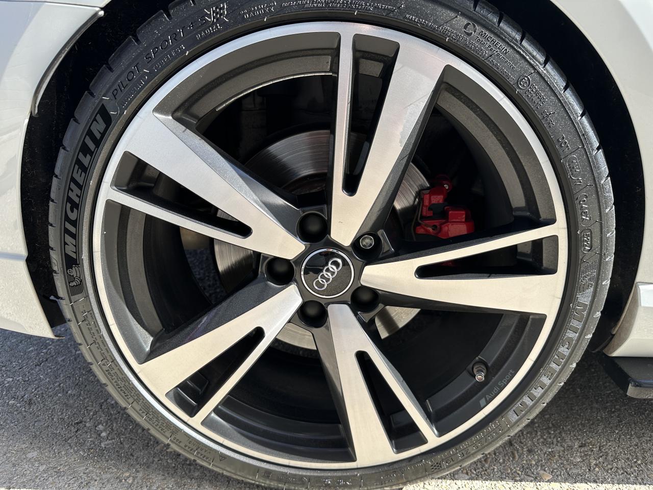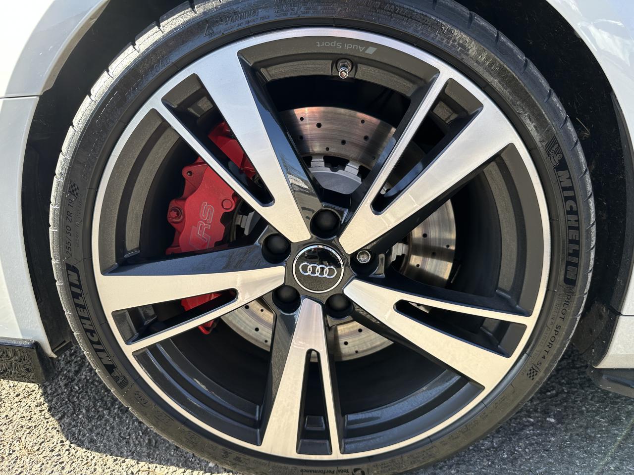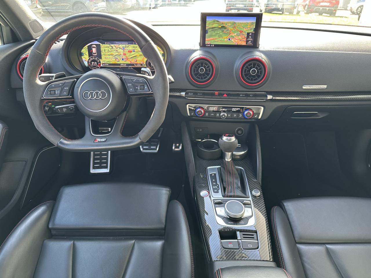 Accoudoir central avant coulissant en longueur, avec vide-poches relevable et inclinaison réglable, ASR (antipatinage), Audi Drive Select : différents réglages du véhicule à travers trois modes, Audi parking system plus : signal acoustique et visuel d'aide au stationnement avant et arrière par pictogrammes sur l'écran, Audi Premium Tracking System, Audi Smartphone Interface avec AppleCarplay et AndroidAuto, Audi sound system : 10 haut-parleurs incluant un haut-parleur central et un subwoofer ; amplificateur à 6 canaux avec une puissance totale de 180 watts, Audi virtual cockpit : combiné d’instruments entièrement numériques avec affichage haute résolution sur un écran de 12,3", Buses de lave-glace chauffantes, Châssis Sport RS, Climatisation automatique bi-zone, Direction progressive contribuant à une augmentation de la dynamique de conduite grâce à une démultiplication directe et progressive, Frein de stationnement electromécanique, Freins à disques, Jantes en alliage léger en style à 10 branches, ultrabrillantes, avec pneus 235/35 R19, Lave-phares, MMI navigation plus avec MMI touch, Pack Aluminium extérieur Pack aluminium intérieur Pack Eclairage Pack rangement + Pack coffre, Pare-brise acoustique, Pare-chocs RS : style dynamique et sportif, larges prises d'air à l'avant en noir brillant ainsi que lame horizontale laquée dans la couleur de carrosserie, diffuseur noir brillant à l'arrière, Phares intégralement à LED (full LED) avec clignotants arrière dynamiques, Régulateur et limiteur de vitesse, Rétroviseur intérieur électrochrome, Rétroviseurs extérieurs réglables, dégivrants et rabattables électriquement avec position automatique pour manoeuvre de stationnement, Sièges avant sport, Système ABS avec répartiteur électronique de freinage EBV, programme électronique de stabilisation ESC avec détection de barres de toit et assistance au freinage d’urgence, Système d'airbags de tête, Système Start/ Stop avec récupération d'énergie de freinage, Volant Sport 3 branches multifonction en cuir avec méplat