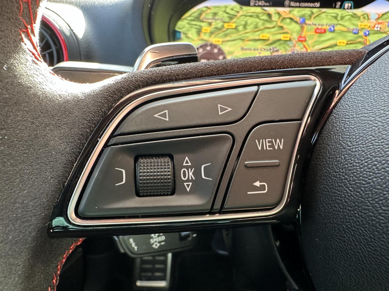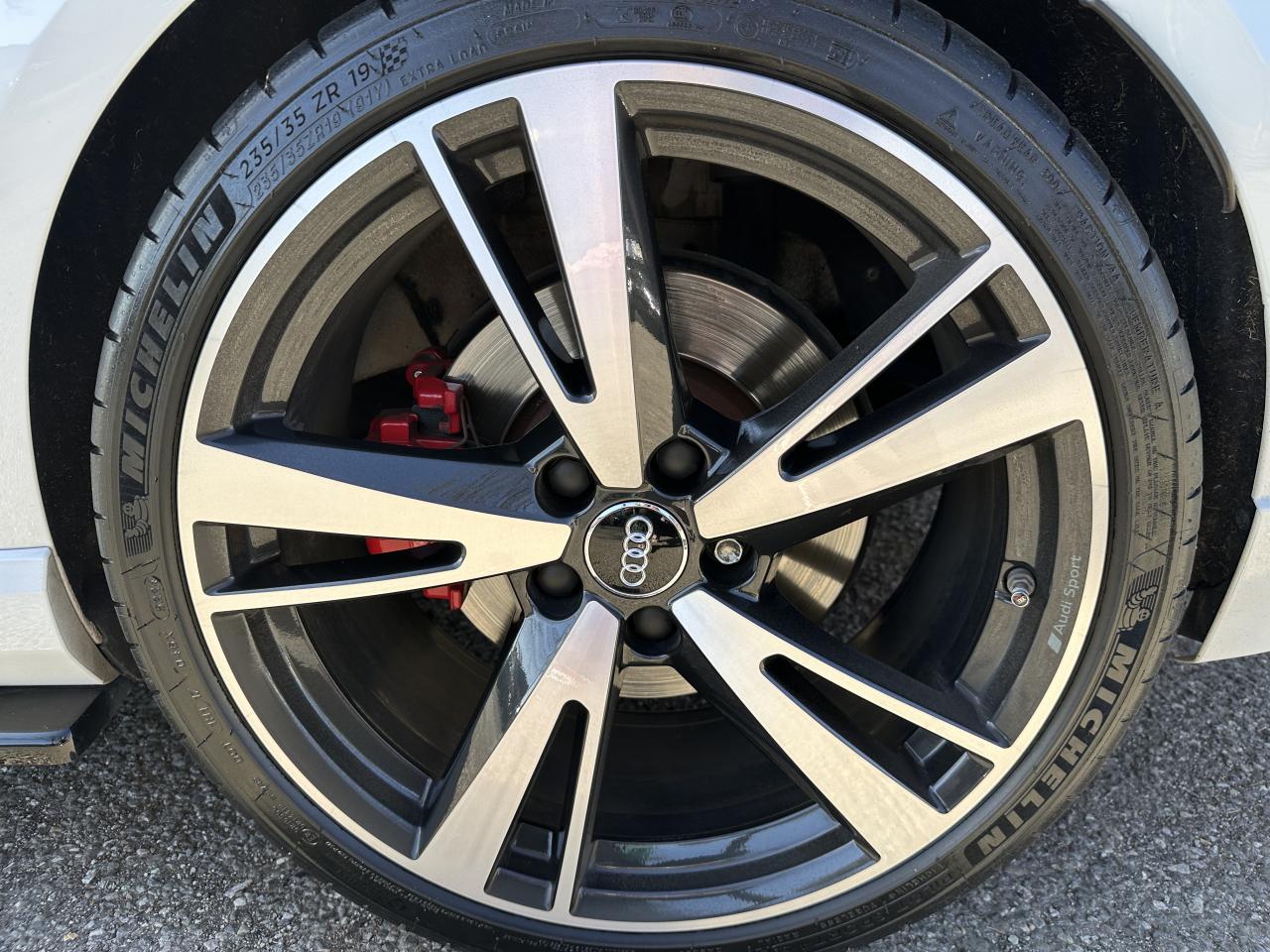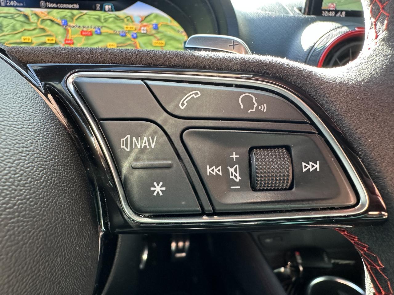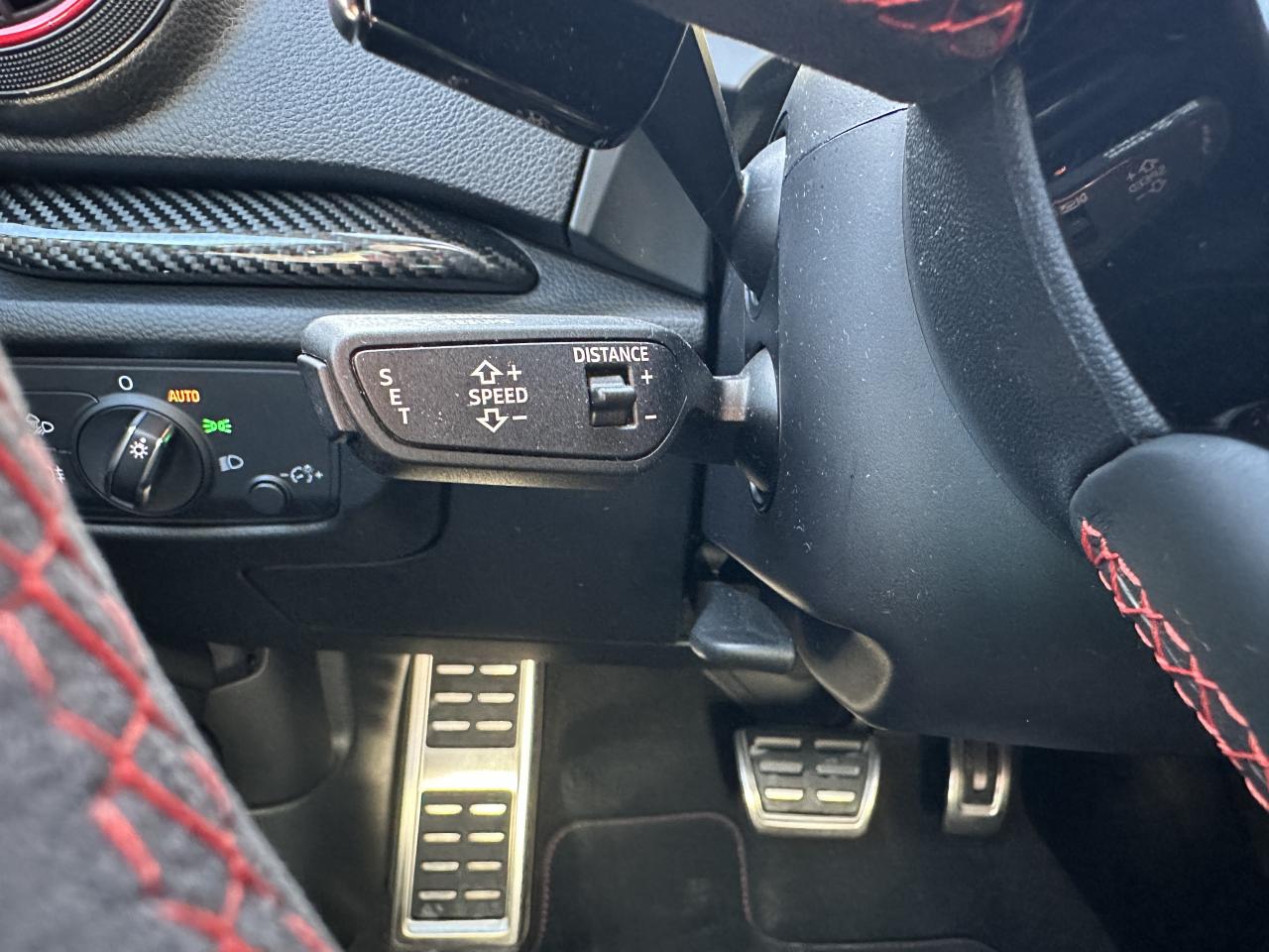 Accoudoir central avant coulissant en longueur, avec vide-poches relevable et inclinaison réglable, ASR (antipatinage), Audi Drive Select : différents réglages du véhicule à travers trois modes, Audi parking system plus : signal acoustique et visuel d'aide au stationnement avant et arrière par pictogrammes sur l'écran, Audi Premium Tracking System, Audi Smartphone Interface avec AppleCarplay et AndroidAuto, Audi sound system : 10 haut-parleurs incluant un haut-parleur central et un subwoofer ; amplificateur à 6 canaux avec une puissance totale de 180 watts, Audi virtual cockpit : combiné d’instruments entièrement numériques avec affichage haute résolution sur un écran de 12,3", Buses de lave-glace chauffantes, Châssis Sport RS, Climatisation automatique bi-zone, Direction progressive contribuant à une augmentation de la dynamique de conduite grâce à une démultiplication directe et progressive, Frein de stationnement electromécanique, Freins à disques, Jantes en alliage léger en style à 10 branches, ultrabrillantes, avec pneus 235/35 R19, Lave-phares, MMI navigation plus avec MMI touch, Pack Aluminium extérieur Pack aluminium intérieur Pack Eclairage Pack rangement + Pack coffre, Pare-brise acoustique, Pare-chocs RS : style dynamique et sportif, larges prises d'air à l'avant en noir brillant ainsi que lame horizontale laquée dans la couleur de carrosserie, diffuseur noir brillant à l'arrière, Phares intégralement à LED (full LED) avec clignotants arrière dynamiques, Régulateur et limiteur de vitesse, Rétroviseur intérieur électrochrome, Rétroviseurs extérieurs réglables, dégivrants et rabattables électriquement avec position automatique pour manoeuvre de stationnement, Sièges avant sport, Système ABS avec répartiteur électronique de freinage EBV, programme électronique de stabilisation ESC avec détection de barres de toit et assistance au freinage d’urgence, Système d'airbags de tête, Système Start/ Stop avec récupération d'énergie de freinage, Volant Sport 3 branches multifonction en cuir avec méplat
