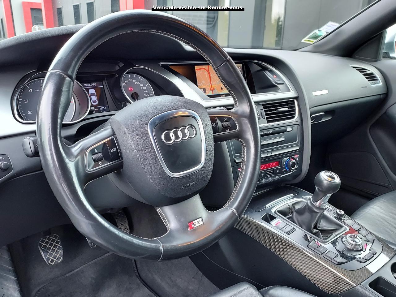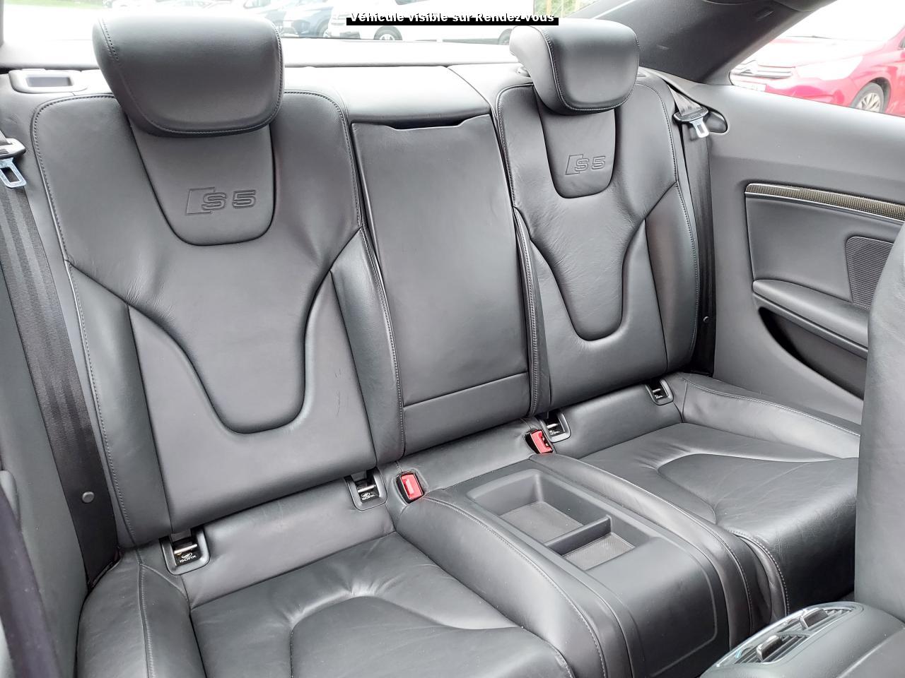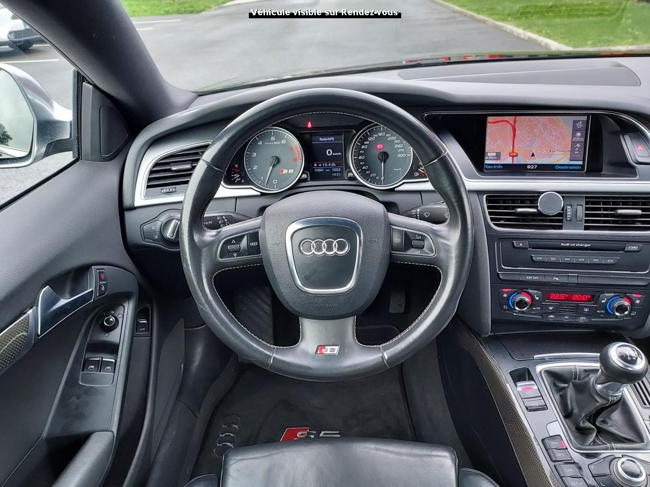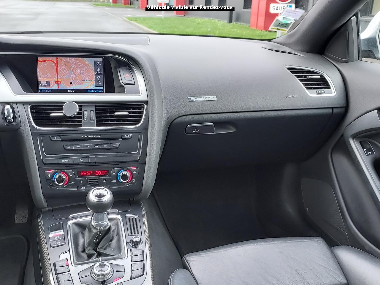 Accoudoir central avant avec vide-poches et 2 prises 12 VAccoudoir central dans le dossier des sièges arrière, rabattable ; compartiment avec trousse de secoursAirbags grand volume pour le conducteur et le passagerAirbags latéraux (airbag thorax et bassin à l'avant)Allume-cigareAntipatinage ASR : empêche le patinage des roues motrices ; assure une motricité optimaleAppuie-têtes, réglables à l'avant et à l'arrièreAudi Hold Assist : système désactivable maintenant le véhicule à l'arrêt en descente comme en côte; permet un redémarrage confortable sans mettre le frein à mainBlocage électronique de différentiel (EDS)Boîte manuelle 6 vitesses entièrement synchronisée, embrayage monodisque à sec commandé hydrauliquement avec garnitures sans amianteBuses de lave-glace chauffantesCarrosserie entièrement galvanisée contre la corrosionChâssis Sport spécifique S : suspension réglée pour un contact plus direct avec la route et un comportement sportifClimatisation automatique Confort Plus 3 zonesColonne de direction de sécuritéContact d'allumage électronique, clé de contact mémorisant différentes données d'entretienDétecteur de pluie et allumage automatique des projecteursDirection assistée ServotronicEclairage intérieur à extinction temporisée et contacteurs sur toutes les portièresFixation pour sièges enfants ISOFIX à l'arrièreFrein de stationnement electromécaniqueIndicateur de rapport de vitesse dans le système d'information du conducteur : apporte assistance au conducteur dans le choix du rapport de vitesse adaptéInstrumentation, avec éclairage réglable, compteur de vitesse électronique avec compteur kilométrique et compteur journalier, compte-tours, horloge, affichage de la température du liquide de refroidissement et jauge de carburantJantes en aluminium coulé style S 5 branches doubles, 8,5 J x 18”, avec pneus 245/40 R18Lave-glace, deux vitesses, 4 réglages d'intermittence, balayage coup par coup et lavage-balayage automatiqueLève-vitres électriques à l'avant avec protection antipincement, fonction ouverture/fermeture confort par impulsions ; vitres arrière fixesOuverture de coffre automatiquePack EclairagePorte-boissons sur la console centralePrétensionneurs des ceintures de sécurité avantPrétensionneurs et limiteurs d'effort des ceintures de sécurité à l'avantProgramme de stabilité électronique (ESP)Projecteurs antibrouillardProjecteurs au Xenon plusProtection antidémarrage électroniqueQuattro : transmission intégrale permanente avec répartition asymétrique et dynamique de coupleRadio Concert lecteur CD et lecteur cartes SD compatibles MP3, concept d'utilisation MMI, écran couleur de 6,5 pouces, fonction Memo-TP, GALA, phase diversifiéeRéglage d'appuis lombaires électriques sur 4 plans pour sièges avantRégulateur de vitesseRétroviseurs extérieurs électriques et dégivrantsRoue de secours temporaireSellerie cuirSièges Sport S à l'avant avec appuis-têtes intégrésSorties d'échappement : visible, à double flux, une sortie à gauche et une à droiteSystème acoustique d'aide au stationnement arrièreSystème antiblocage ABS avec répartiteur de freinage EBV, programme électronique de stabilisation ESP avec amplificateur hydraulique de freinage d'urgenceSystème antiblocage ABS avec répartiteur électronique de freinage EBVTélécommande à fréquence radio pour le verrouillage centraliséTransmission intégrale permanente quattroVerrouillage centralisé avec fonction Autolock et télécommande à fréquence radioVerrouillage électrique de la colonne de directionVolant réglable en hauteur et en profondeurVolant Sport multifonction en cuir style 3 branches avec emblème S5 et airbag grand volume