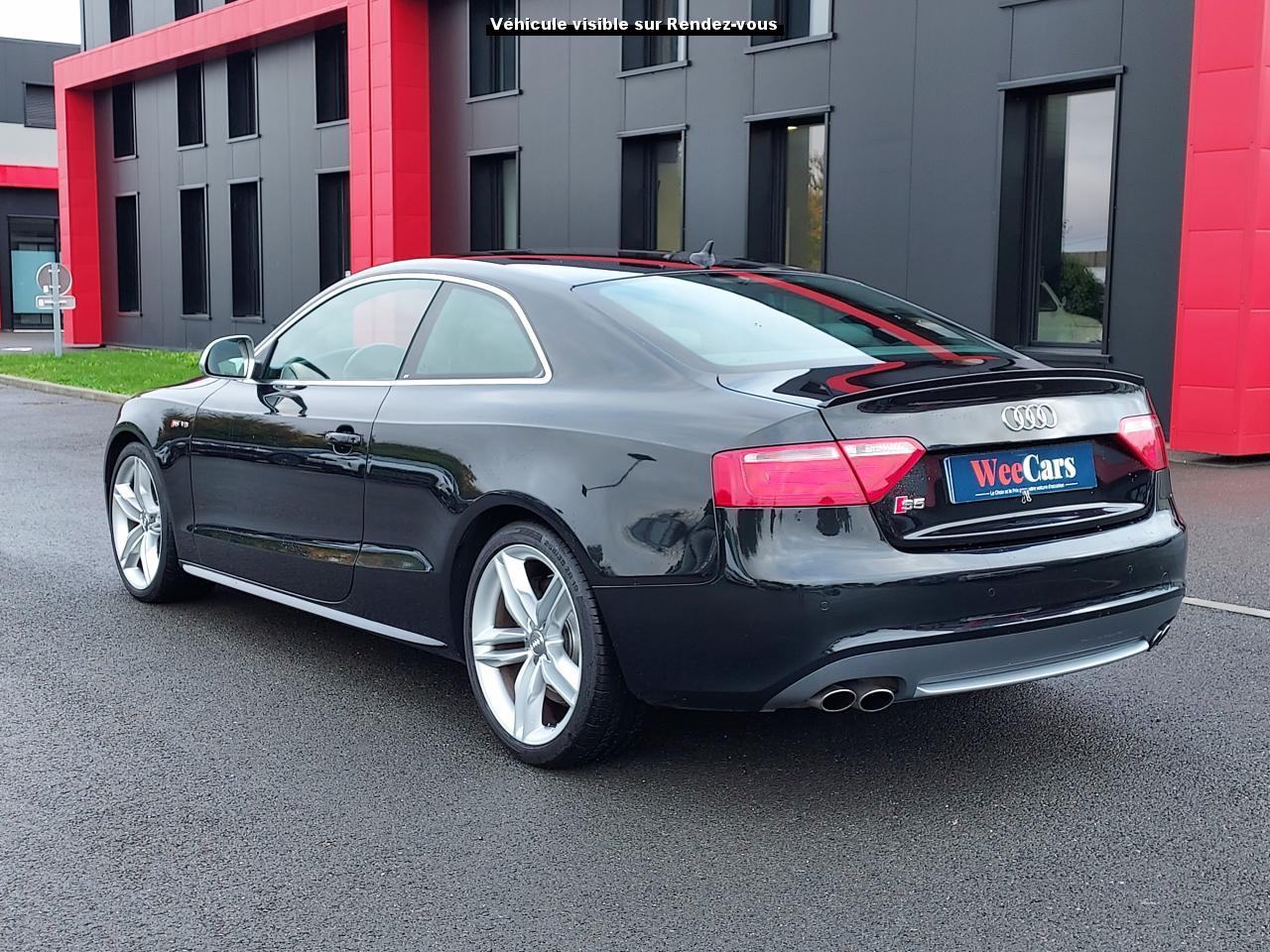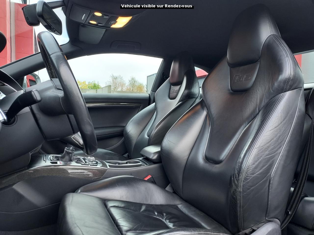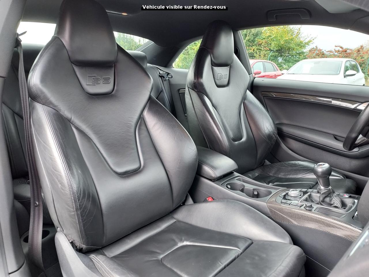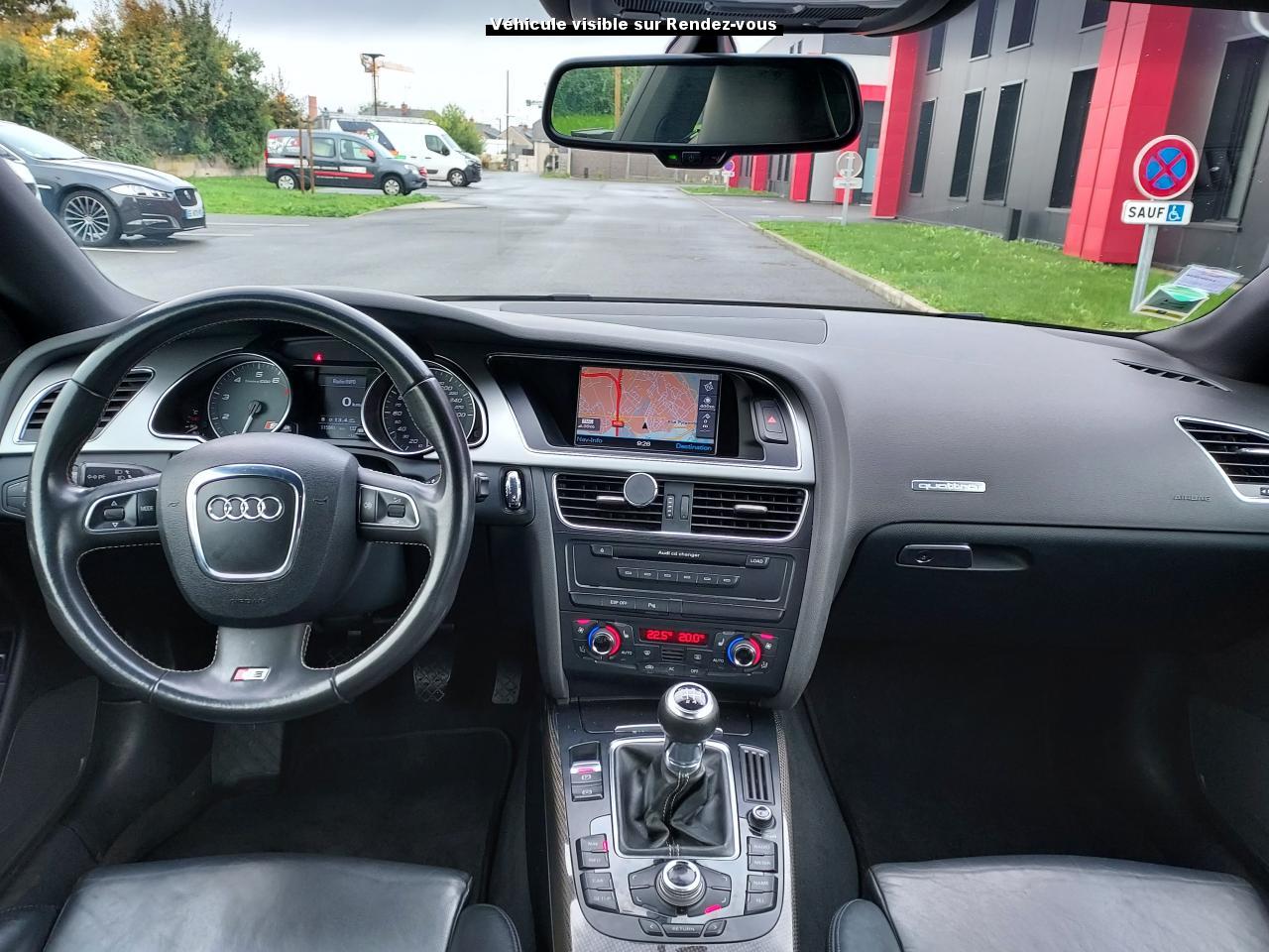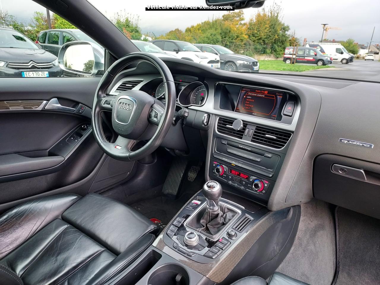 Accoudoir central avant avec vide-poches et 2 prises 12 VAccoudoir central dans le dossier des sièges arrière, rabattable ; compartiment avec trousse de secoursAirbags grand volume pour le conducteur et le passagerAirbags latéraux (airbag thorax et bassin à l'avant)Allume-cigareAntipatinage ASR : empêche le patinage des roues motrices ; assure une motricité optimaleAppuie-têtes, réglables à l'avant et à l'arrièreAudi Hold Assist : système désactivable maintenant le véhicule à l'arrêt en descente comme en côte; permet un redémarrage confortable sans mettre le frein à mainBlocage électronique de différentiel (EDS)Boîte manuelle 6 vitesses entièrement synchronisée, embrayage monodisque à sec commandé hydrauliquement avec garnitures sans amianteBuses de lave-glace chauffantesCarrosserie entièrement galvanisée contre la corrosionChâssis Sport spécifique S : suspension réglée pour un contact plus direct avec la route et un comportement sportifClimatisation automatique Confort Plus 3 zonesColonne de direction de sécuritéContact d'allumage électronique, clé de contact mémorisant différentes données d'entretienDétecteur de pluie et allumage automatique des projecteursDirection assistée ServotronicEclairage intérieur à extinction temporisée et contacteurs sur toutes les portièresFixation pour sièges enfants ISOFIX à l'arrièreFrein de stationnement electromécaniqueIndicateur de rapport de vitesse dans le système d'information du conducteur : apporte assistance au conducteur dans le choix du rapport de vitesse adaptéInstrumentation, avec éclairage réglable, compteur de vitesse électronique avec compteur kilométrique et compteur journalier, compte-tours, horloge, affichage de la température du liquide de refroidissement et jauge de carburantJantes en aluminium coulé style S 5 branches doubles, 8,5 J x 18”, avec pneus 245/40 R18Lave-glace, deux vitesses, 4 réglages d'intermittence, balayage coup par coup et lavage-balayage automatiqueLève-vitres électriques à l'avant avec protection antipincement, fonction ouverture/fermeture confort par impulsions ; vitres arrière fixesOuverture de coffre automatiquePack EclairagePorte-boissons sur la console centralePrétensionneurs des ceintures de sécurité avantPrétensionneurs et limiteurs d'effort des ceintures de sécurité à l'avantProgramme de stabilité électronique (ESP)Projecteurs antibrouillardProjecteurs au Xenon plusProtection antidémarrage électroniqueQuattro : transmission intégrale permanente avec répartition asymétrique et dynamique de coupleRadio Concert lecteur CD et lecteur cartes SD compatibles MP3, concept d'utilisation MMI, écran couleur de 6,5 pouces, fonction Memo-TP, GALA, phase diversifiéeRéglage d'appuis lombaires électriques sur 4 plans pour sièges avantRégulateur de vitesseRétroviseurs extérieurs électriques et dégivrantsRoue de secours temporaireSellerie cuirSièges Sport S à l'avant avec appuis-têtes intégrésSorties d'échappement : visible, à double flux, une sortie à gauche et une à droiteSystème acoustique d'aide au stationnement arrièreSystème antiblocage ABS avec répartiteur de freinage EBV, programme électronique de stabilisation ESP avec amplificateur hydraulique de freinage d'urgenceSystème antiblocage ABS avec répartiteur électronique de freinage EBVTélécommande à fréquence radio pour le verrouillage centraliséTransmission intégrale permanente quattroVerrouillage centralisé avec fonction Autolock et télécommande à fréquence radioVerrouillage électrique de la colonne de directionVolant réglable en hauteur et en profondeurVolant Sport multifonction en cuir style 3 branches avec emblème S5 et airbag grand volume