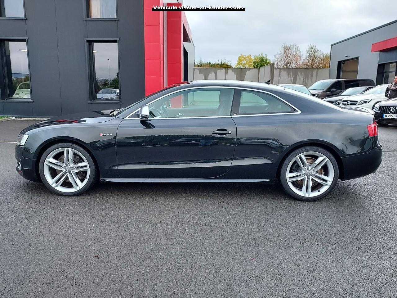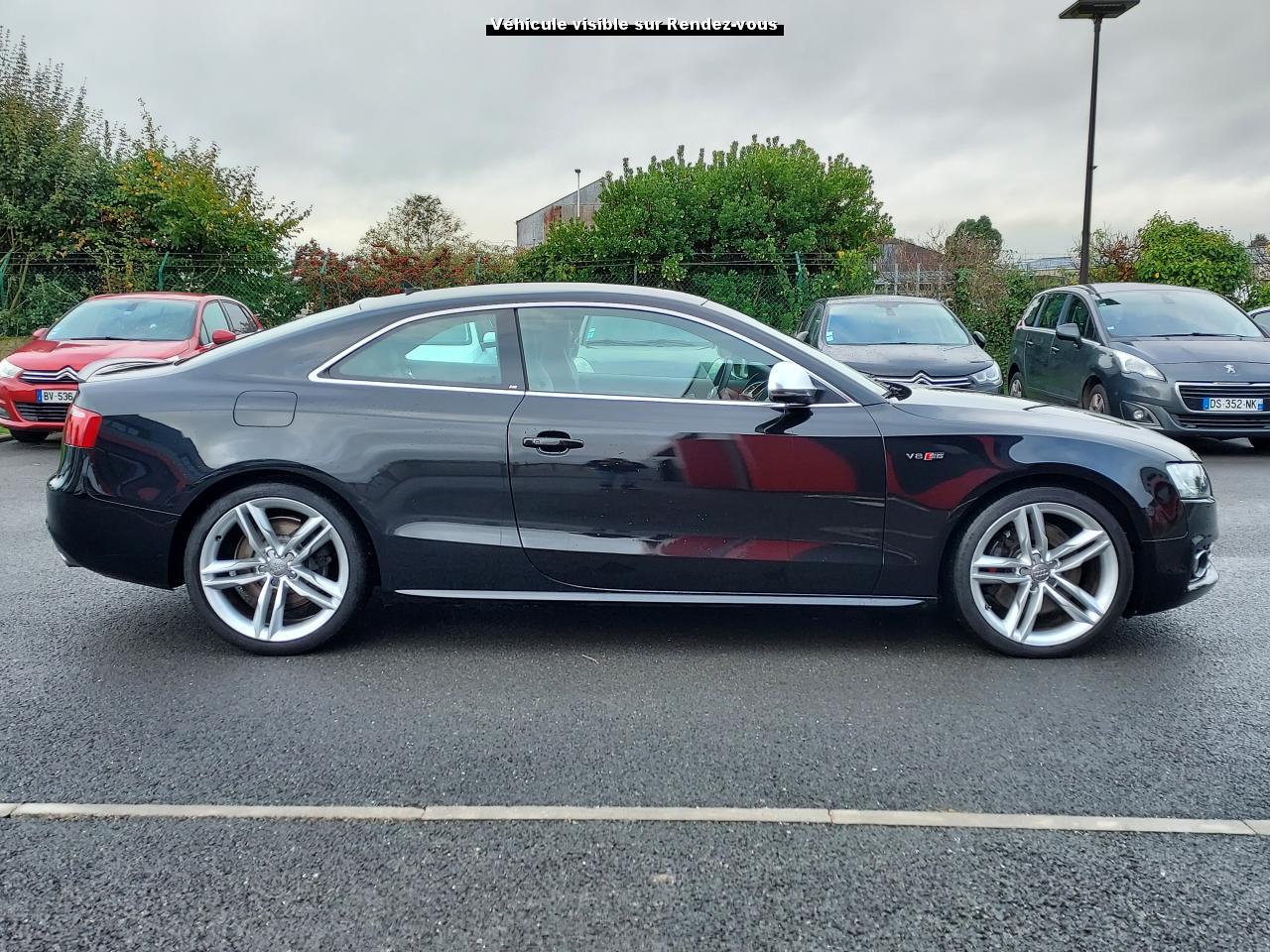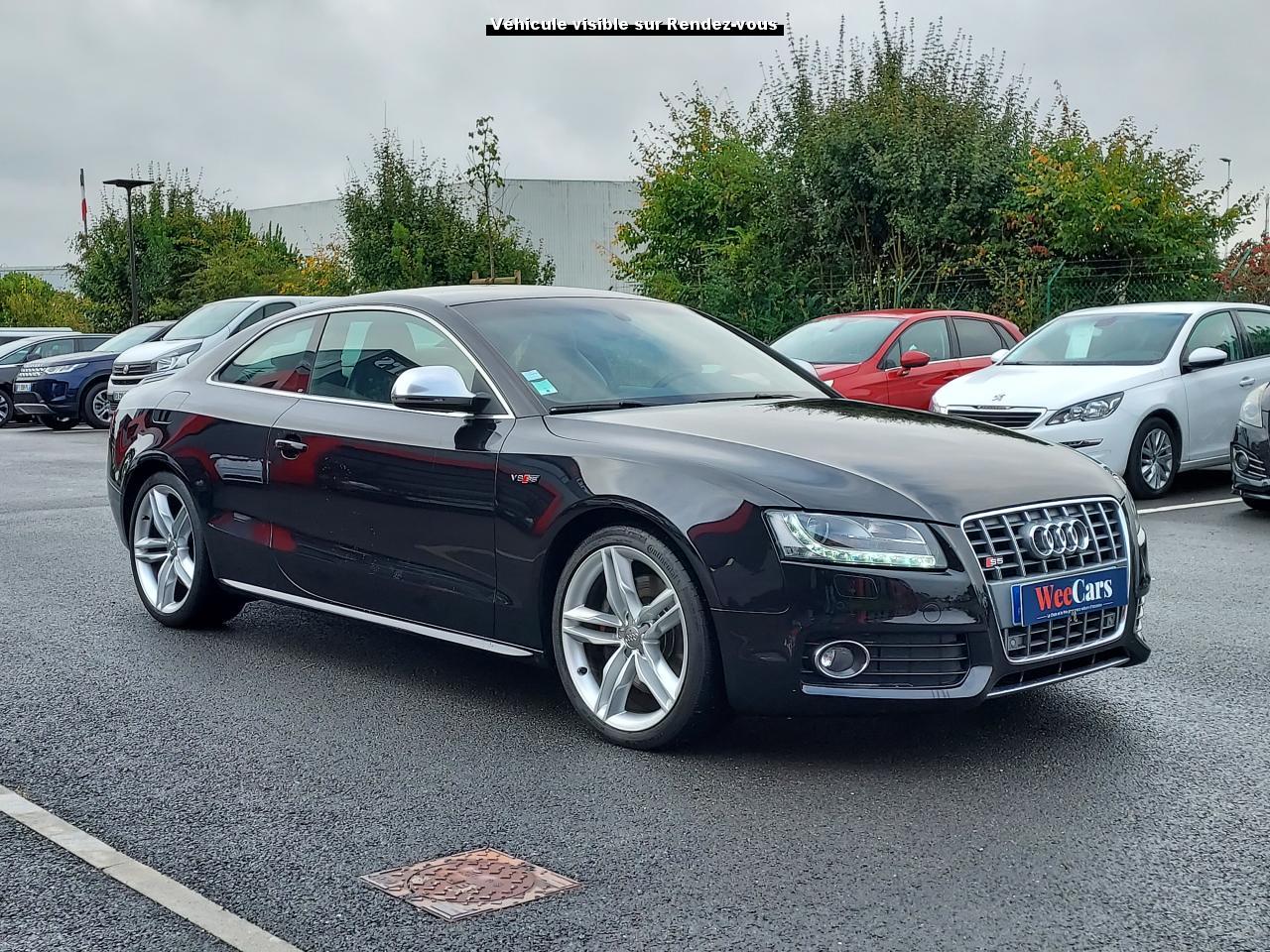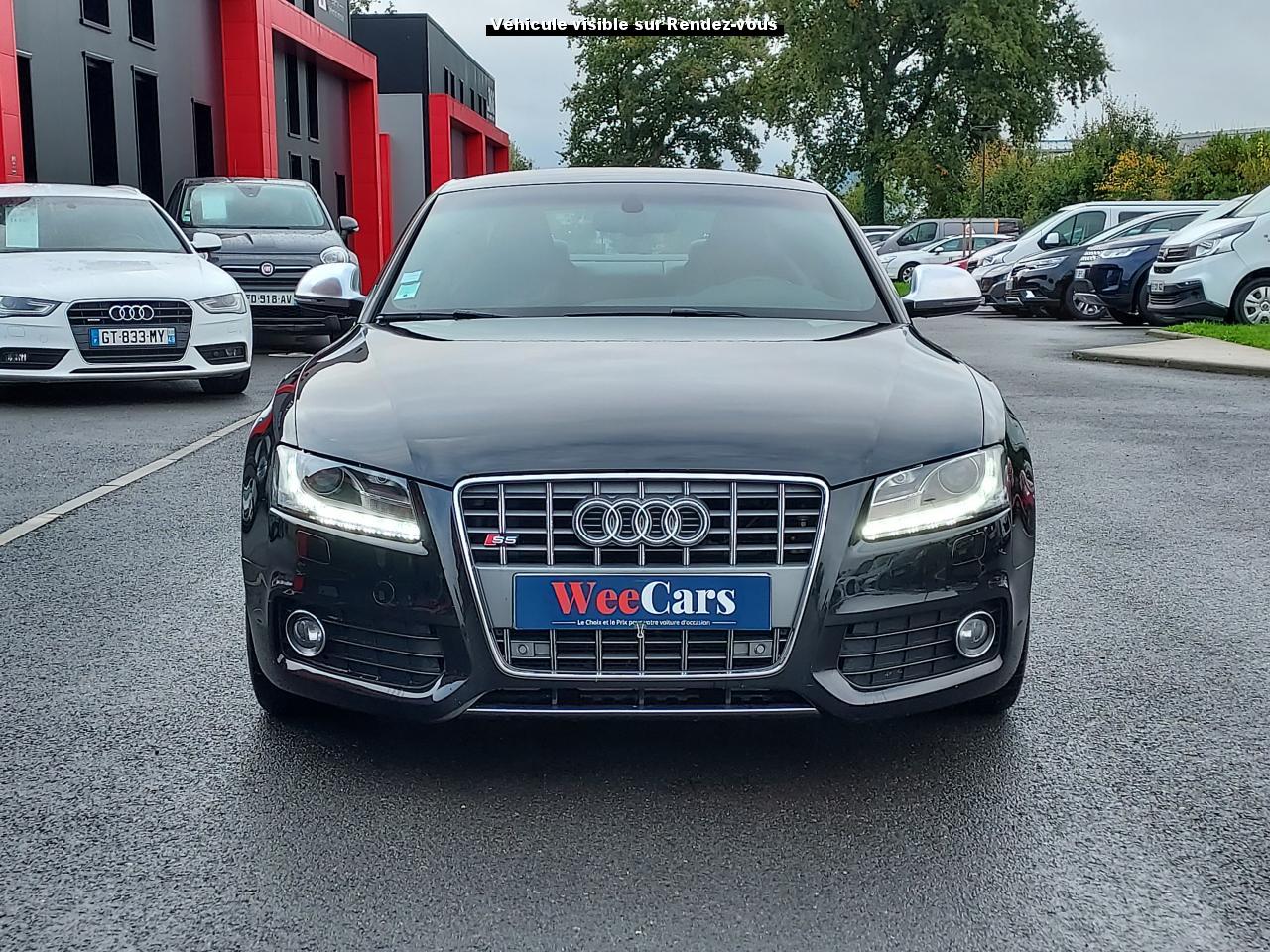 Accoudoir central avant avec vide-poches et 2 prises 12 VAccoudoir central dans le dossier des sièges arrière, rabattable ; compartiment avec trousse de secoursAirbags grand volume pour le conducteur et le passagerAirbags latéraux (airbag thorax et bassin à l'avant)Allume-cigareAntipatinage ASR : empêche le patinage des roues motrices ; assure une motricité optimaleAppuie-têtes, réglables à l'avant et à l'arrièreAudi Hold Assist : système désactivable maintenant le véhicule à l'arrêt en descente comme en côte; permet un redémarrage confortable sans mettre le frein à mainBlocage électronique de différentiel (EDS)Boîte manuelle 6 vitesses entièrement synchronisée, embrayage monodisque à sec commandé hydrauliquement avec garnitures sans amianteBuses de lave-glace chauffantesCarrosserie entièrement galvanisée contre la corrosionChâssis Sport spécifique S : suspension réglée pour un contact plus direct avec la route et un comportement sportifClimatisation automatique Confort Plus 3 zonesColonne de direction de sécuritéContact d'allumage électronique, clé de contact mémorisant différentes données d'entretienDétecteur de pluie et allumage automatique des projecteursDirection assistée ServotronicEclairage intérieur à extinction temporisée et contacteurs sur toutes les portièresFixation pour sièges enfants ISOFIX à l'arrièreFrein de stationnement electromécaniqueIndicateur de rapport de vitesse dans le système d'information du conducteur : apporte assistance au conducteur dans le choix du rapport de vitesse adaptéInstrumentation, avec éclairage réglable, compteur de vitesse électronique avec compteur kilométrique et compteur journalier, compte-tours, horloge, affichage de la température du liquide de refroidissement et jauge de carburantJantes en aluminium coulé style S 5 branches doubles, 8,5 J x 18”, avec pneus 245/40 R18Lave-glace, deux vitesses, 4 réglages d'intermittence, balayage coup par coup et lavage-balayage automatiqueLève-vitres électriques à l'avant avec protection antipincement, fonction ouverture/fermeture confort par impulsions ; vitres arrière fixesOuverture de coffre automatiquePack EclairagePorte-boissons sur la console centralePrétensionneurs des ceintures de sécurité avantPrétensionneurs et limiteurs d'effort des ceintures de sécurité à l'avantProgramme de stabilité électronique (ESP)Projecteurs antibrouillardProjecteurs au Xenon plusProtection antidémarrage électroniqueQuattro : transmission intégrale permanente avec répartition asymétrique et dynamique de coupleRadio Concert lecteur CD et lecteur cartes SD compatibles MP3, concept d'utilisation MMI, écran couleur de 6,5 pouces, fonction Memo-TP, GALA, phase diversifiéeRéglage d'appuis lombaires électriques sur 4 plans pour sièges avantRégulateur de vitesseRétroviseurs extérieurs électriques et dégivrantsRoue de secours temporaireSellerie cuirSièges Sport S à l'avant avec appuis-têtes intégrésSorties d'échappement : visible, à double flux, une sortie à gauche et une à droiteSystème acoustique d'aide au stationnement arrièreSystème antiblocage ABS avec répartiteur de freinage EBV, programme électronique de stabilisation ESP avec amplificateur hydraulique de freinage d'urgenceSystème antiblocage ABS avec répartiteur électronique de freinage EBVTélécommande à fréquence radio pour le verrouillage centraliséTransmission intégrale permanente quattroVerrouillage centralisé avec fonction Autolock et télécommande à fréquence radioVerrouillage électrique de la colonne de directionVolant réglable en hauteur et en profondeurVolant Sport multifonction en cuir style 3 branches avec emblème S5 et airbag grand volume