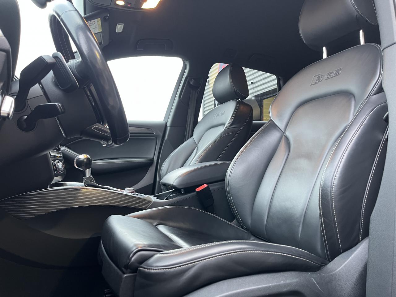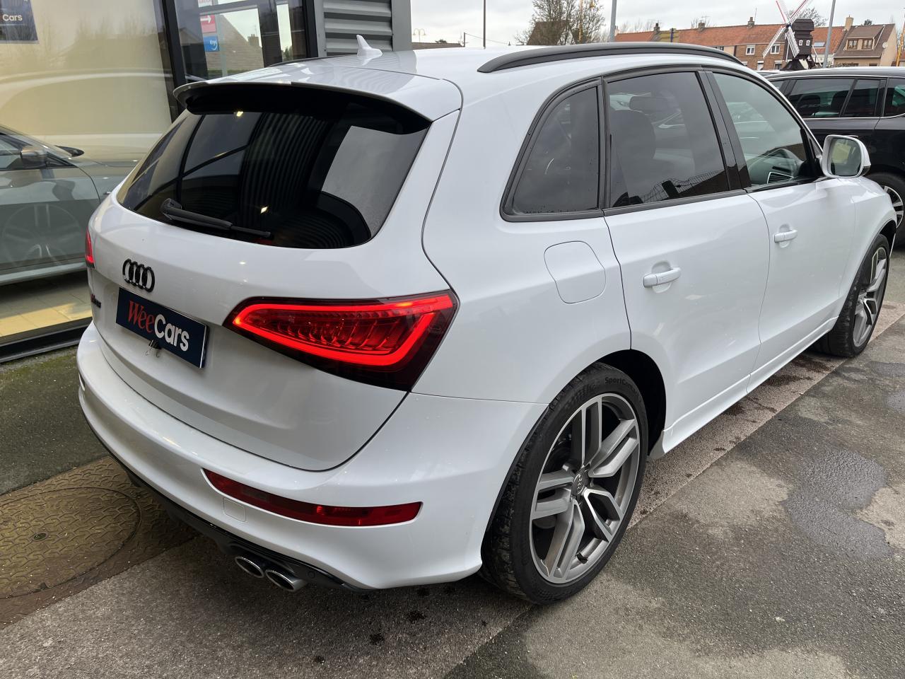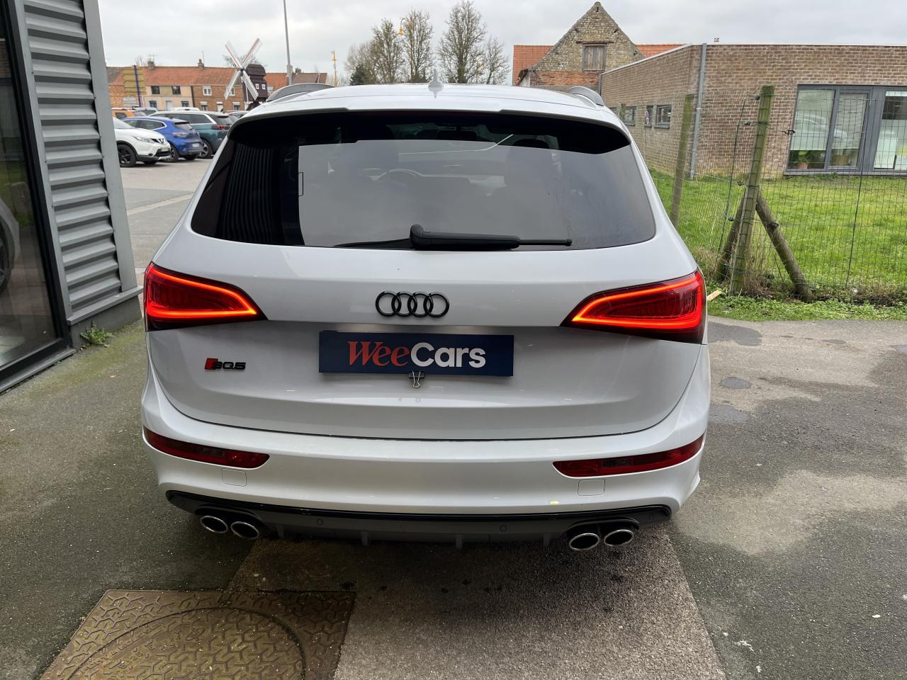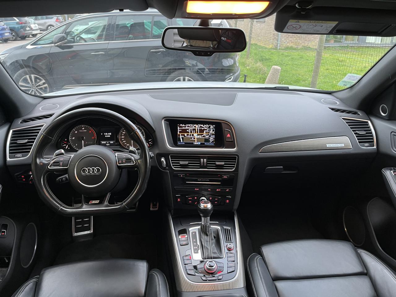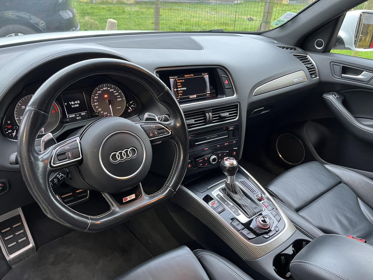 Accoudoir central à l'avant, pour conducteur et passager avant, coulissant en longueur de 65 mm, inclinaison réglable rabattable, avec vide-poches sous l'accoudoir central, incluant deux porte-boissons et prise de 12 V dans la console centraleAccoudoir central avant avec vide-poches et 2 prises 12 VAccoudoir central dans le dossier des sièges arrière, rabattableAdaptive Light : projecteurs directionnelsAdvanced Key : système d'autorisation d'accès et de démarrage main libreAirbag grand volume conducteur et le passager avant, détection de la position du siège, airbag adaptatif conducteur et passager avantAirbags latéraux (airbag thorax et bassin à l'avant)Antidémarrage électronique intégré à la commande du moteur ; activation automatique par la clé du véhiculeAntipatinage électronique ASRApplications décoratives en aluminium brossé matAppuie-tête, réglables à l'avant et à l'arrièreAssistance au freinage d'urgence, amplificateurs de freins en tandemAudi BackguardAudi connect (inclut GPS Advanced et préparation téléphone 8W)Audi Hold AssistAudi Music InterfaceAudi Sound System (180 W)Audi Tracking SystemAvertisseur de freinage d'urgence et fonction de séchage de disques de freins automatiqueAvertisseur deux tons sur le moyeu du volantBadges “V6T” sur les ailes avant et emblème “SQ5” sur les étriers de freinsBanquette arrière rabattable 60/40, déverrouillage à distance des dossiers via un levier dans la garniture latérale du coffreBecquet de pavillonBoîte à gants éclairéeCarrosserie galvanisée: autoportante, soudée au groupe-plancher, zones de déformation définies à l'avant et à l'arrièreCeintures de sécurité : ceintures trois points à enrouleur pour tous les sièges, avec contrôle du port à l'avant, assorties à la couleur de l'habitacleCendrier dans la console centrale à l'avant et à l'arrière, allume-cigare à l'avantCendrier éclairé à l'avantChâssis DynamiqueClimatisation automatique confort 3 zonesCoffre et hayon éclairésColonne de direction de sécuritéConsole centrale, surélevée, avec compartiment de rangement et volet roulantContact d'allumage électroniqueContrôle de pression des pneus ( TPMS )Contrôle électronique de stabilisation (ESC) avec détection de barres de toit et mode offroadDétecteur de pluie et de luminosité incluant rétroviseur intérieur jour/nuit automatiqueDéverrouillage de coffre par touche douce : déverrouillage avec assistance électriqueDirection assistée électromécanique, direction à crémaillère sans entretien avec asistance asservie à la vitesseEclairage intérieur, à temporisation avec contacteur sur toutes les portièresEcran central avec affichage en couleurEcrous antivolEssuie-glace arrière avec déclenchement automatique en marche arrièreEssuie-glace deux vitesses : réglage d'intermittence sur 4 niveaux, commande de balayage coup par coup, lavage-balayage automatiqueÉtui à lunettes, dans le module d'éclairage intérieur avant, au-dessus du rétroviseur intérieurFeux arrière, rouges, avec feux de recul blancs, feux arrière de brouillard intégrés, avec capot de coffre ouvert : fonction feux arrière dans le bandeau d'éclairage du pare-chocsFeux de route assistés : gestion automatique du passage de feux de croisement à pleins phares et inversementFilet de séparation, vertical, amovibleFrein de stationnement electromécaniqueHayon assisté électriquement pour l'ouverture et la fermetureIdentification du modèle à l'arrière, inscription “SQ5” à l'arrière, sur la calandre et sur l'embase du volantIndicateur de rapport de vitesse dans le système d'information du conducteurIndication de l'usure des garnitures de freins à l'avant ; affichage sur l'écran centralInstrumentation, avec éclairage réglable : tachymètre électronique avec compteur kilométrique totalisateur et journalier, compte-tours, heure, affichage de la température du liquide de refroidissement et de la réserve de carburantJantes en aluminium coulé style 5 branches double S, 8,5 J x 20” avec pneus 255/45 R20 100WLampe à l'avant avec deux spots de lecture supplémentairesLampes à l'arrière avec fonction spots de lectureLève-vitres électriques à l'avant et à l'arrière avec protection antipincement et fonction ouverture/fermeture Confort par impulsionLimiteurs d'effort sur les ceintures de sécurité avantLunette arrière dégivrante avec minuterieMiroir de courtoisieOEilletons de fixation, quatre oeilletons dans le coffre pour arrimer le chargementOrdinateur de bord couleur, système de contrôle Autocheck et programme efficiencyOutillage de bord dans le coffrePack Aluminium extérieurPack Éclairage intérieurPack RangementPare-soleil, rabattables et pivotants, côté conducteur et passager avantParking System Plus avec caméra de reculPeinture intégrale : pare-chocs avant et arrière et bas de caisse en couleur carrosseriePhares antibrouillard intégrés dans le bouclier avantPoignées de maintien avec mécanisme amortisseur : quatre poignées encastrées dans le ciel de pavillonPoignées de portes couleur carrosseriePorte-boissons double dans la console centralePréparation pour crochet d'attelagePréparation pour siège enfant ISOFIX pour sièges latéraux arrièrePrétensionneurs des ceintures de sécurité avantProjecteurs antibrouillardProjecteurs Xénon Plus incluant lave-phares, feux de jour à LEDQuattro, transmission intégrale permanente avec répartition asymétrique et dynamique de couple, différentiel central autobloquant, blocage électronique de différentiel EDS par intervention sur les freins des roues motricesRampes de pavillon en aluminium poli incluant barres de toit transversalesRégulateur de vitesseRéservoir avec protection contre les erreurs de ravitaillementRétroviseurs extérieurs : avec clignotants à diodes intégrés, réglables et rabattable électriquement, dégivrants avec coques laquées dans la couleur de carrosserie, miroir asphéri