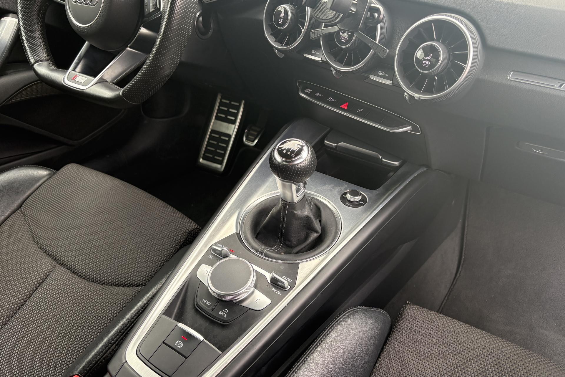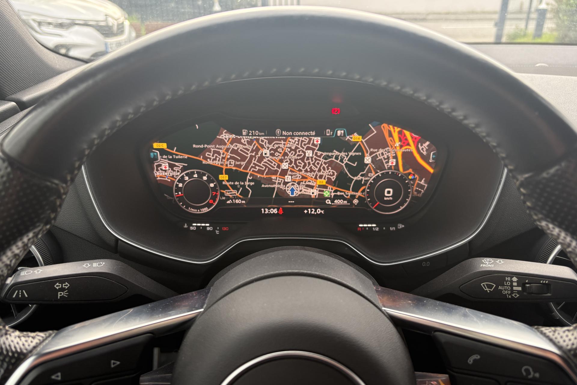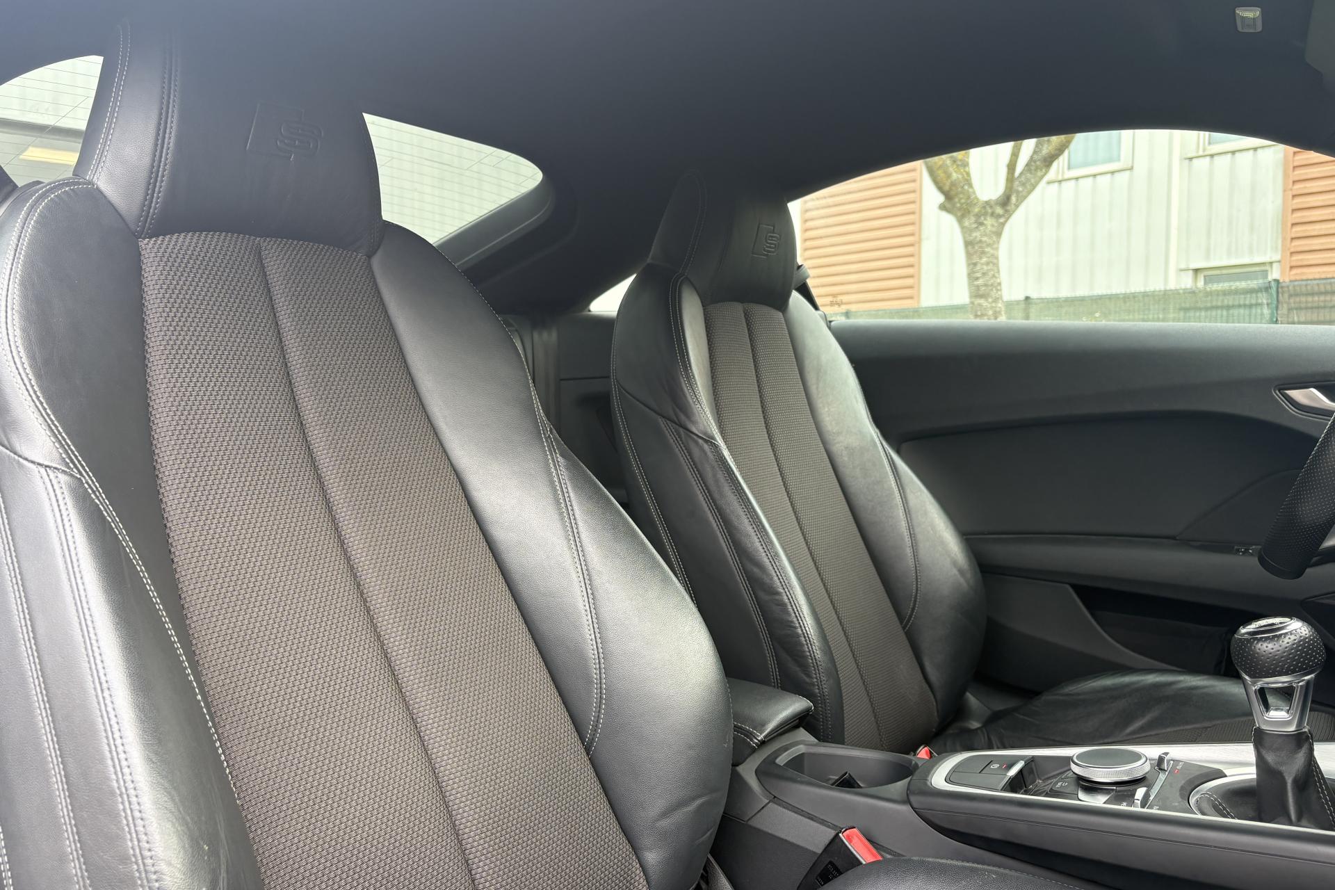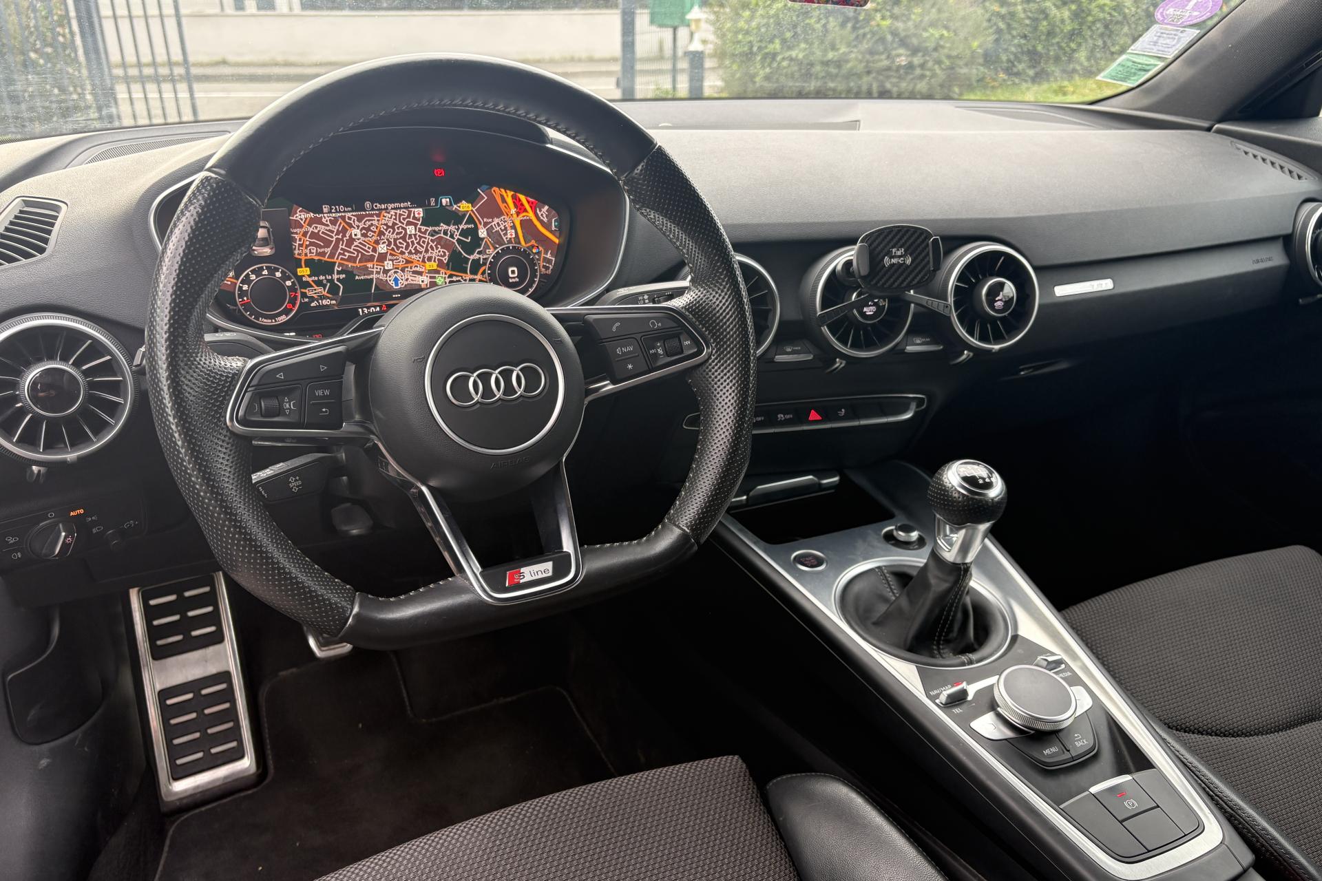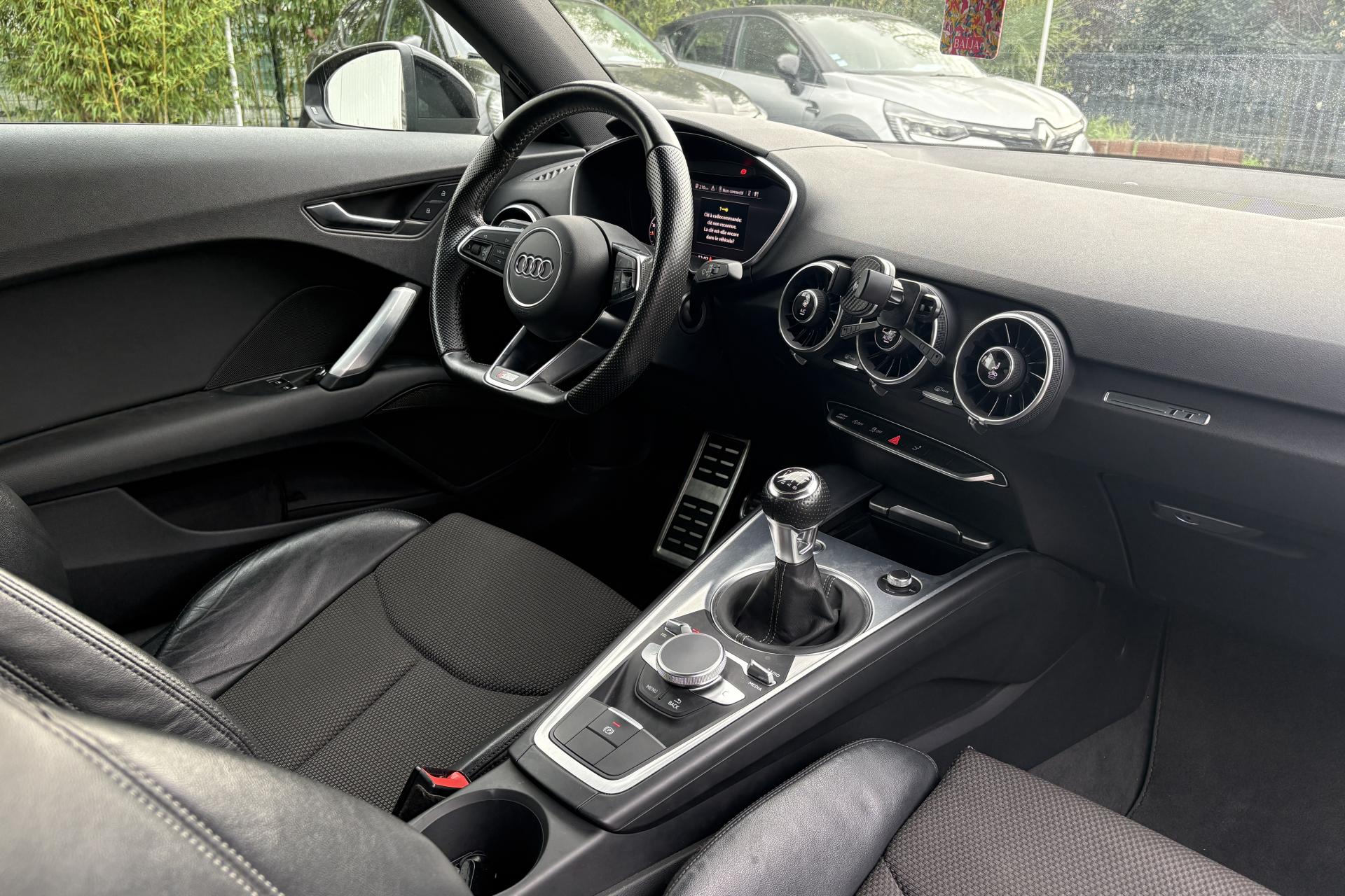 Accès à la commande vocale du SmartphoneAffichage du contrôle de la pression des pneumatiquesAileron arrière, télescopique, commande automatique ou manuelle par bouton à partir de 120 km/hAirbags latéraux à l'avant, avec airbags de têteAirbags, grand volume pour conducteur et passager avant ainsi qu'airbag de genoux côté conducteurApplications décoratives en aluminium brossé matAppui lombaire à 4 axes avec réglage électrique, pour les sièges conducteur et passager avant, réglage horizontal et verticalASR : antipatinageAssistant de freinage en cas de collision, en cas d'accidentAudi Active Lane AssistAudi Drive SelectAudi Music InterfaceAudi parking system à l'arrièreAudi Singleframe, encadrement chromé de la calandre gris pierreAudi virtual cockpit, combiné d'instruments de 12,3 pouces, innovant, entièrement numérique, pour un affichage fonctionnel des informations. Commande de l'Audi virtual cockpit via le volant multifonction et le système MMICache-bagagesCarrosserie à architecture Audi Space Frame (ASF)Ceintures de sécurité : ceintures trois points à enrouleur à toutes les places, avec prétensionneurs et limiteurs de tension à l'avantChâssis avec réglage sportifChâssis Sport S line avec réglage plus dynamique des ressorts et des amortisseurs, surbaissé de 10 mmCiel de pavillon en tissu gris rocheClé à fréquence radio, verrouille et déverrouille les portes, le capot de coffre et la trappe à carburant ; incluant ouverture/fermeture confort des vitres ; démarrage et arrêt du moteur par touche moteur Start/StopClimatisation automatique "Confort"Colonne de direction de sécurité, complète le potentiel de protection de la ceinture et de l'airbag ; réglable mécaniquement en hauteur et en profondeurConsole centraleContrôle électronique de stabilisation (ESC) avec blocage transversal électroniqueDirection assistée électromécaniqueDirection progressiveEclairage intérieur, éclairage anti-éblouissant de l'intérieur du véhicule à LEDEDS : blocage électronique de différentielEmblême S line sur les ailes avantFeux arrière à LED, Avec feux de recul et feux arrière de brouillard intégrésFeux de freinage adaptatifsFixation pour sièges enfants ISOFIX à l'arrièreFonction audiostreamingFrein de stationnement electromécaniqueHabitacle et tableau de bord et ciel de pavillon en noirIdentification du modèleInterface BluetoothJantes en aluminium coulé style 10 branches en V partiellement polies, 8,5 J x 18 avec pneus 245/40 R 18"Kit de réparation de pneusLave-essuie-glaceLecteur de carte SDXC supplémentaireLunette arrière dégivranteMMI RadioMoulures de seuil avec inscription S lineNavigation MMI plus avec MMI touchOeilletons de fixation dans le coffreOutillage de bordPack aluminium étenduPare-soleil rabattables et pivotants côtés conducteur et passager avant, avec miroir de courtoisie éclairé et occultablePommeau du levier/sélecteur de vitesses en cuir perforé noirPrise 12 volts sur la console centrale avantProtection antidémarrage électroniqueRégulateur de vitesseRétroviseur intérieur électrochromeRétroviseurs extérieurs électriques avec clignotants à LED intégrés, dégivrants et rabattables électriquementRétroviseurs extérieurs électriques, escamotables et dégivrants, buses de lave-glaces chauffantesRétroviseurs extérieurs avec clignotants à LED intégrés réglables électriquement avec miroir asphérique à gauche, convexe à droite; escamotables électriquement et dégivrantsRecherche MMI, intelligente et complète par saisie de texte dans les menus Navigation, Téléphone, Radio, Médias et Véhicule ; accès direct via la fonction joystick du bouton poussoir (vers le haut)Recommandation de repos qui analyse le comportement routier au moyen de différents capteursSellerie S line en tissu Séquence/cuir en noir avec estampillage S sur le dossier des sièges avantSièges avant réglables en hauteurSièges Sport à l'avant incluant appui lombaire à 4 axes réglable électriquementSortie d'échappement double chroméeStyle aluminium étendu à l'intérieur avec pédalier et repose-pied en acier inoxydableSystème antiblocage ABS avec répartiteur électronique de freinage EBVSystème d'appuie-tête intégralSystème de freinage à double circuit en diagonaleSystème Start/ Stop avec récupération d'énergie de freinageTapis complémentaires à l'avantTrappe à carburant style aluminium design caractéristique avec estampillage TT et vis apparentesTriangle de pré-signalisationTrousse de secoursVide-poches dans les contre-portes/garnitures latérales et sur la console centraleVitres athermiques teintées vertesVolant Sport S line en cuir avec multifonction style 3 branches aplati en bas, en noir (poignées de volant en cuir perforé) avec surpiqûres contrastées et emblème S lineVolant Sport TT contour en cuir avec multifonction plus style 3 branches, aplati en basXénon Plus