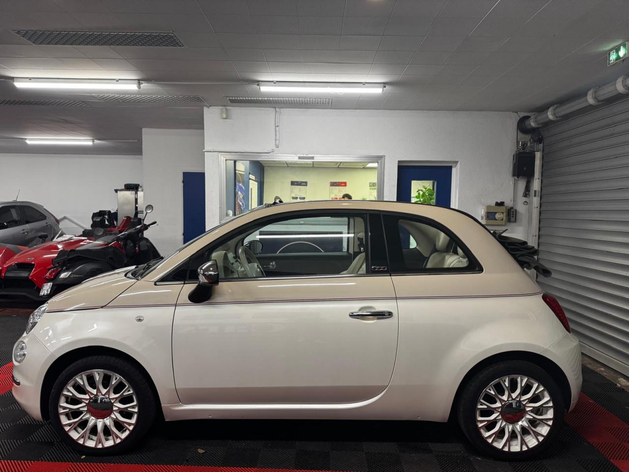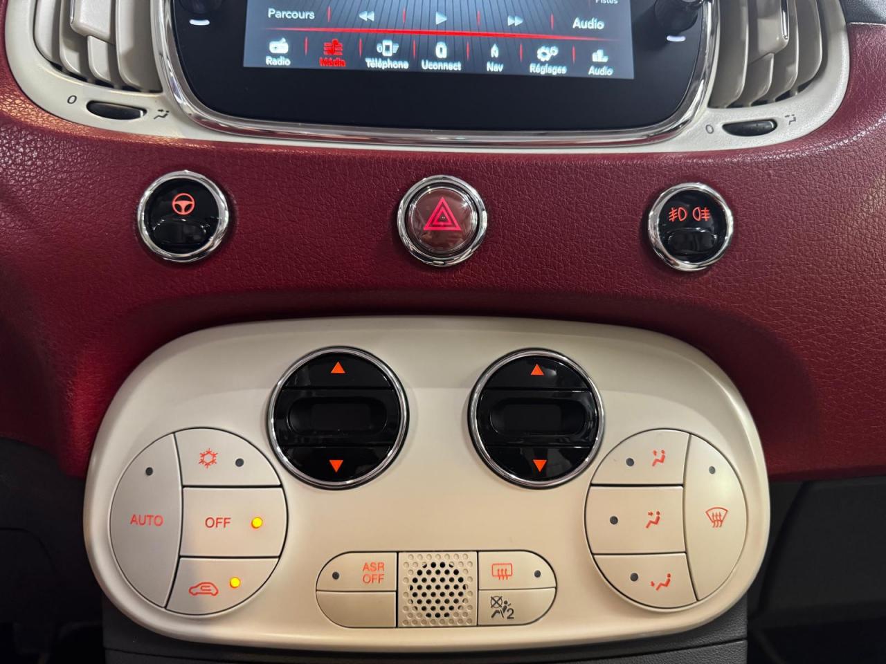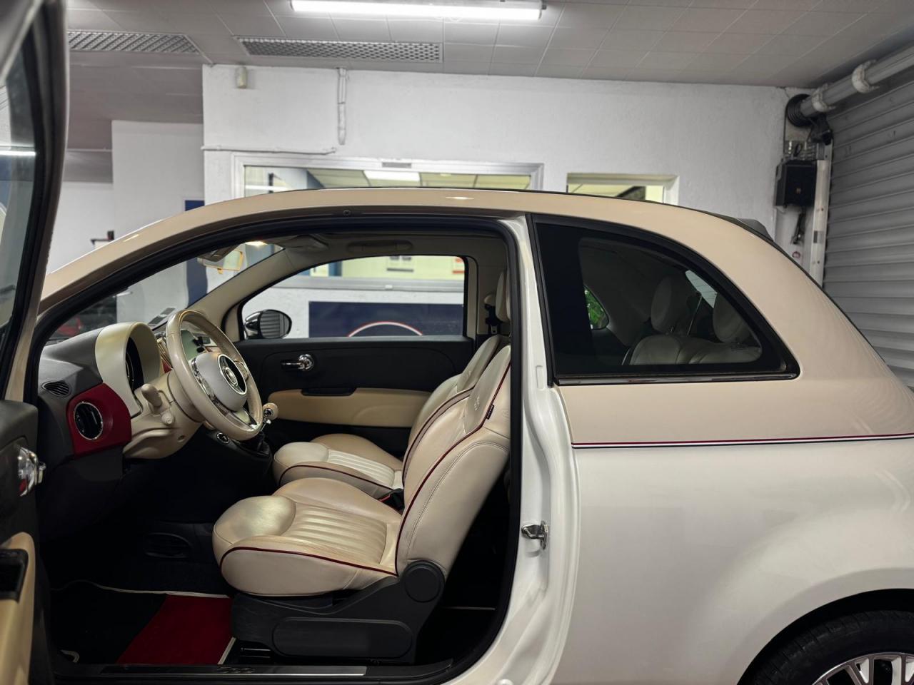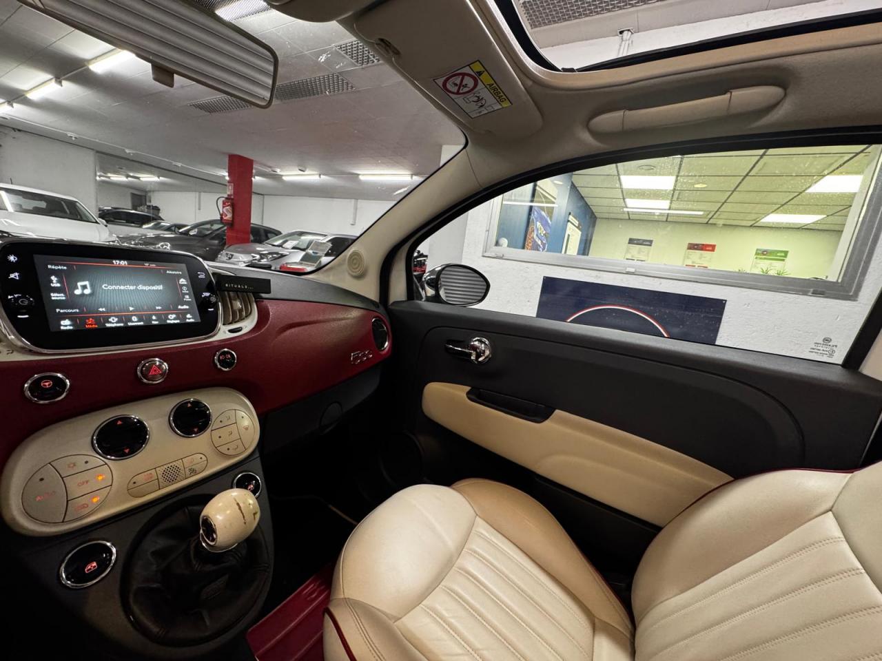 ABS – antiblocage des roues avec répartiteur de freinage EBDAir conditionné avec filtre à pollenAirbag Fiat de genouxAirbags fiat conducteur et passagerAirbags Fiat de toitAirbags Fiat latéraux avantAppuie-tête à l'avant, réglables en hauteurAssistance au freinage d'urgenceAttaches IsofixBanquette arrière fractionnable 50/50Banquette arrière rabattable avec appui-têteCondamnation automatique des ouvrants en roulantCondamnation centralisée à distanceDirection assistée Dualdrive avec fonction"City"Dispositif d'éclairage ‘'Follow me home''Eclairage du coffreESP - contrôle électronique de stabilité avec “Hill Holder"Feux de jour à LEDJantes en alliage "Vintage" de 16” blanches et chromeKit ChromeLimiteur de vitesseLogo « Anniversario » sur la malle arrièreLogo Vintage (à l’avant, sur le hayon et sur le volant)Moulure chromée sur capotPare-chocs couleur carrosseriePeinture pastel extra-sériePoignée de maintien intérieureProjecteurs antibrouillardRadar de reculRégulateur de vitesseRétroviseurs chromésRétroviseurs extérieurs réglables électriquement et dégivrants avec sonde de températureSellerie Tissu gris/ivoire avec accents Orange ou Vert et Logo 500 grisSiège conducteur réglable en hauteurSièges à rayures horizontales Style années 60 avec Passepoil et Logo 500 brodéTapis de sol avec logo « Anniversario »Toit vitré panoramique fixe avec pare-soleilUconnect Radio 5" LIVE (Dual Tuner/USB/AUX/Bluetooth)Vitres avant électriquesVolant Gainé de cuir avec commandes audioVolant réglable en hauteur