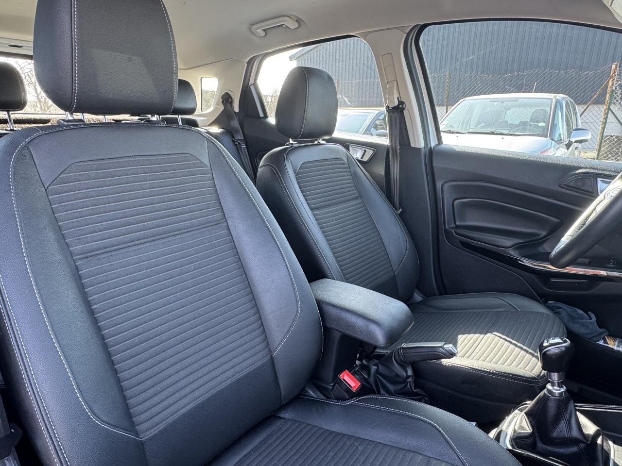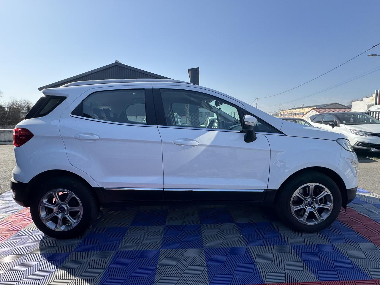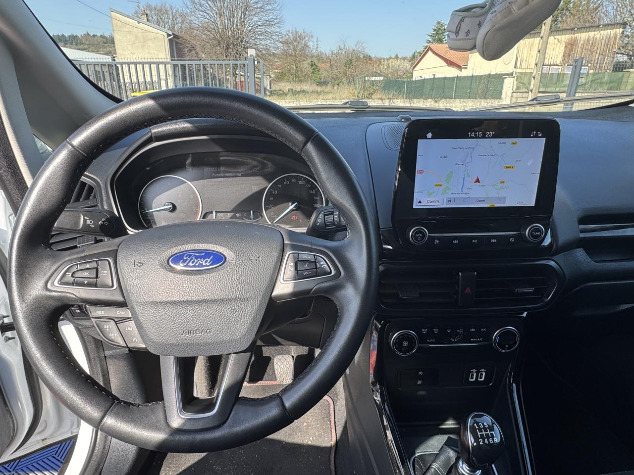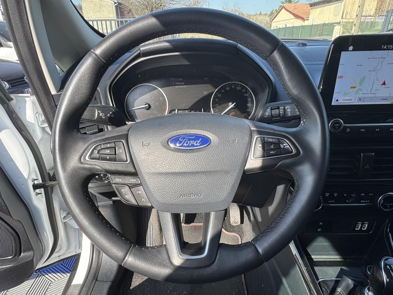 2 Prises USB3 appuie-tête arrièreAide au stationnement arrièreAirbag genoux conducteurAirbags frontaux, latéraux (thorax) et rideauxAlarme périmétriqueBanquette arrière rabattable 40/60Barres de toit façon aluminiumBavettes de protection avant & arrièreBoîte à gants éclairéeCalandre avec barres façon chromeChauffage auxiliaireClimatisation automatiqueConsole centrale avec accoudoir coulissant et porte gobeletDirection assistée électriqueEclairage d'ambiance intérieurESP + HLA (aide au démarrage en côte)Essuie-glaces avant automatique avec détecteur de pluie et allumage automatique des feuxFeux de jour à LEDJantes alliage 16''Kit de réparationLèche-vitres chromésLève-vitres avant électriques à impulsion côté passagerOrdinateur de bord avec écran couleur 4,2"Pack 8'' NAVPare-brise acoustiquePare-chocs couleur carrosseriePlancher de coffre ajustablePlaques de seuils de portes avant EcosportPoignées de portes couleur carrosseriePrises 12V (console centrale avant et console centrale à l'arrière)Projecteurs antibrouillardRégulateur et limiteur de vitesseRétroviseurs extérieurs couleur carrosserie, chauffants et réglables électriquement avec rappels de clignotants intégrésRétroviseurs extérieurs rabattables électriquementSellerie cuir / tissuSiège conducteur réglable en hauteur avec réglage lombaireSystème de démarrage sans cléSystème de surveillance de pression des pneusSystème MyKey (seconde clé programmable)Tapis de sol avant et arrière PremiumTrappes à carburant sans bouchon Ford Easy FuelVitres avant et arrière électriques avec descente/remonté à impulsion côté conducteurVolant, pommeau de levier de vitesses et frein à main gainés cuir