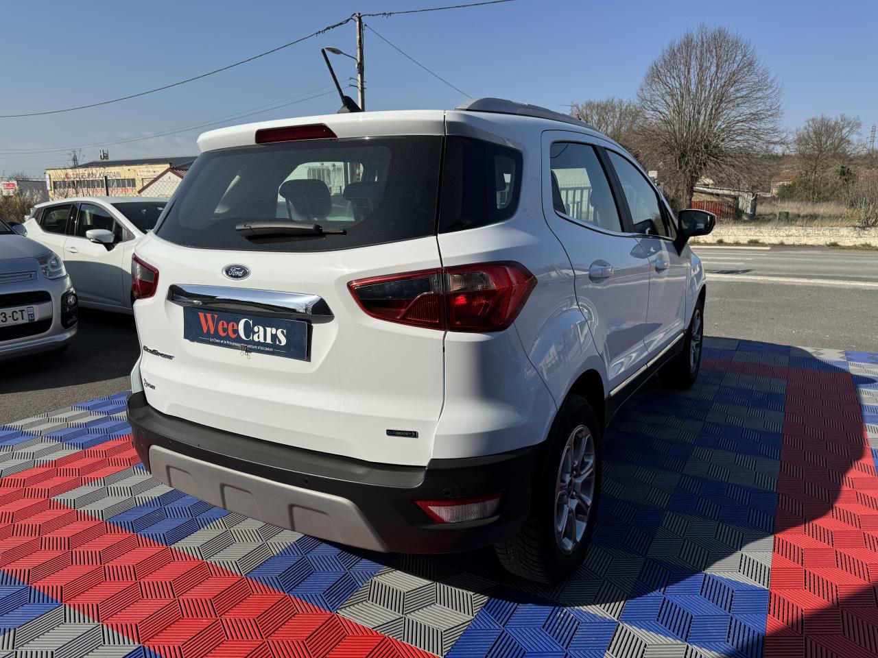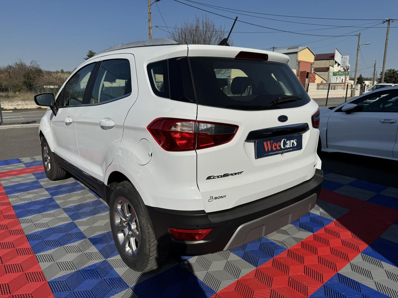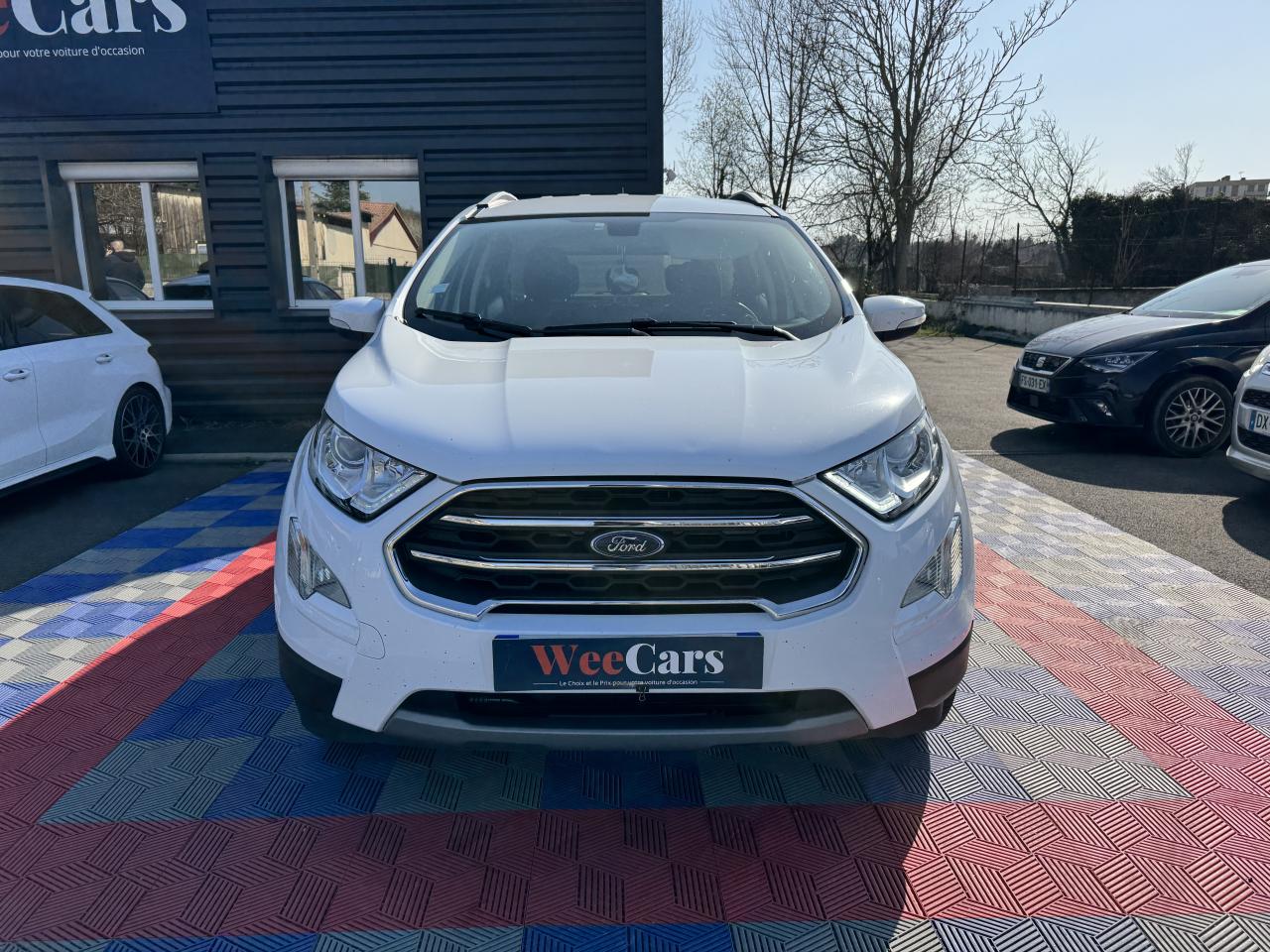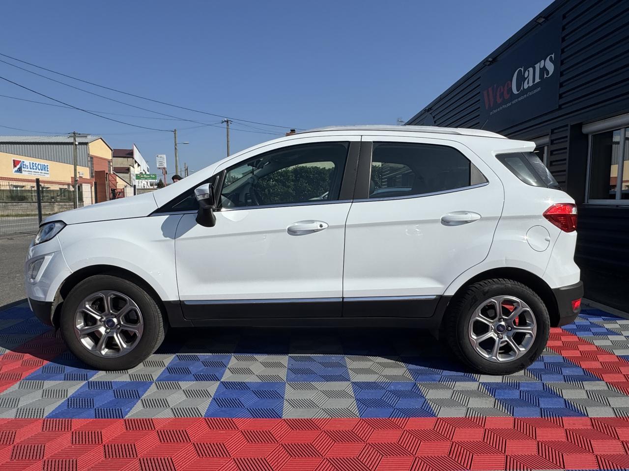 2 Prises USB3 appuie-tête arrièreAide au stationnement arrièreAirbag genoux conducteurAirbags frontaux, latéraux (thorax) et rideauxAlarme périmétriqueBanquette arrière rabattable 40/60Barres de toit façon aluminiumBavettes de protection avant & arrièreBoîte à gants éclairéeCalandre avec barres façon chromeChauffage auxiliaireClimatisation automatiqueConsole centrale avec accoudoir coulissant et porte gobeletDirection assistée électriqueEclairage d'ambiance intérieurESP + HLA (aide au démarrage en côte)Essuie-glaces avant automatique avec détecteur de pluie et allumage automatique des feuxFeux de jour à LEDJantes alliage 16''Kit de réparationLèche-vitres chromésLève-vitres avant électriques à impulsion côté passagerOrdinateur de bord avec écran couleur 4,2"Pack 8'' NAVPare-brise acoustiquePare-chocs couleur carrosseriePlancher de coffre ajustablePlaques de seuils de portes avant EcosportPoignées de portes couleur carrosseriePrises 12V (console centrale avant et console centrale à l'arrière)Projecteurs antibrouillardRégulateur et limiteur de vitesseRétroviseurs extérieurs couleur carrosserie, chauffants et réglables électriquement avec rappels de clignotants intégrésRétroviseurs extérieurs rabattables électriquementSellerie cuir / tissuSiège conducteur réglable en hauteur avec réglage lombaireSystème de démarrage sans cléSystème de surveillance de pression des pneusSystème MyKey (seconde clé programmable)Tapis de sol avant et arrière PremiumTrappes à carburant sans bouchon Ford Easy FuelVitres avant et arrière électriques avec descente/remonté à impulsion côté conducteurVolant, pommeau de levier de vitesses et frein à main gainés cuir