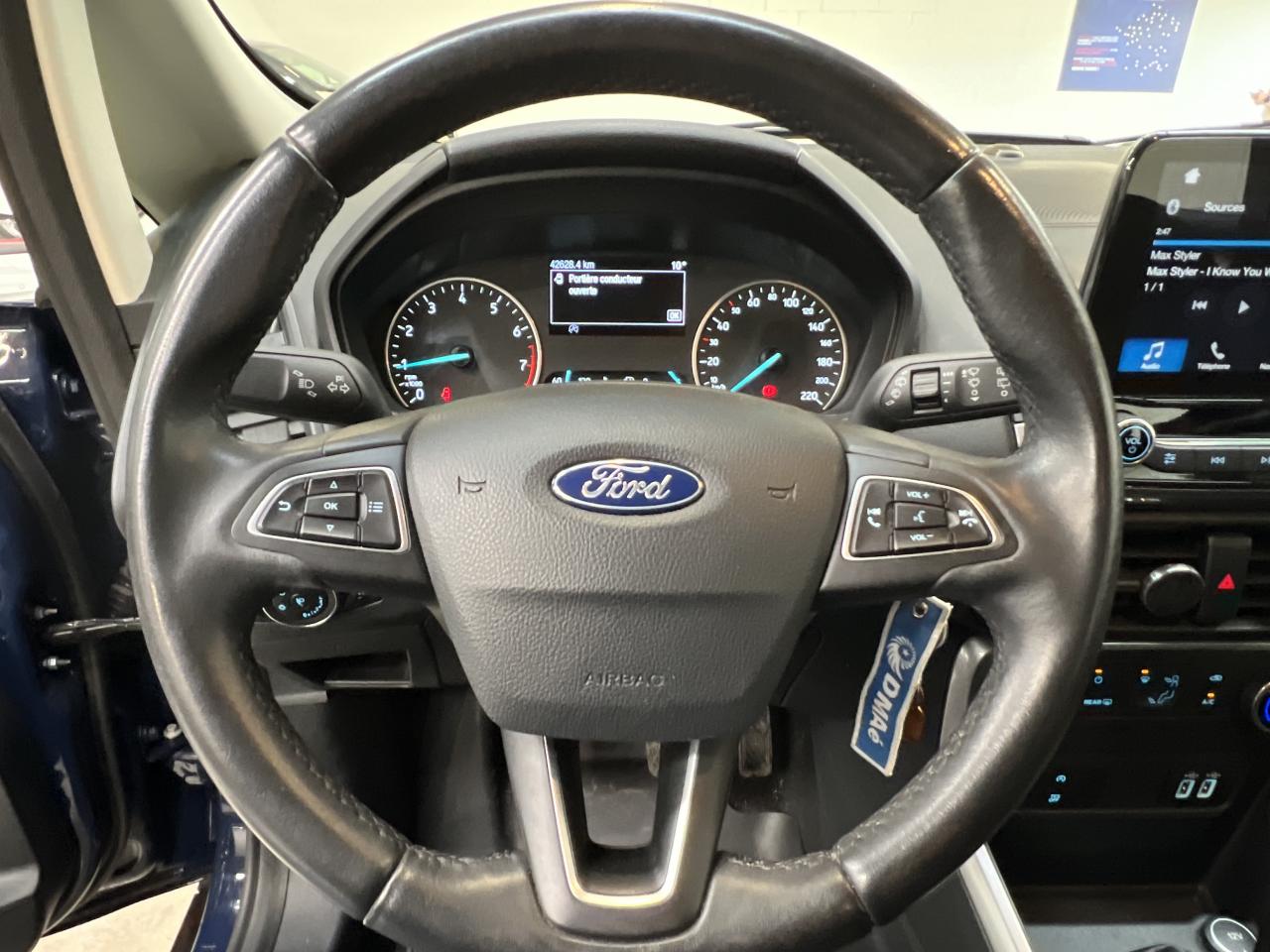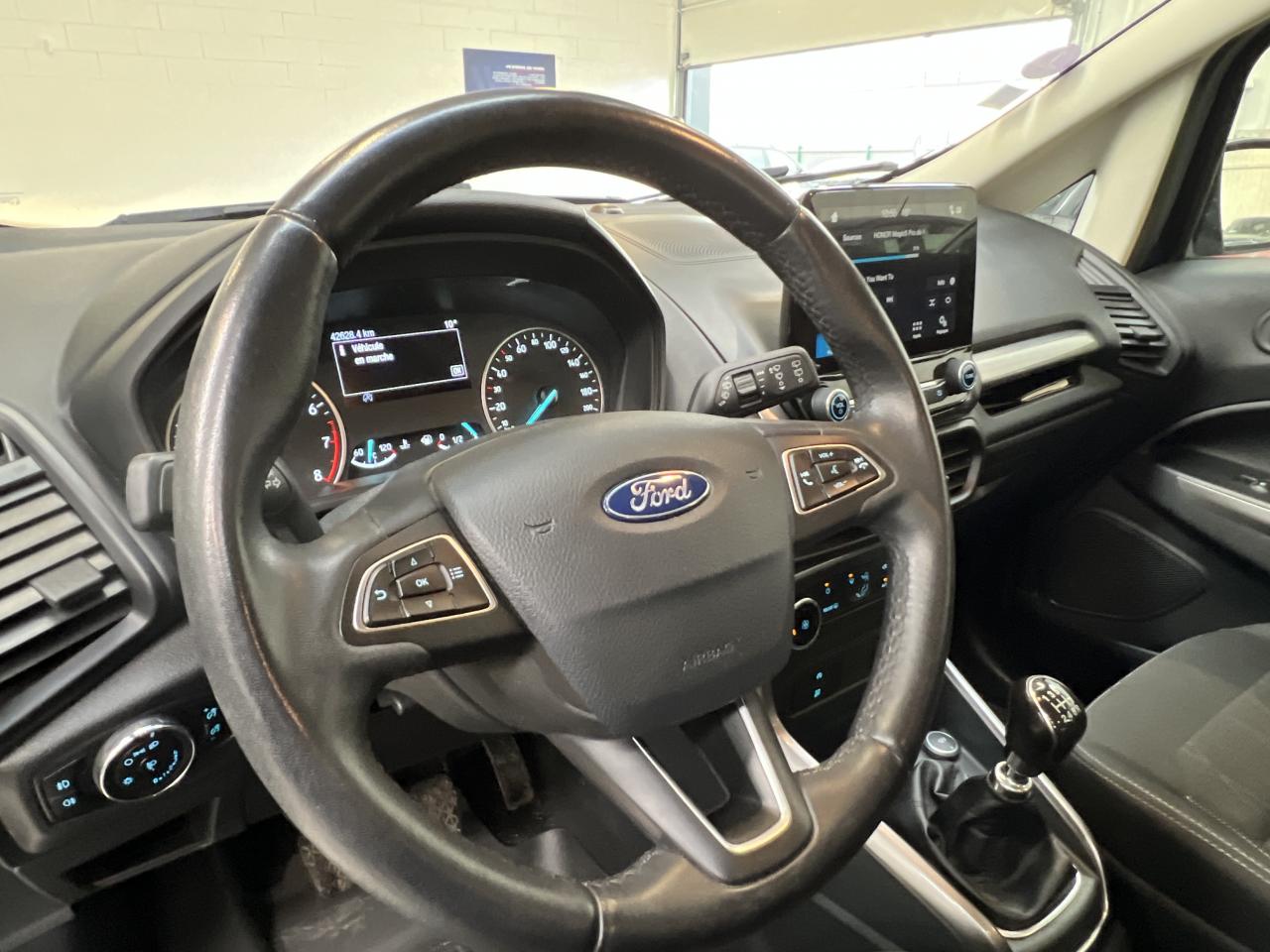 3 appuie-tête arrièreAirbag genoux conducteurAirbags frontaux, latéraux (thorax) et rideauxAlarme périmétriqueBanquette arrière rabattable 40/60Bavettes de protection avant & arrièreBoîte à gants éclairée et réfrigéréeCalandre avec barres façon chromeChauffage auxiliaireClimatisation manuelleConsole centrale avec accoudoir coulissant et porte gobeletDirection assistée électriqueESP + HLA (aide au démarrage en côte)Feux de jour à LEDJantes alliage 16''Kit de réparationOrdinateur de bord avec écran 4,2"Pare-brise acoustiquePare-chocs couleur carrosseriePlancher de coffre ajustablePoignées de portes couleur carrosseriePrises 12V (console centrale avant et console centrale à l'arrière)Projecteurs antibrouillardRétroviseurs extérieurs couleur carrosserie, chauffants et réglables électriquement avec rappels de clignotants intégrésSellerie Tissu noirSiège conducteur réglable en hauteur avec réglage lombaireSystème audio 6 HP avec Bluetooth, 2 ports USB et écran 4,2"Système de surveillance de pression des pneusSystème MyKey (seconde clé programmable)Tapis de sol avant et arrière et coffre CaoutchoucTrappes à carburant sans bouchon Ford Easy FuelVitres avant et arrière électriques avec descente/remonté à impulsion côté conducteurVolant, pommeau de levier de vitesses et frein à main gainés cuir