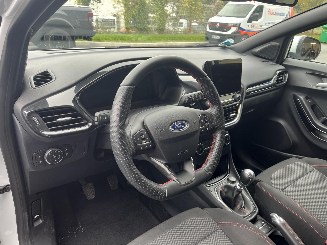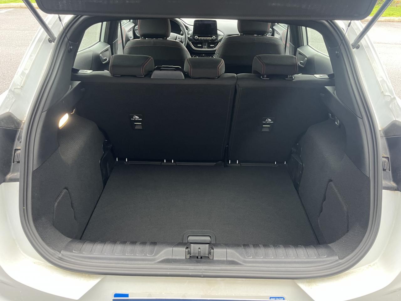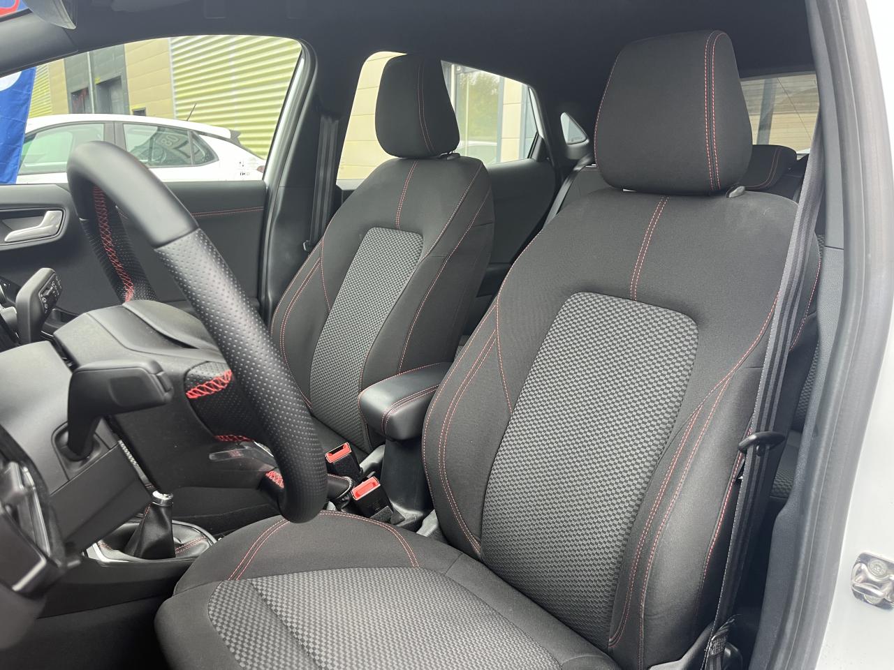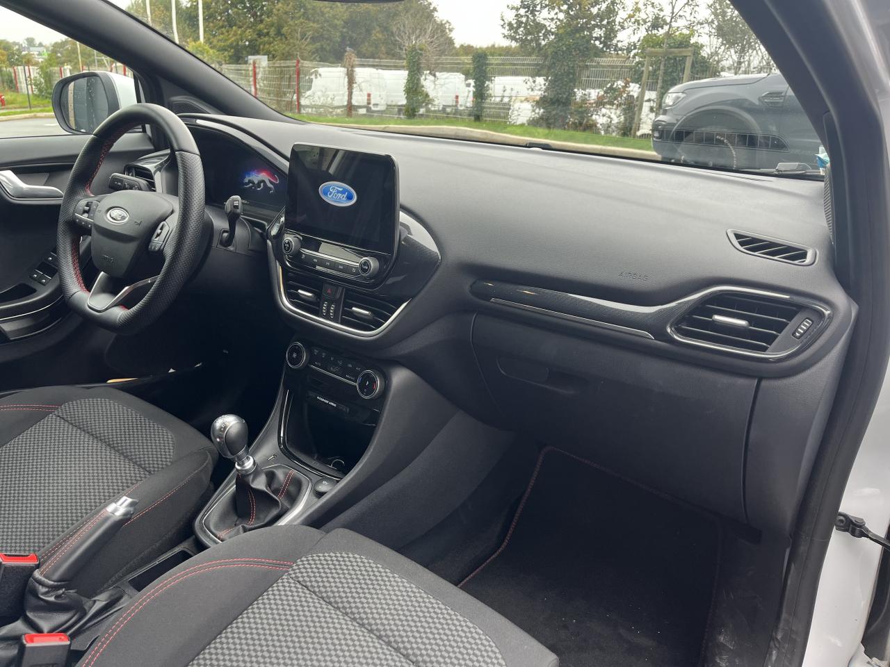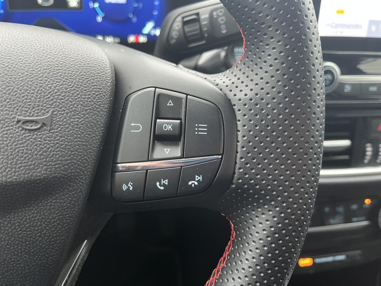 2 Fixations Isofix à l'arrière3 appuie-tête arrière5 ceintures de sécurité 3 points5 Modes de conduite sélectionnables (normal, eco, sport, faible adhérence, trail)Aide au démarrage en côteAide au maintien dans la voie avec détection des bas-côtésAide au stationnement arrièreAirbags frontaux, latéraux (thorax) et rideauxAlerte d'oubli de ceintures avant/arrièreAlerte de franchissement Involontaire de ligneAllumage automatique des projecteursAntipatinageAppuie-tête arrière réglables en hauteurAssistance au freinage d'urgenceAvertisseur de freinage d'urgenceBadges ST-LineBanquette arrière rabattable 40/60Bas de caisse couleur carrosserieBecquet arrière couleur carrosserieBouton de démarrage "Ford Power"Climatisation manuelleCombiné d'instrumentation numérique 12,3" avec EcomodeConsole centrale avant avec deux porte-gobelets rétroéclairésConsole centrale avec accoudoir et rangementsContour des vitres latérales en noir finition brillanteCorrecteur électronique de trajectoire ESPDésactivation de l'airbag du passager avantDirection assistée électriqueEclairage d'ambiance intérieurEssuie-glace avec intermittence réglable et système antigoutteFeux arrière à LEDFeux de jour à LEDFeux de route intelligents (passage feux de croisement/route automatique)FordPass Connect avec modem embarqué et fonction eCallFrein à disques à l'avantGrille de calandre ST-LineJantes alliage 17" 5x2 branches finition Black MachinedKit carrosserie ST-LineKit de réparation pneumatiqueLevier de frein à main gainé de SensicoLevier de vitesses gainé de SensicoLimiteur de vitesse intelligentLogo MHEV sur HayonPare-chocs couleur carrosseriePédalier designPeinture non-métallisée Bleu AbyssePhares avant antibrouillard avec fonction d'éclairage d'anglePrise 12 V sur console centrale avantRégulateur de vitesseRétroviseurs extérieurs électriques couleur carrosserie, dégivrant et rabattables avec rappels de clignotantsSellerie tissu noir Kasbah avec renforts latéraux EtonSiège conducteur réglable en hauteur avec soutien lombairesSortie d'échappement chroméeSuspensions sportSystème audio Ford SYNC 3 avec écran tactile 8", commandes vocales, 2 ports USB, alerte contresens, Apple CarPlay et Android auto, 6 hauts-parleursSystème de freinage antiblocage (ABS)Système de Navigation Europe et points d'intérêt MichelinSystème de prévention de collision avec freinage post-collision et détection piétonsSystème de surveillance de pression des pneusSystème MyKey (seconde clé programmable)Système Stop & StartTapis de sol avant avec surpiquresTrappe à carburant Ford EasyFuelVerrouillage centralisé à distanceVitres électriques avant et arrière avec descente et remontée à impulsionVolant à méplat 3 branches ST-Line avec surpiqûres rouges