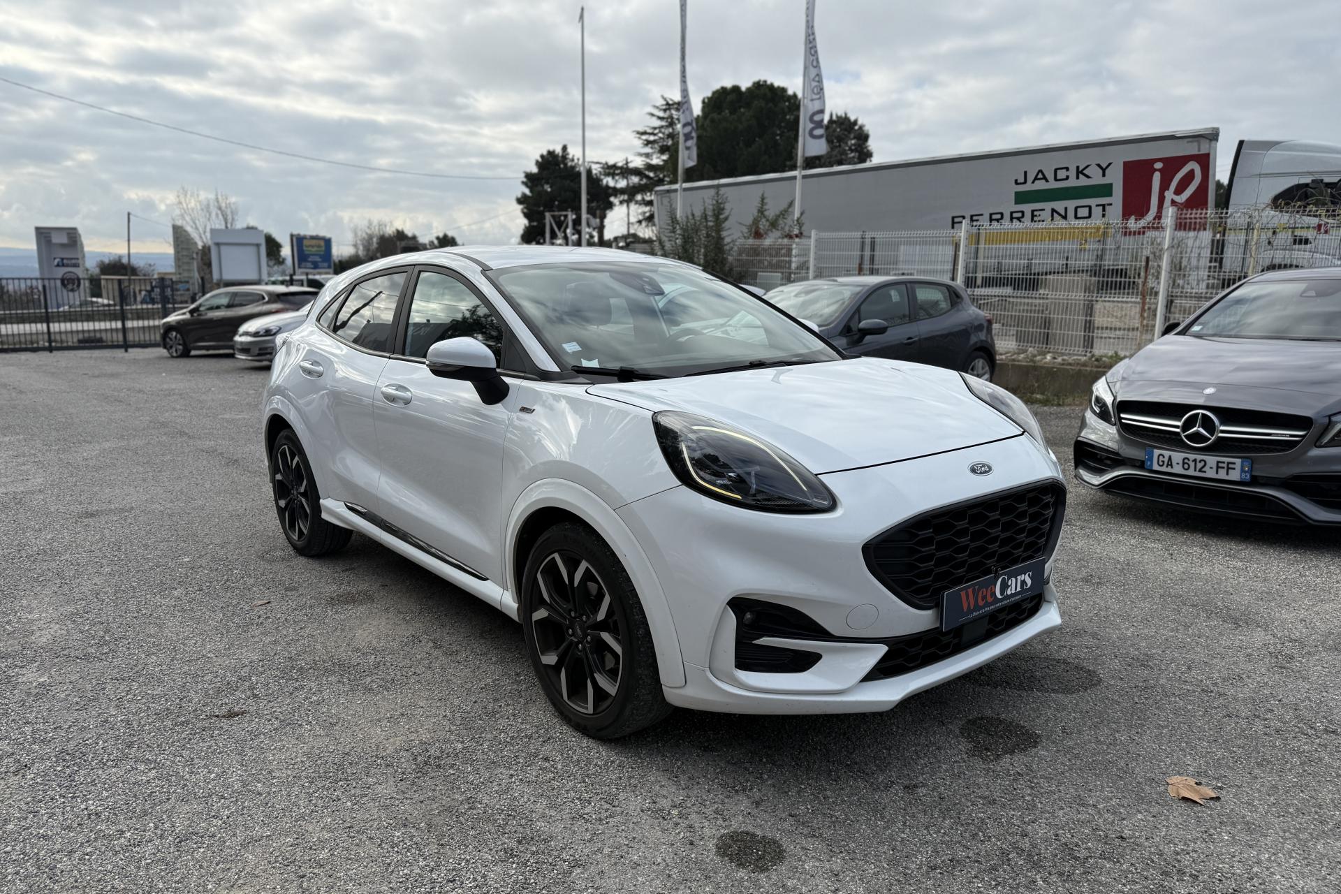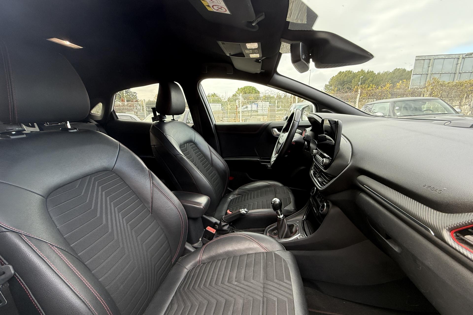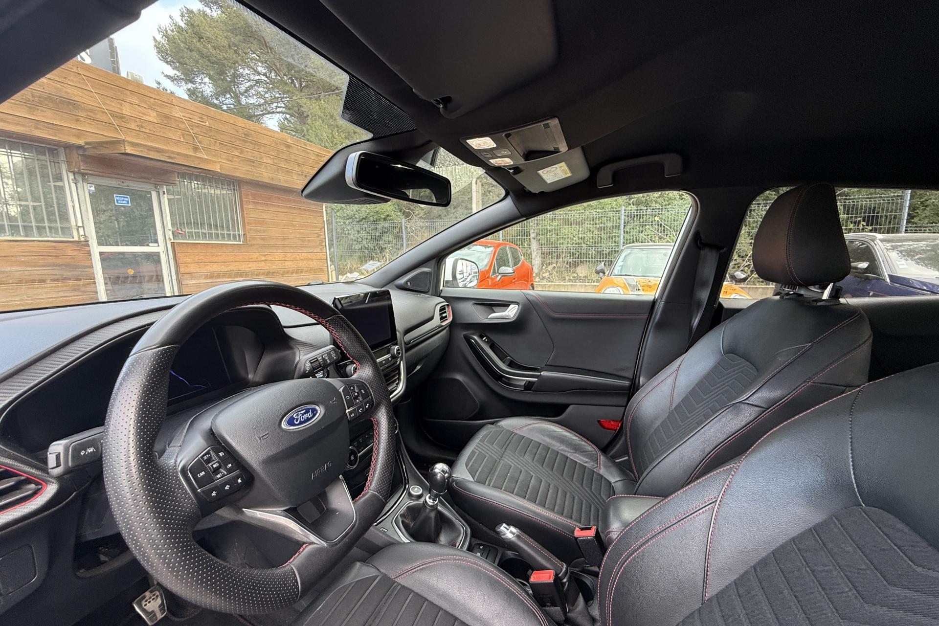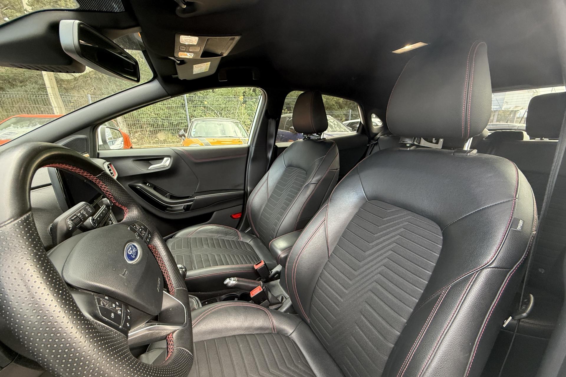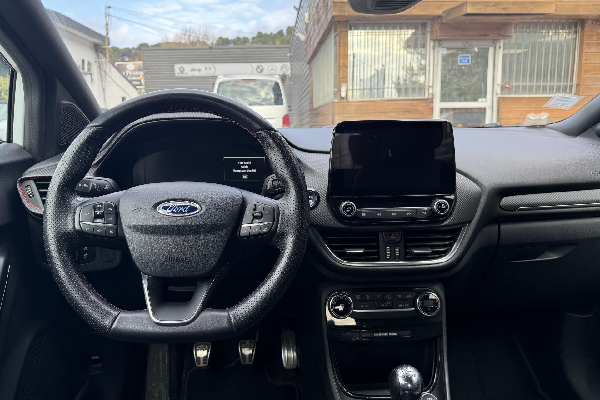 2 Fixations Isofix à l'arrière3 appuie-tête arrière5 ceintures de sécurité 3 points5 Modes de conduite sélectionnables (normal, eco, sport, faible adhérence, trail)Aide au démarrage en côteAide au maintien dans la voie avec détection des bas-côtésAide au stationnement arrièreAirbags frontaux, latéraux (thorax) et rideauxAlerte d'oubli de ceintures avant/arrièreAlerte de franchissement Involontaire de ligneAllumage automatique des projecteursAntipatinageAssistance au freinage d'urgenceBadges ST-LineBanquette arrière rabattable 40/60Bas de caisse couleur carrosserieBecquet arrière couleur carrosserieBouton de démarrage "Ford Power"Combiné d'instrumentation numérique 12,3" avec EcomodeConsole centrale avant avec deux porte-gobelets rétroéclairésConsole centrale avec accoudoir et rangementsContour des vitres latérales en noir finition brillanteCorrecteur électronique de trajectoire ESPDésactivation de l'airbag du passager avantDiffuseur intégré dans le pare-chocs arrièreDirection assistée électriqueEclairage d'ambiance intérieurFeux arrière à LEDFeux de jour à LEDFeux de route intelligents (passage feux de croisement/route automatique)FordPass Connect avec modem embarqué et fonction eCallFrein à disques à l'avantGrille de calandre ST-LineKit de réparation pneumatiqueLevier de frein à main gainé de SensicoLevier de vitesses gainé de SensicoLimiteur de vitesse intelligentPack ConfortPack Nav B&OPare-chocs avant design ST-LinePare-chocs couleur carrosseriePédalier en aluminiumPeinture non-métallisée Bleu AbyssePhares avant antibrouillard avec fonction d'éclairage d'anglePlancher de coffre ajustablePlaques de seuils de portes avant ST-LinePrise 12 V sur console centrale avantRégulateur de vitesseRétroviseur intérieur électrochromeRétroviseurs extérieurs électriques couleur carrosserie, dégivrant et rabattables avec rappels de clignotantsSellerie Mixte noire tissu Tire on Casual et Sensico SalernoSièges avant réglables en hauteur avec soutien lombaireSortie d'échappement chroméeSuspensions sportSystème audio B&O avec radio numérique DAB, SYNC 3 avec écran tactile 8", commandes vocales, 2 ports USB, compatible AppLink, Apple CarPlay et Android auto, 10 hauts-parleursSystème de freinage antiblocage (ABS)Système de Navigation Europe et points d'intérêt MichelinSystème de prévention de collision avec freinage post-collision et détection piétonsSystème de surveillance de pression des pneusSystème MyKey (seconde clé programmable)Système Stop & StartTapis de sol avant avec surpiquresTrappe à carburant Ford EasyFuelVitres arrière surteintéesVitres électriques avant et arrière avec descente et remontée à impulsionVolant à méplat 3 branches ST-Line avec surpiqûres rouges
