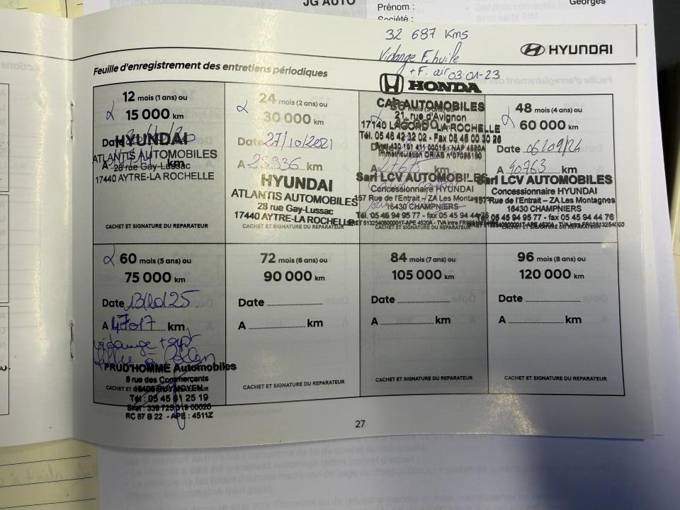 Accès et démarrage mains-libresAccoudoir avantAffichage tête hauteAide au démarrage en côteAide au stationnement arrièreAirbag frontaux conducteur et passagerAirbags latéraux avantAirbags rideaux avant/arrièreAlarme périmétriqueAlerte de circulation transversale arrièreAllumage automatique des projecteursAntenne de toit « aileron de requin »Appuie-têtes arrière réglables en hauteurAppuie-têtes avant réglables en hauteur et ajustablesAssistance active au maintien de voieCaméra de recul avec lignes de guidage activesCapteur de pluieChargeur sans fil pour smartphones compatiblesClimatisation automatiqueCommandes audio au volantCompatibilité Apple CarPlay et Android AutoConnexion BluetoothConsole de rangement sous accoudoir central avantContour de calandre chroméContrôle de la pression des pneumatiquesContrôle de trajectoire électronique (ESP)Détecteur de fatigue du conducteurDossier arrière rabattable 60/40Drive ModeFeux de jour à LEDFeux de position avant à LEDFrein de parking électriqueJantes alliage bi-ton 18''Miroirs de courtoisie éclairés conducteur et passagerMoulures de protection latérales avec insert grain métalOrdinateur de bord 3,5" multifonctionPack intérieur blanc (Si choix du coloris extérieur Chalk White, Ceramic Blue, Blue Lagoon ou Tangerine Comet)Pare-brise et vitres avant athermiquesPoches aumônières au dos des sièges avantPoignées de portes intérieures et base du volant noir laquéPrise 12V à l'avantPrise USBPrise USB de rechargeProjecteurs antibrouillardProtections d’ailes gris anthraciteRails de toitRéception radio numérique (DAB)Régulateur et limiteur de vitesseRépétiteurs de clignotants intégrés aux rétroviseurs extérieursRétroviseur intérieur électrochromeRétroviseurs extérieurs électriques et dégivrantsRétroviseurs rabattables électriquementSellerie tissu-cuirServices connectés BlueLink avec carte SIMServices connectés Hyundai LiveSiège conducteur à réglage lombaire électriqueSiège conducteur réglable en hauteurSki arrière grain métalSurveillance des angles morts avec assistance au changement de voieSystème audio premium Krell, 5 haut-parleurs, 2 tweeters, subwoofer et amplificateur externeSystème de navigation Europe avec assistant d’éco-conduite et programme de mise à jour de la cartographieSystème isofix pour sièges enfant aux places latérales arrièreSystème multimédia avec écran couleur tactile 10,25"Verrouillage automatique des portes en roulantVerrouillage centralisé à distanceVitre conducteur séquentielleVitres arrières surteintéesVitres électriques avant/arrièreVolant et pommeau de levier de vitesses gainés cuirVolant réglable en hauteur et en profondeur