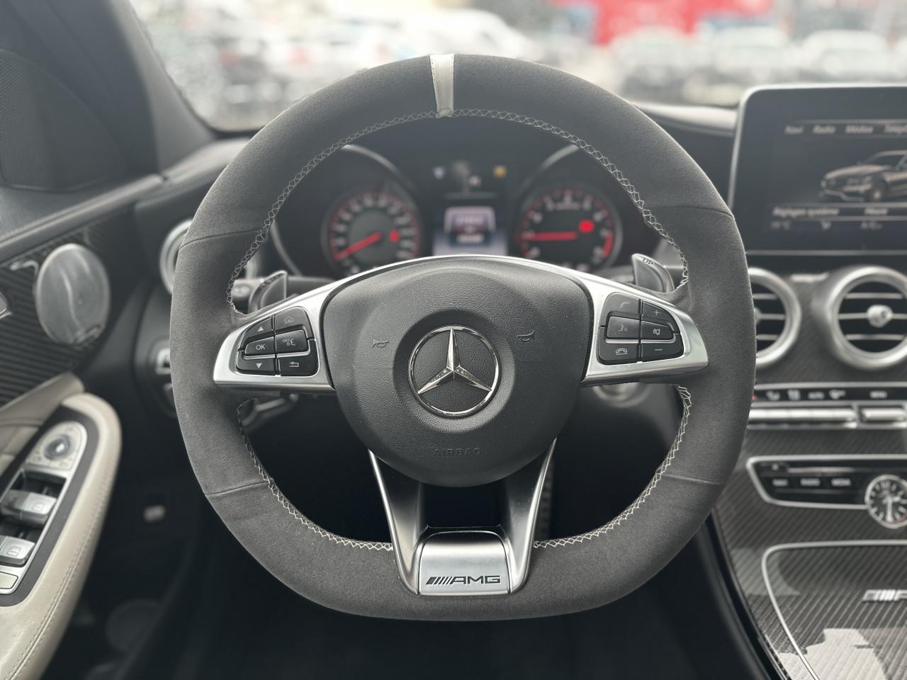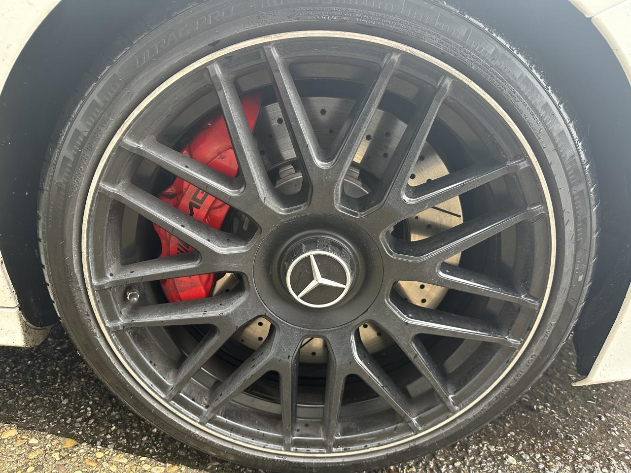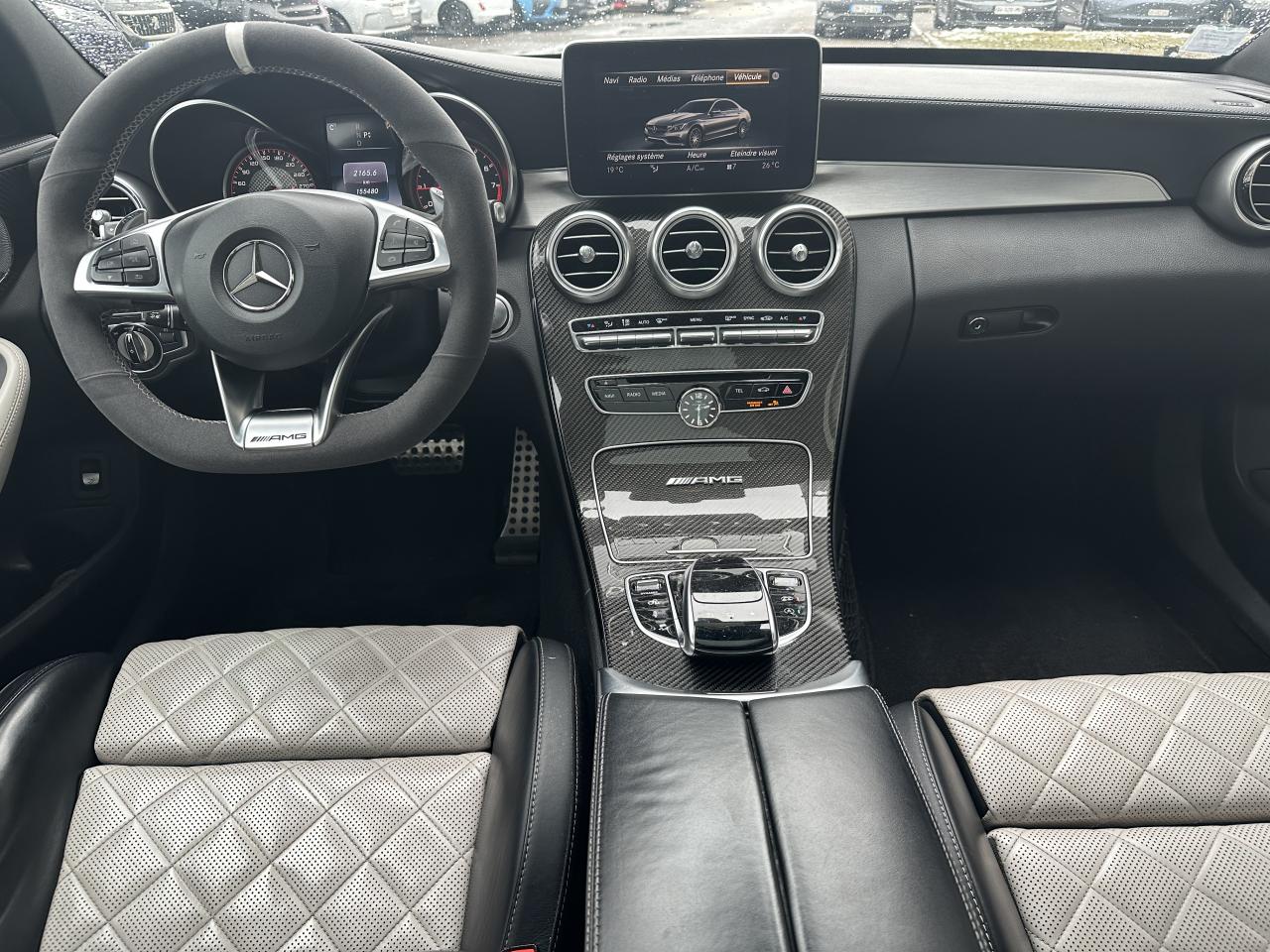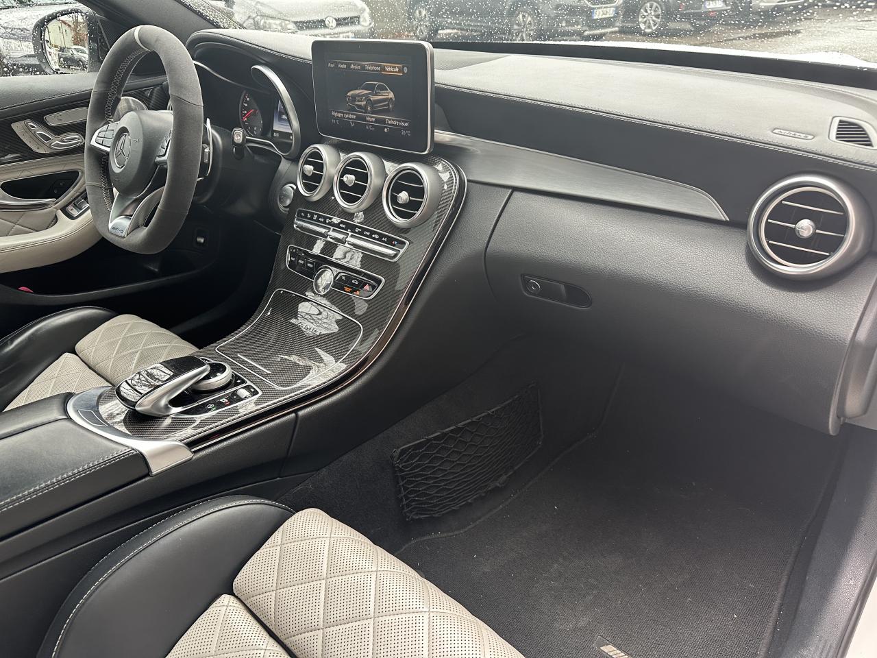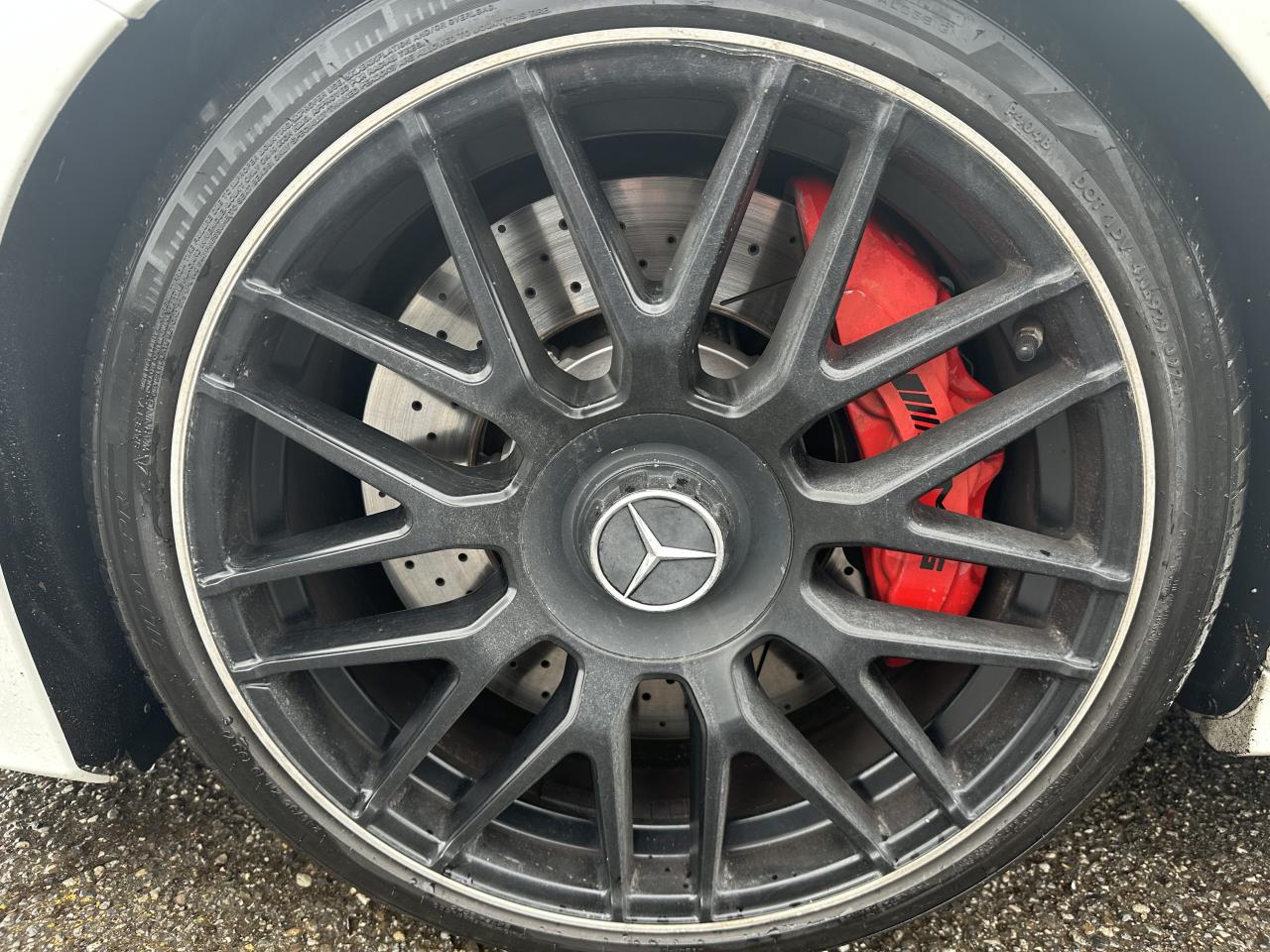 Accoudoir central avant avec vide-poches, ADAPTIVE BRAKE avec fonction HOLD et aide au démarrage en côte, Affichage tête haute, Antivol à clé électronique avec système de verrouillage ELCODE, APA (Aide au Parking Active) : système d'aide au stationnement avec radars de proximité avant/arrière et caméra de recul, Boîte de vitesses sport automatique à 7 rapports SPEEDSHIFT MCT AMG avec fonction Race Start, Caméra de recul, Climatisation automatique THERMATIC à 2 zones, COLLISION PREVENTION ASSIST : système d'avertissement des risques de collision, COMAND Online, Détecteur d'angle mort, Déverrouillage du coffre à distance, Différentiel autobloquant AMG sur l'essieu arrière (électronique), Direction paramétrique sport AMG, DYNAMIC SELECT AMG : 5 modes de conduite au choix (Eco, Confort, Sport, Sport Plus et Individuel), ESP AMG avec 3 modes de réglage (On, Sport et Off), Etriers de freins peints dans le ton rouge, Intelligent Light System (ILS) à LED : Projecteurs hautes performances à technologie LED avec répartition variable de l'éclairage, éclairage actif dans les virages et correcteur dynamique de portée, Interface média USB dans l'accoudoir central avant (2 ports USB), Jupe avant AMG avec splitter finition noir brillant et baguette avant finition argent iridium mat, Monogramme S AMG sur le couvercle de coffre, Ordinateur de bord, Pack d'éclairage intérieur, Rétroviseurs extérieurs électriques, chauffants et asphériques, avec rappels de clignotants intégrés, Sièges avant chauffants, Sièges avant sport AMG avec maintien latéral optimisé et plaquette AMG, Sièges conducteur et passager avant tout électriques avec fonction Mémoires incluant la colonne de direction et les rétroviseurs extérieurs, Système d'échappement sport AMG avec deux doubles sorties chromées, Système de freinage composite hautes performances AMG (disques AV 390x36 mm et AR 360x26 mm), Tableau de bord recouvert de similicuir ARTICO noir, TEMPOMAT (régulateur de vitesse) et SPEEDTRONIC (limiteur de vitesse), Toit ouvrant panoramique électrique en verre, Train de roulement sport RIDE CONTROL AMG avec réglage adaptatif, Volant performance AMG à 3 branches en cuir Nappa/microfibre Dinamica