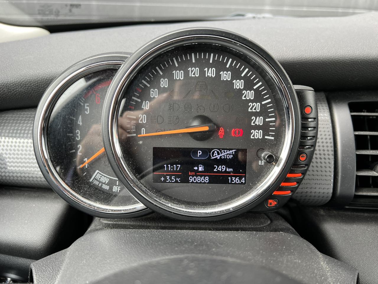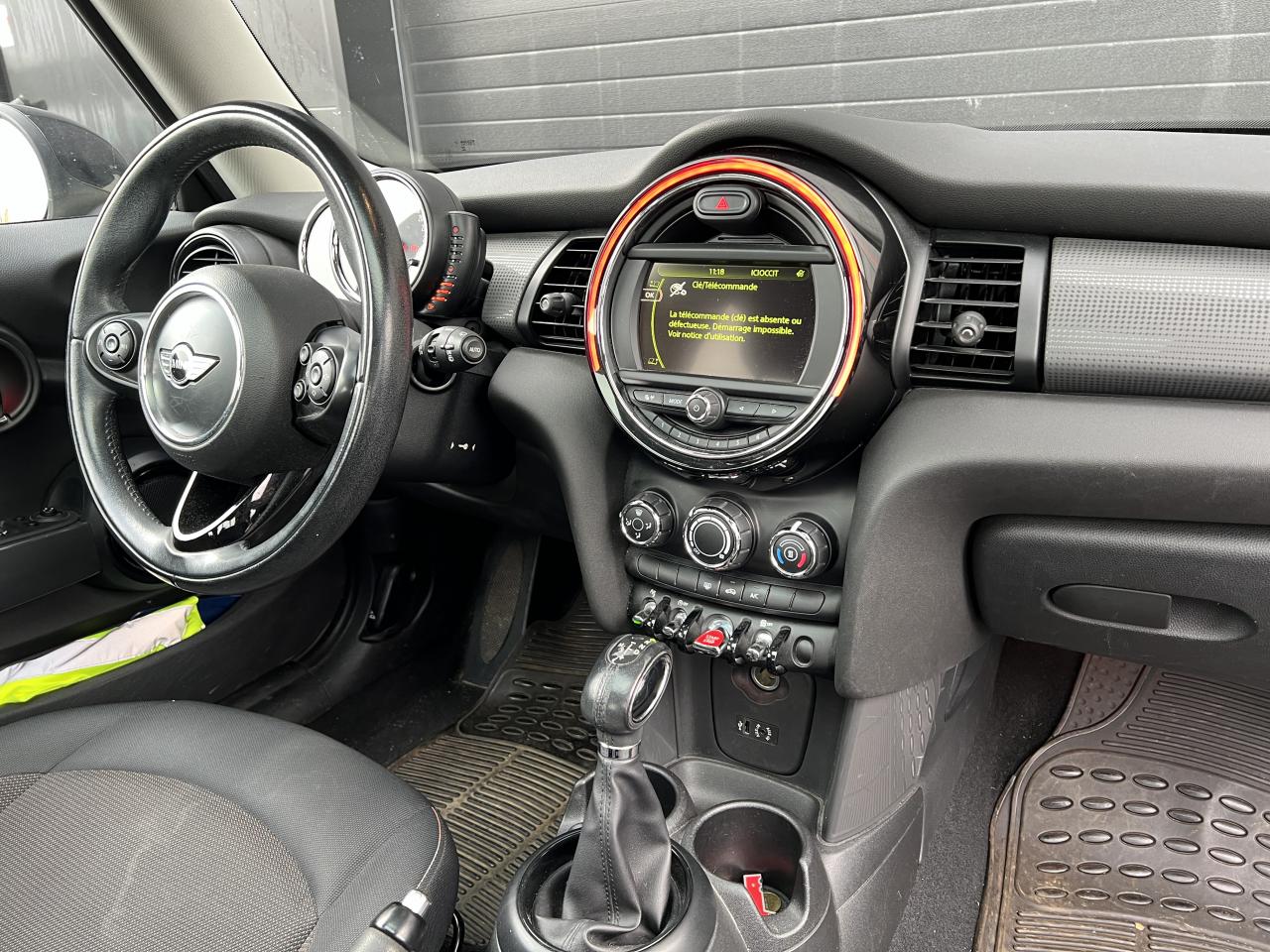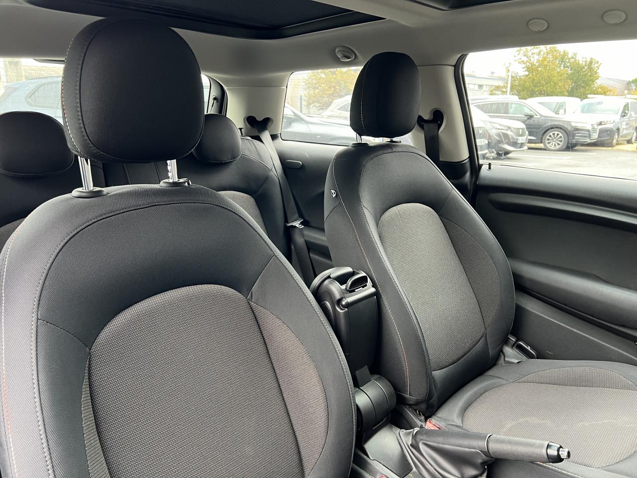 2 clés radiocommandées4 appuie-tête réglables en hauteur6 airbags (2 frontaux, 2 latéraux et 2 rideaux)ABS, y compris assistant de freinageAnti-démarrage électronique EWS IVAppel d'Urgence IntelligentAutoradio MINI avec prise AUX-IN, 4 haut-parleurs et compatibilité MP3Baguettes de seuil de porte avec inscription de la motorisation façon métalliqueBanquette arrière 2 places rabattable 60/40Becquet arrière de toitBoîte de vitesses automatiqueCalandre au contour chromé avec lamelles “White aluminium”Cerclage des buses d'aération chroméesCiel de pavillon teinte Satellite GreyClimatisation manuelleColour Line Carbon BlackCompte-tours et ordinateur de bord multifonctionsContrôle Dynamique de la Stabilité DSC, y compris assistant de démarrage en côteDétecteur d'accidentEclairage d'accompagnement "Follow me Home"Ecrous antivolFeux arrière à technologie LEDFiltre à particulesFixations ISOFIX aux places arrièreFonction sécurité piéton avec capot actifFonction Start & Stop et démarrage sans cléIndicateur de crevaisonInserts décoratifs Hazy GreyJantes en alliage 15'' design "Heli Spoke" 5,5 J x 15 / pneumatiques 175/65 R 15Lève-vitres et rétroviseurs extérieurs électriquesMINI Mobility System et cricOuïes latérales noires avec répétiteurs de clignotants orange intégrésPare-chocs avant et arrière de couleur noirePoignée de hayon chromée “White aluminium”Poignées de portes chroméesPoignées de portes intérieures chroméesPorte-boissons à l'avant (x2)Prise 12V sous la console centraleProjecteurs avant et feux arrière au contour chroméRétroviseurs extérieurs couleur carrosserieSellerie tissu "Firework" Carbon BlackSeuils de portes chromésSiège conducteur réglable en hauteurSortie d'échappement simple, droite et chroméeSurveillance de pression des pneumatiquesSystème d'accès aux places arrière Easy-EntrySystème mains-libres Bluetooth niveau 1TéléServicesVerrouillage centralisé des portes, du coffre et de la trappe à essenceVolant en cuir 3 branches réglable en hauteur et en profondeur avec insert Piano BlackVolant Sport gainé cuir