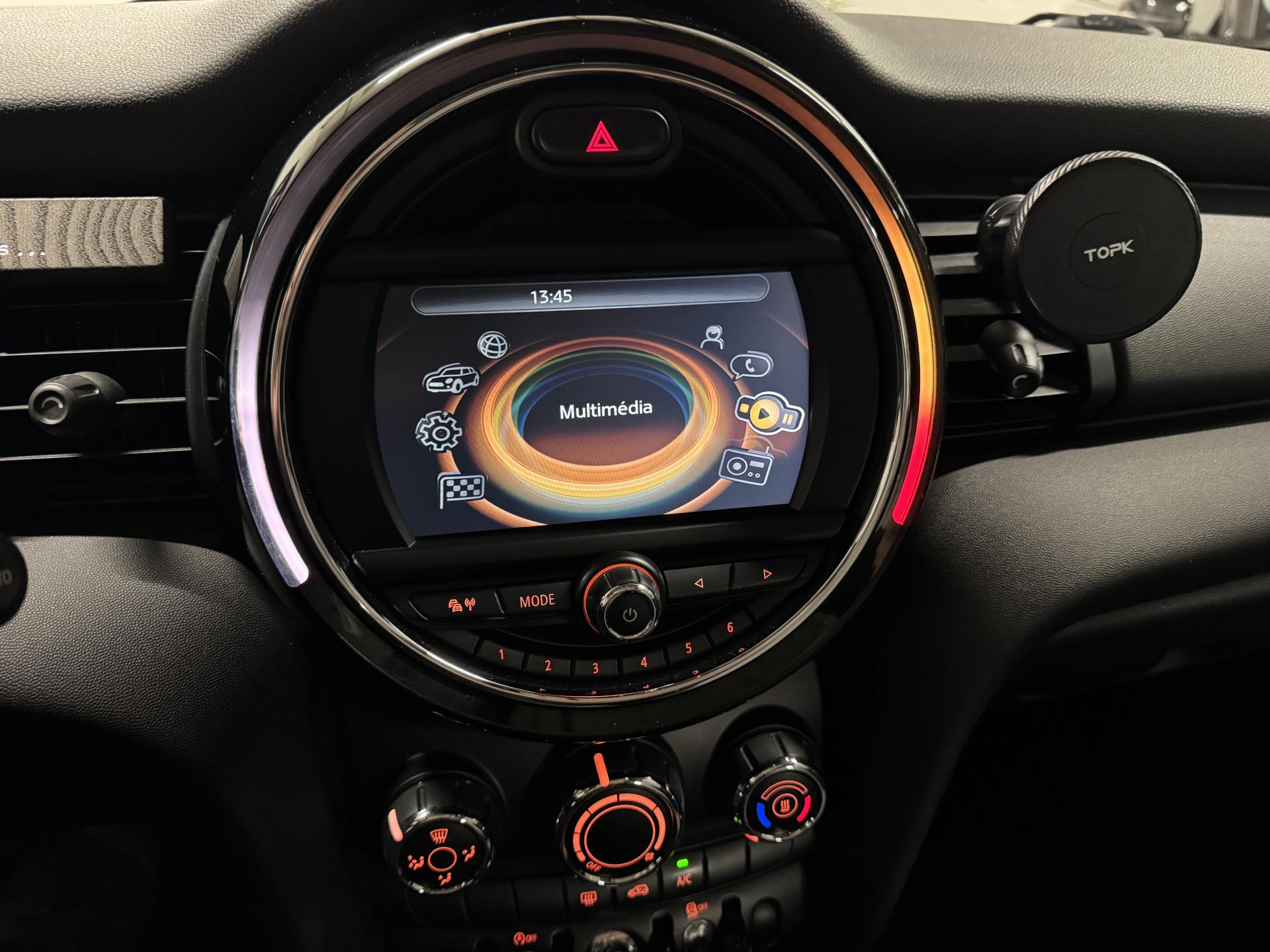 2 clés radiocommandées4 appuie-tête réglables en hauteur6 airbags (2 frontaux, 2 latéraux et 2 rideaux)ABS, y compris assistant de freinageAccoudoir central avant inclinable en 4 positionsAide au stationnement arrièreAnti-démarrage électronique EWS IVAutoradio MINI Visual BoostBaguettes de seuil de porte avec inscription de la motorisation façon métalliqueBanquette arrière 2 places rabattable 60/40Becquet arrière de toitBoîte de vitesses manuelle 6 rapportsCalandre au contour chromé avec lamelles noiresCerclage des buses d'aération chroméesCiel de pavillon teinte Satellite GreyClignotants blancsClimatisation manuelleColour Line Carbon BlackContrôle Dynamique de la Stabilité DSC, y compris assistant de démarrage en côteDétecteur d'accidentDétecteur de pluie et allumage automatique des projecteursEclairage d'accompagnement "Follow me Home"Ecrous antivolFeux arrière à technologie LEDFixations ISOFIX aux places arrièreFonction Start & Stop et démarrage sans cléIndicateur de crevaisonJantes en alliage 16'' design "Victory Spoke" noires 6,5 J x 16 / pneumatiques 195/55 R 16Lève-vitres et rétroviseurs extérieurs électriquesMINI Mobility System et cricPare-chocs avant et arrière de couleur noirePoignée de hayon noir matPoignées de portes chroméesPoignées de portes intérieures chroméesPorte-boissons à l'avant (x2)Prise 12V sous la console centraleProjecteurs avant et feux arrière au contour chroméRétroviseurs extérieurs couleur carrosserieRétroviseurs extérieurs rabattables électriquementSiège conducteur réglable en hauteurSièges avant sport avec Sellerie tissu/simili cuir "Black Pearl" Carbon BlackSortie d'échappement simple et droiteSystème d'accès aux places arrière Easy-EntrySystème de capot actif (DHS)Système de navigation MINI avec écran 6,5''Système mains-libres Bluetooth avec Snap-in - niveau 2Teinte de carrosserie unie Pepper WhiteToit ouvrant panoramique en verreTouches multifonctions avec régulateur de vitesse au volantTouches multifonctions et régulateur de vitesse avec fonction freinageVerrouillage centralisé des portes, du coffre et de la trappe à essenceVolant sport 3 branches gainé de cuir