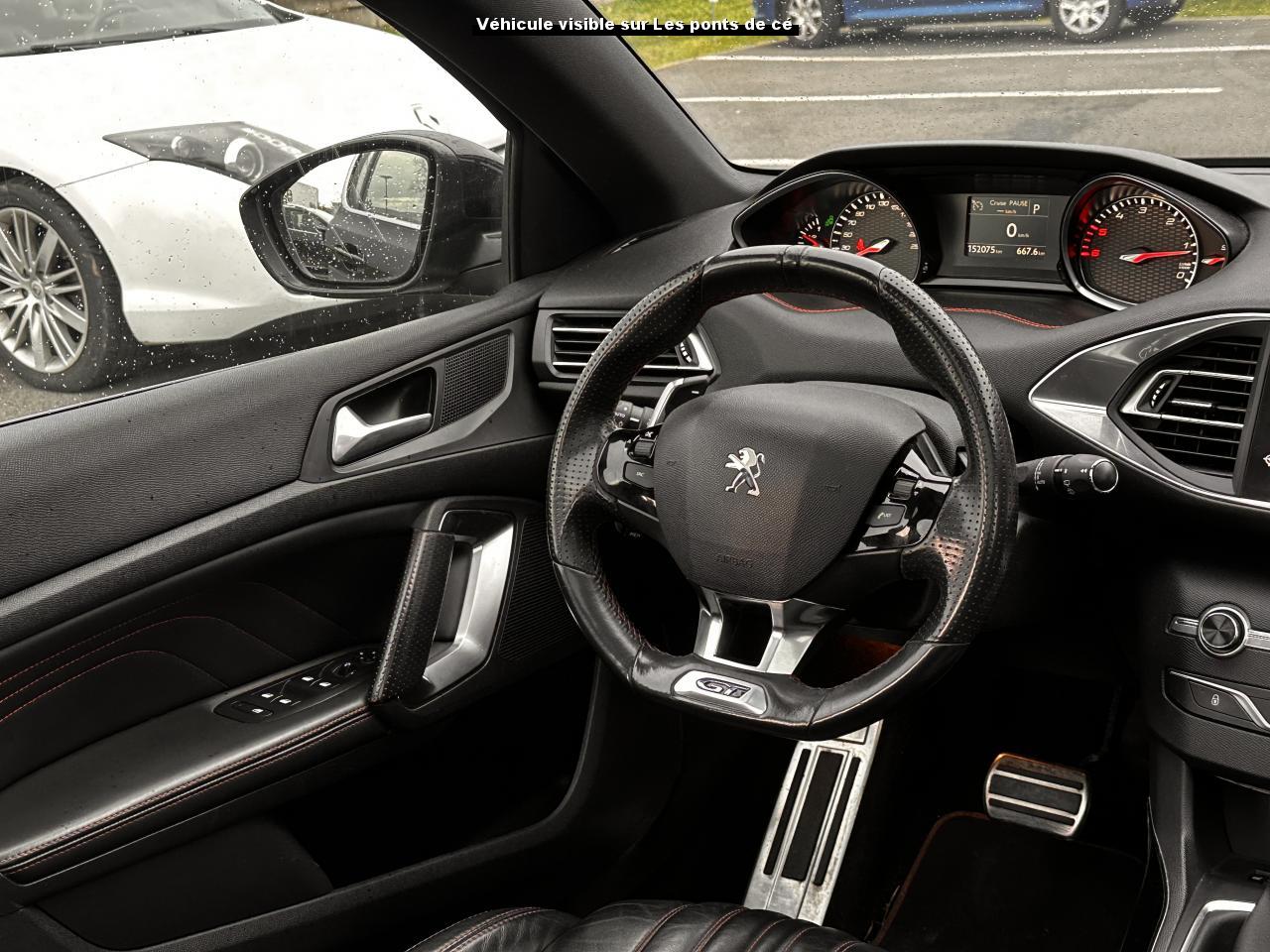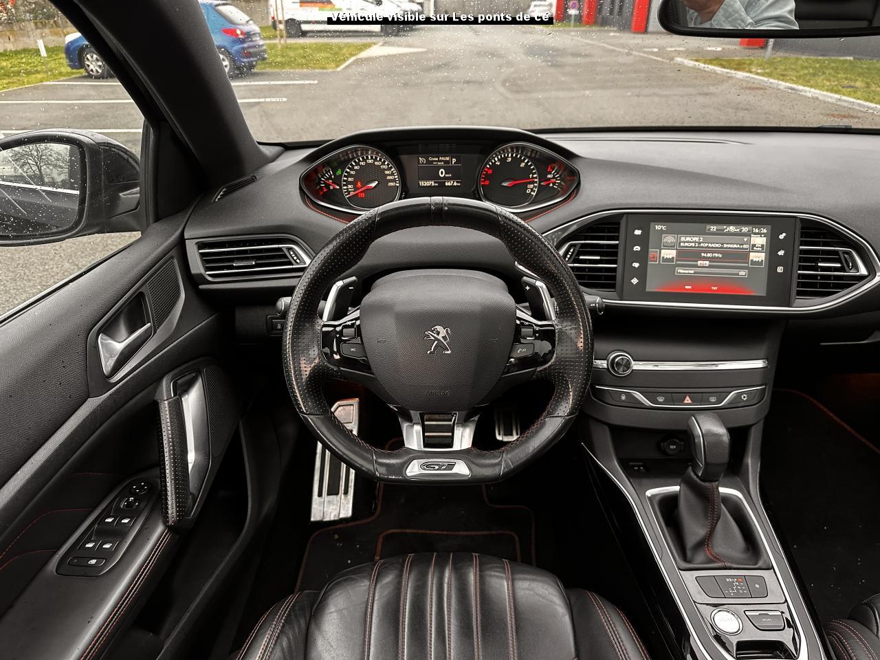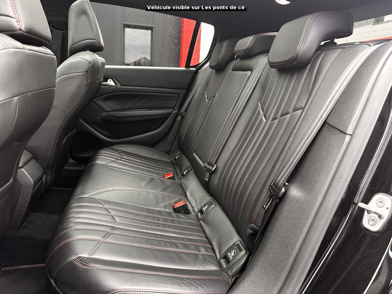 3 appuie-tête arrière réglables en hauteurABS (Antiblocage de roues)Accès et démarrage mains-libresAccoudoir central avant avec rangementAide au démarrage en côteAide graphique et sonore au stationnement arrièreAide graphique et sonore au stationnement avantAirbags frontaux conducteur et passager adaptatifs (passager neutralisable), latéraux avant et rideaux avant et arrièreAlarme sonore d'oubli d'extinction des feuxAlerte visuelle et sonore de débouclage des ceintures de sécurité arrièreAlerte visuelle et sonore de non bouclage et de débouclage des ceintures de sécurité conducteur et passager avantAllumage automatique des feux de détresseAntenne courteAntidémarrage codé électroniqueAppuie-tête avant virgule réglables en hauteurAssistance au freinage d'urgenceBadge GT sur la calandre, les ailes avant et le volet arrièreBanquette arrière rabattable 1/3-2/3Becquet arrière couleur carrosserieBoîte à gants éclairée et réfrigérableBouclier arrière intégrant des doubles canules d'échappement de styleBouclier avant spécifique avec écopes d'entrée d'air noir laquéCalandre spécifique intégrant le lion PEUGEOTCeinture conducteur et passager à enrouleur pyrotechniqueCeintures latérales rang 2 avec limitation d'effortClignotants avant à LEDs avec défilement dynamiqueClimatisation automatique bi-zoneCombiné "Haut de gamme "spécifique GT avec matrice couleur 3"5 et fond de compteur DamierCommande de verrouillage à distance (un plip)Coquilles de rétroviseur spécifiques Noir Perla NeraDécors intérieur spécifiquesDétecteur de sous-gonflage indirectDriver Sport PackEcran tactile multifonction 9,7", radio, Bluetooth, Jack, USB, 6HPEnjoliveurs latéraux de bas de caisseESP (contrôle dynamique de stabilité) + ASRFeux arrière à LEDFeux diurnes à LEDFixations Isofix (aux places latérales arrière)Frein de parking électriqueGarnissage TEP/ALCANTARA avec surpiqûres rougesGarniture et montants de pavillon anthraciteIndicateur de température extérieureJantes Aluminium 18" DIAMANT 225/40R18 WKit de dépannage pneumatique (anneau de remorquage, compresseur et flacon de produit de colmatage)Lève-vitres électriques arrière à fonctions séquentielle et anti-pincementLève-vitres électriques avant à commande séquentielle et anti-pincementLunette arrière chauffantePack ConfortPack VisibiltéPare-chocs arrière, peint couleur caisse avec diffuseur noir laquéPédales et repose pieds en aluminiumPeinture opaquePlafonnier central avant et arrière à LEDPoches aumônières au dos des sièges avantPrise 12VPrise 230VProjecteurs haut de gamme "Full Leds Technology"Rangement dans le coffre, spécifique pour triangle de pré-signalisation et trousse de secoursRéglage lombaire du siège passager (mécanique)Réglage manuel lombaire du siège conducteurRégulateur - limiteur de vitesse programmableRépartiteur électronique de freinage REFRétroviseurs extérieurs avec réglage électriqueRétroviseurs extérieurs rabattables électriquementSeuils des portes en aluminiumSiège conducteur et passager réglable en hauteur (mécanique)Sièges avant sportSurtapis avec surpiqûres rougesSuspension sport (assiette abaissé de 10 mm)Système de navigation avec écran tactileVerrouillage automatique de tous les ouvrants en roulantVitres latérales et lunette arrière surteintéesVolant réglable en hauteur et en profondeur (mécanique)Volant spécifique, cuir pleine fleur avec Badge GT et surpiqûres rouges
