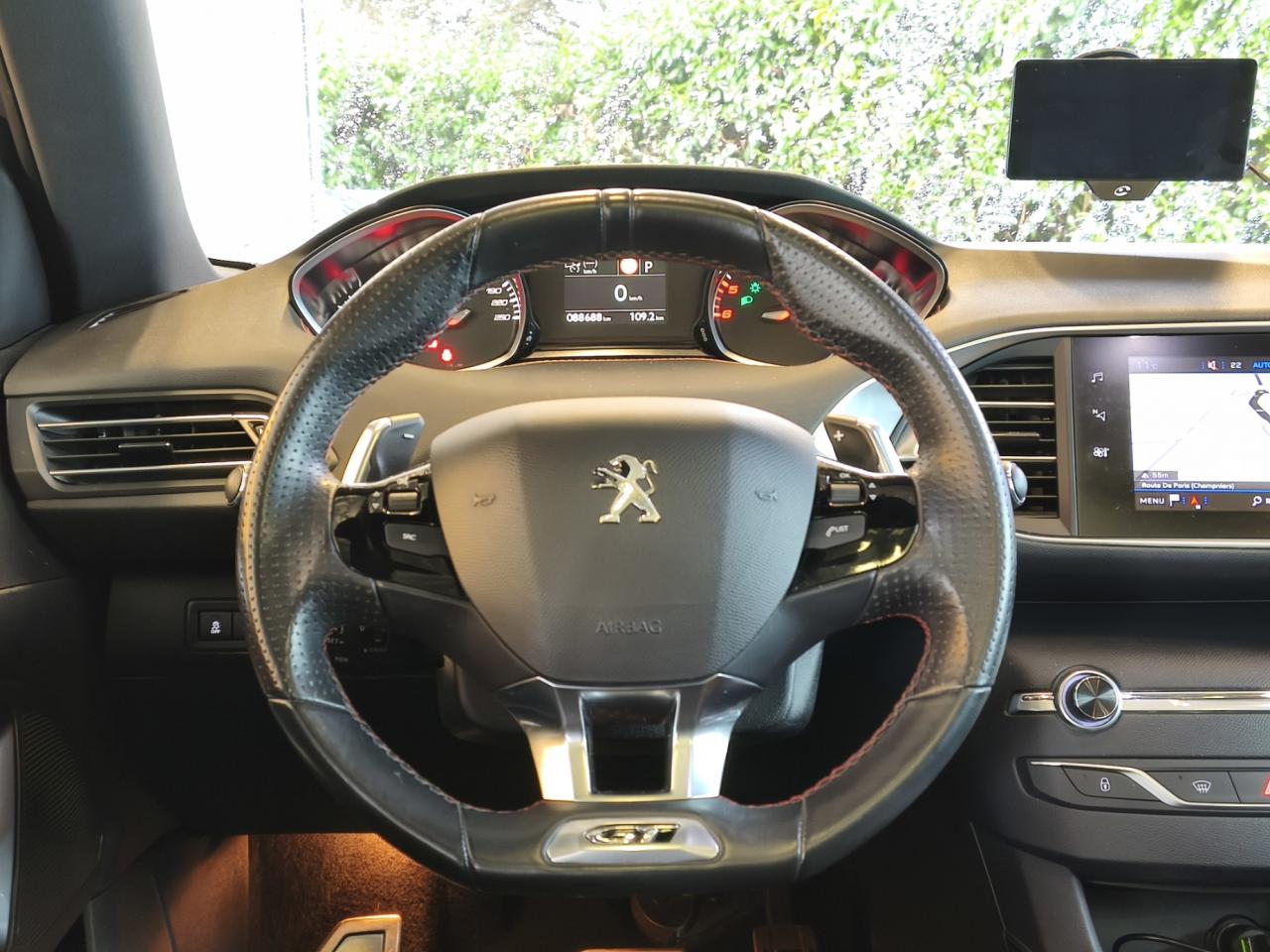2 Prises 12VABS (Antiblocage de roues)Accès et démarrage mains libres - inclut la prise USB en rang 2 et un plip supplémentaireAccoudoir central avant avec rangementAide graphique et sonore au stationnement arrièreAide graphique et sonore au stationnement avantAir conditionné automatique bi-zone (avec filtre à charbon actif, anti-odeurs)Airbags frontaux conducteur et passager adaptatifs (passager neutralisable), latéraux avant et rideaux avant et arrièreAlerte visuelle et sonore de débouclage des ceintures de sécurité arrièreAlerte visuelle et sonore de non bouclage et de débouclage des ceintures de sécurité conducteur et passager avantAllumage automatique des feux de détresseAntenne courteAppuis-tête à sécurité optimisée réglables en hauteur sur les sièges conducteur et passager avant ainsi que sur les places arrièresAssistance au démarrage en côte (Hill Assist)Assistance au freinage d'urgenceAvertisseur de temps de conduiteBadge GT sur les ailes avant et le pare-chocs arrièreBanquette arrière rabattable (2/3 -1/3) avec modularité Magic FlatBarres de seuils de portes avant en inoxBarres de toit longitudinales en aluminiumBecquet arrière couleur carrosserieBoîte à gants éclairée et réfrigérableBouclier arrière couleur carrosserieBouclier arrière intégrant des doubles canules d'échappement de styleCalandre avec jonc périphérique et damiers chromés, intégrant le lion PEUGEOTCeinture conducteur et passager à enrouleur pyrotechniqueCeintures centrale rang 2 sans limitation d'effort, 3 pointsCeintures latérales rang 2 avec limitation d'effortCombiné "Haut de gamme "spécifique GT avec matrice couleur 3"5 et fond de compteur DamierCommande de verrouillage à distance (deux plips)Contrôle de trajectoire ESP déconnectableCoquilles de rétroviseur spécifiques Noir Perla NeraDécors spécifiques intérieurs avec surpiqûres rougesDétecteur de sous-gonflage à détection indirecteDiffuseur arrière noir laquéDriver Sport PackEcran tactile 9,7'' (Radio 6HP, et connectivité Bluetooth (audio streaming, kit mains libres), commandes au volantEnjoliveurs latéraux de bas de caisseEntourage de vitres chroméESP (contrôle dynamique de stabilité) + ASREssuie-glace arrière avec déclenchement automatique en marche arrièreFeux arrière à LEDFeux diurnes à LEDFixations Isofix (aux places latérales arrière)Fonction Mirror ScreenGarnissage TEP/ALCANTARA avec surpiqûres rougesHabitacle et ciel de pavillon anthraciteJantes alliage 18" 'Diamant'Kit de dépannage pneumatique (anneau de remorquage, compresseur et flacon de produit de colmatage)Lève-vitres électriques arrière à fonctions séquentielle et anti-pincementLève-vitres électriques avant à commande séquentielle et anti-pincementLunette arrière chauffanteMiroirs de courtoisie éclairés conducteur et passagerPack ConfortPack SafetyPack VisibiltéPédalier et repose-pied conducteur en aluminiumPeinture opaque Gris HurricanePEUGEOT Connect : Navigation connectée 3D avec reconnaissance vocale - Cartographie Europe avec connexion automatique et permanente aux services de Navigation connectée, SOS et Assistance, TéléservicesPEUGEOT i-Cockpit : Poste de pilotage innovant associant combiné tête haute, volant compact et grand écran tactilePlafonnier central avant et arrière à LEDPoches aumônières au dos des sièges avantPommeau de levier de vitesses et frein à main en cuirPrise 12VPrise USBProjecteurs 'Peugeot Full LED Technology'Rails de coffre en AluminiumRangement dans le coffre, spécifique pour triangle de pré-signalisation et trousse de secoursRéglage lombaire du siège passager (mécanique)Réglage manuel lombaire du siège conducteurRégulateur et limiteur de vitesseRépartiteur électronique de freinage REFRétroviseurs extérieurs avec réglage électriqueRétroviseurs extérieurs dégivrantsRétroviseurs extérieurs rabattables électriquement avec éclairage d'accueilSécurité enfant électrique des vitres arrièreSiège conducteur et passager réglable en hauteur (mécanique)Surtapis avec surpiqûres rougesSuspension sport (assiette abaissé de 10 mm)Verrouillage automatique de tous les ouvrants en roulantVisiopark 1 : caméra de recul avec restitution sur l'écran tactile d'une vue arrière, et d'une vue de dessus de l'environnement arrière du véhiculeVitres latérales et lunette arrière surteintéesVolant réglable en hauteur et en profondeur (mécanique)Volant spécifique, cuir pleine fleur avec surpiqûres rouges