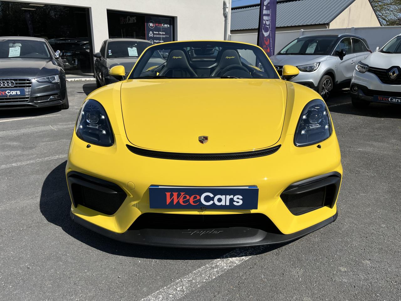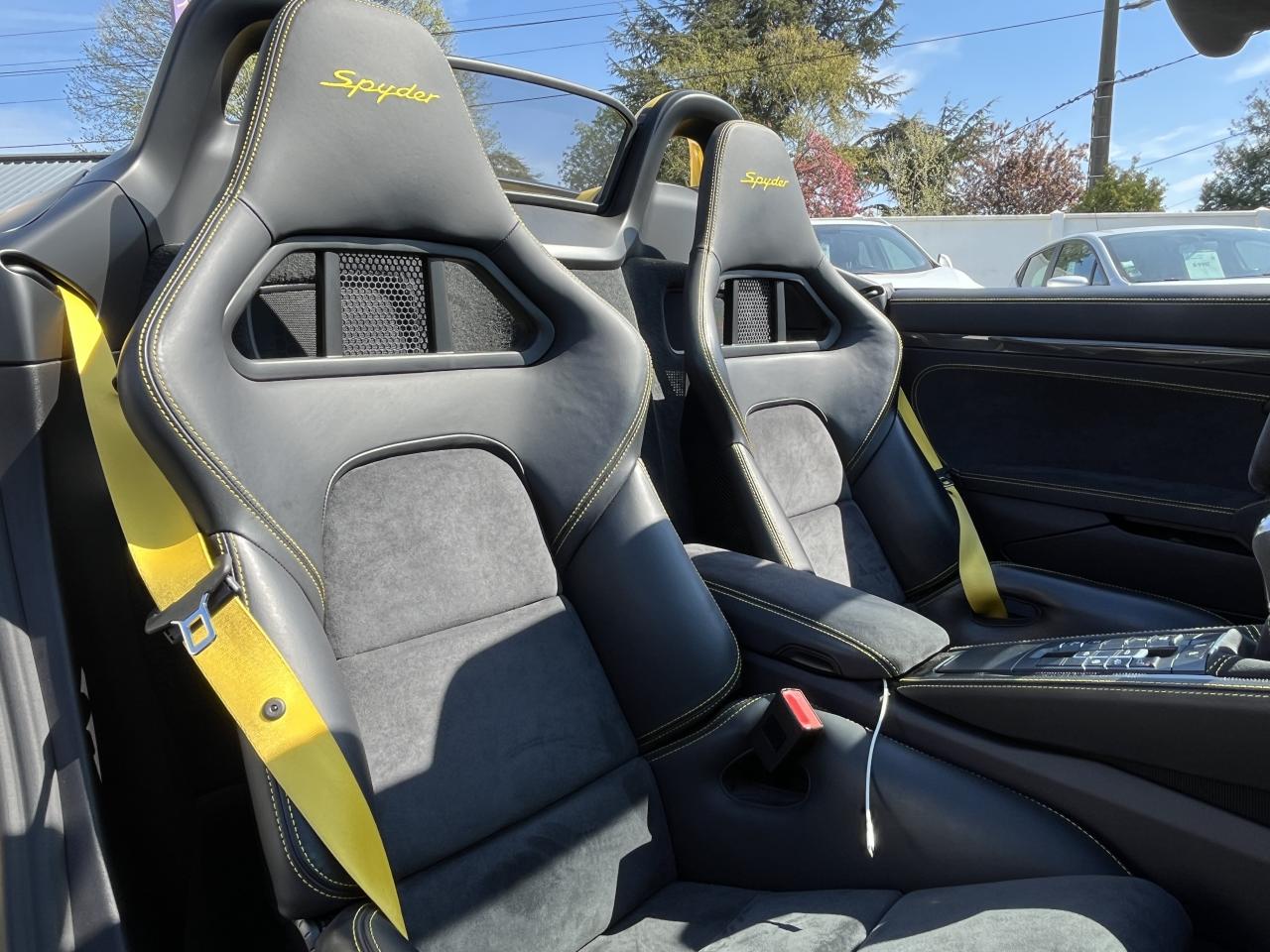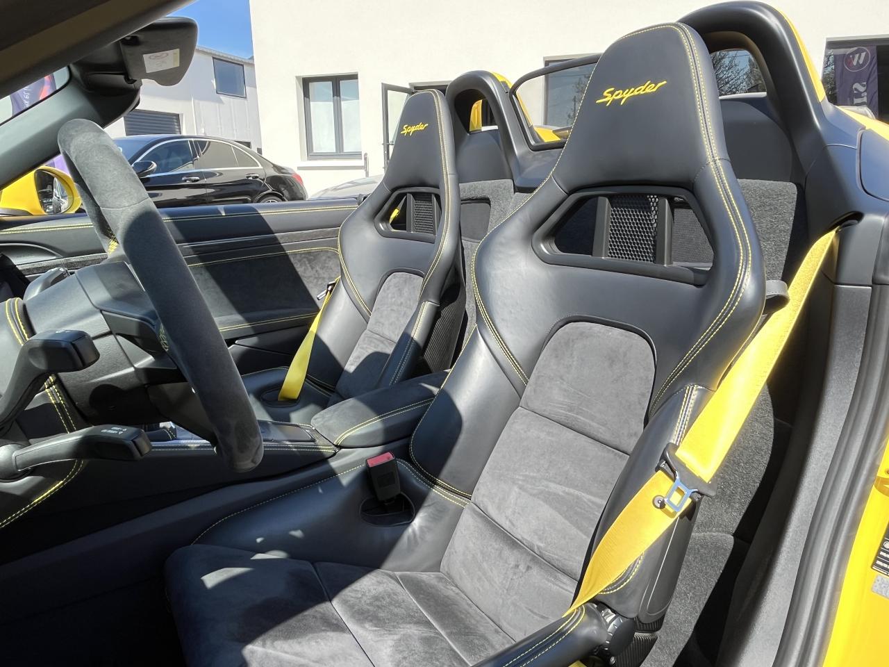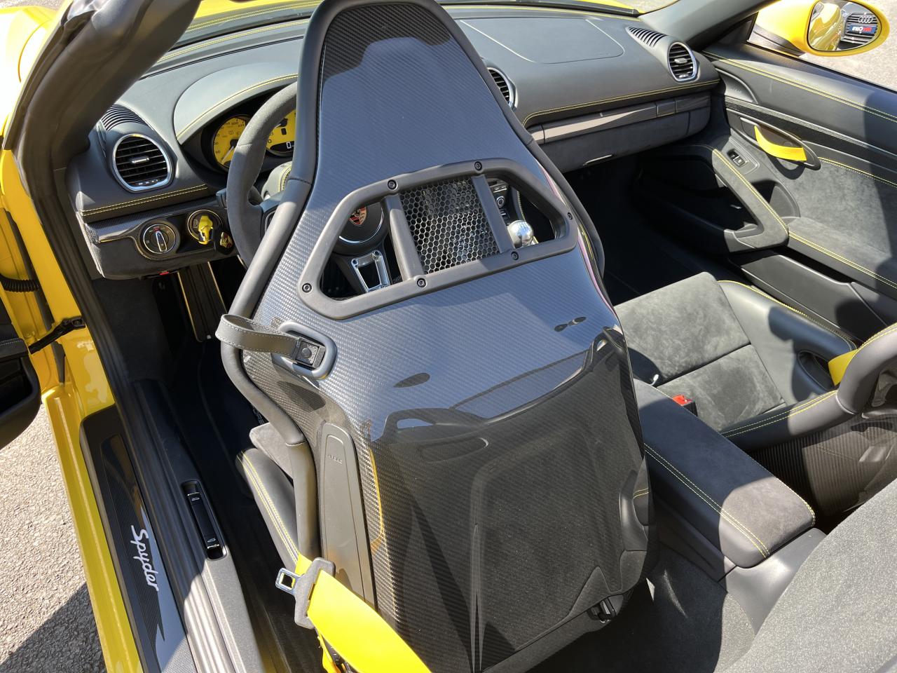 Affichage numérique : vitesse, rapport engagé, kilométrage total et journalier et heureAileron arrière spécifique Spyder à déploiement automatiqueAllumage automatique des feux en cas d'ouverture/fermeture du véhiculeAppuie-tête avec inscription «Spyder » brodée en NoirArceau de sécurité fixeBaguettes de seuil de porte avec désignation du modèleBloc moteur et culasse en aluminiumBoîte de vitesse mécanique à 6 rapports avec volant bimasseCapot arrière en Aluminium avec 2 streamliners dynamiquesCapote allégée, manuelle avec verrouillage électriqueCapote noireChâssis réglable pour l'usage sur circuit (carrossage, voie, barres stabilisatrices)Coffre à l’avant et à l’arrièreCombiné d'instruments avec compte-tours central et écran couleur haute définition de 4,6 poucesContrôle de pression des pneus ( TPMS )Deux catalyseurs à 3 voies et diagnostic embarqué dédié à la surveillance du système de dépollutionDirection électromécanique à assistance variable asservie à la vitesseDisques de freins de 380 mm de diamètre à l’avant, de 380 mm à l’arrière, ventilés et perforésEn Alcantara Noir : couronne du volant, parties centrales des sièges, poignées de porte, panneaux de porte, couvercle du compartiment rangement de la console centrale, ciel de toit. Ceintures en Noir. Coutures décoratives et logo 'Spyder' en NoirEnjoliveurs de roue avec écusson PorscheEntrées d'air latérales en couleur NoirEssieux avant et arrière multibras avec ressort additionnel intégré, barre stabilisatrice, suspension du châssis en partie avec rotules complémentairesEssuie-glaces avec buse de lave-glace intégréeÉtriers fixes monobloc en aluminium à 6 pistons à l'avant et 4 pistons à l'arrièreFeux à LED supplémentaires teintés intégrés au bouclier avant avec feux de position, clignotants et rappels de clignotant latérauxFeux arrière à DEL avec feux stop intégrés 4 points et feux de reculFeux arrière teintésFiltre à particulesFonction Start/StopFrein de parking électriqueJantes 718 Spyder 20 pouces avec pneus sport 245/35 ZR 20 à l'avant et 295/30 ZR 20 à l'arrièreKit de réparation avec compresseur électriqueLevier de vitesse raccourciLogo '718' sur le levier de vitesseLubrification à carter sec avec carter d'huile séparéPack Sport ChronoPanneau de soubassement fermé avec deux entrées de ventilation (type NACA) pour le système d'échappementPartie inférieure du bouclier arrière Noire avec diffuseurParties centrales des sièges en Alcantara, parties latérales et appuis-tête en cuirPorsche Active Suspension Management (PASM) avec réglage sport et abaissement du châssis d'environ 30 mmPorsche Communication Management (PCM) avec pré-équipement pour téléphone portable et interface audioPorsche Side Impact Protection System (POSIP), comprenant les éléments suivants : protection anti-encastrement latérale dans les portes, airbags thorax intégrés dans les bandes latérales des sièges avant et airbags de tête intégrésPorsche Torque Vectoring (PTV) incluant un mécanisme de verrouillage du différentiel arrièreProjecteurs bi-xénon et feux de jours à LEDRepose-pied et pédalier design sportRéservoir 64lRétroviseur extérieur sur panneau de porte, chauffant, réglable électriquement, asphérique côté conducteurServices Porsche Vehicle Tracking System (PVTS) permet l'accès aux services de commande liés au véhicule, à travers les services Porsche Car ConnectSièges sport Plus avec bandes latérales rehaussées, réglage électrique du dossier et réglage manuel de l’avancée et de la hauteur du siège côtés conducteur et passagerSound Package Plus, 6 haut-parleurs, puissance totale de 110 watts avec amplificateur intégré et traitement numérique des signauxSuspension dynamique de la transmissionSystème antidémarrage avec verrouillage centralisé et télécommandeSystème d'alarmeSystème d'échappement sport avec deux sorties d'échappement en acier spécial en Noir (finition brillante)Système de stabilité dynamique du véhicule PSM (Porsche Stability Management) avec ABS, désactivable sur 2 niveaux (SC OFF et SC+TC OFF)VarioCam (régulateur des arbres à cames d'admission et d'échappement)Volant à réglage manuel en hauteur et en profondeurVolant sport GT au design particulièrement sportif