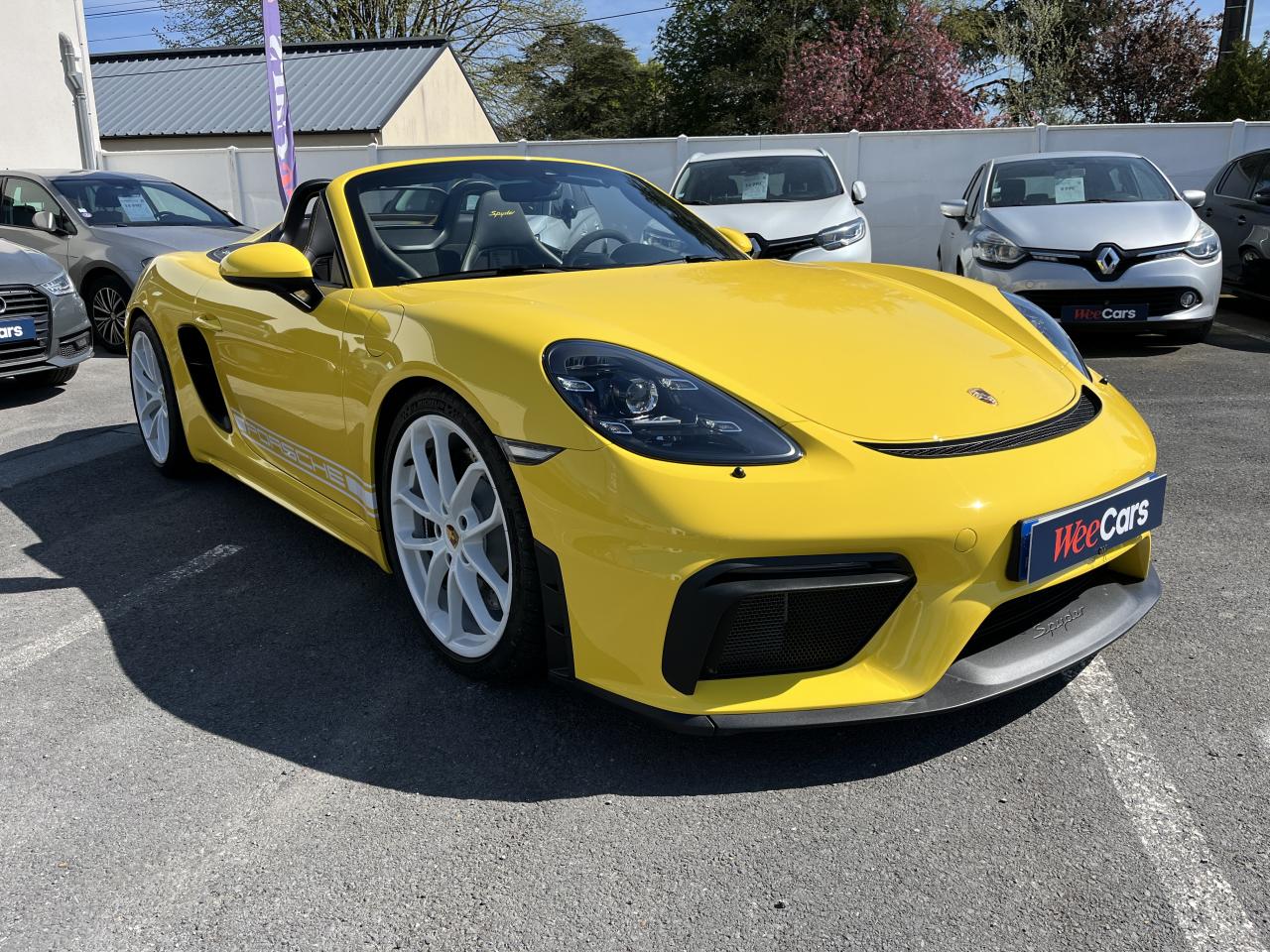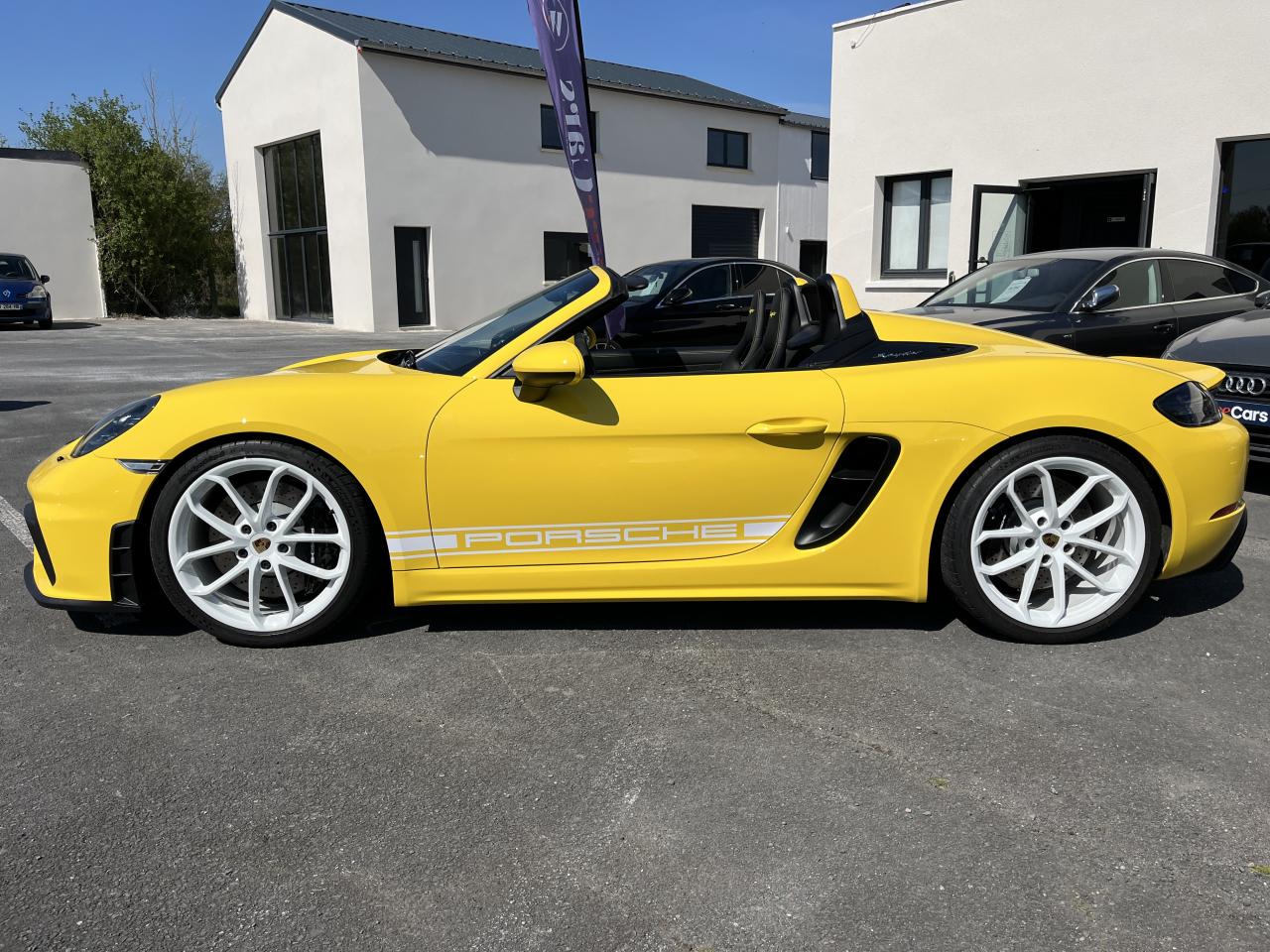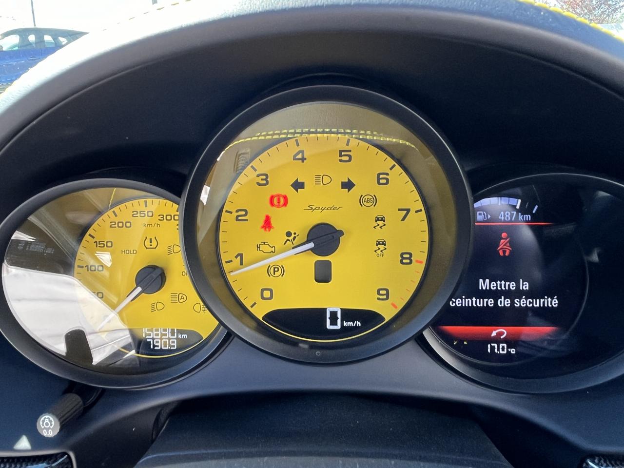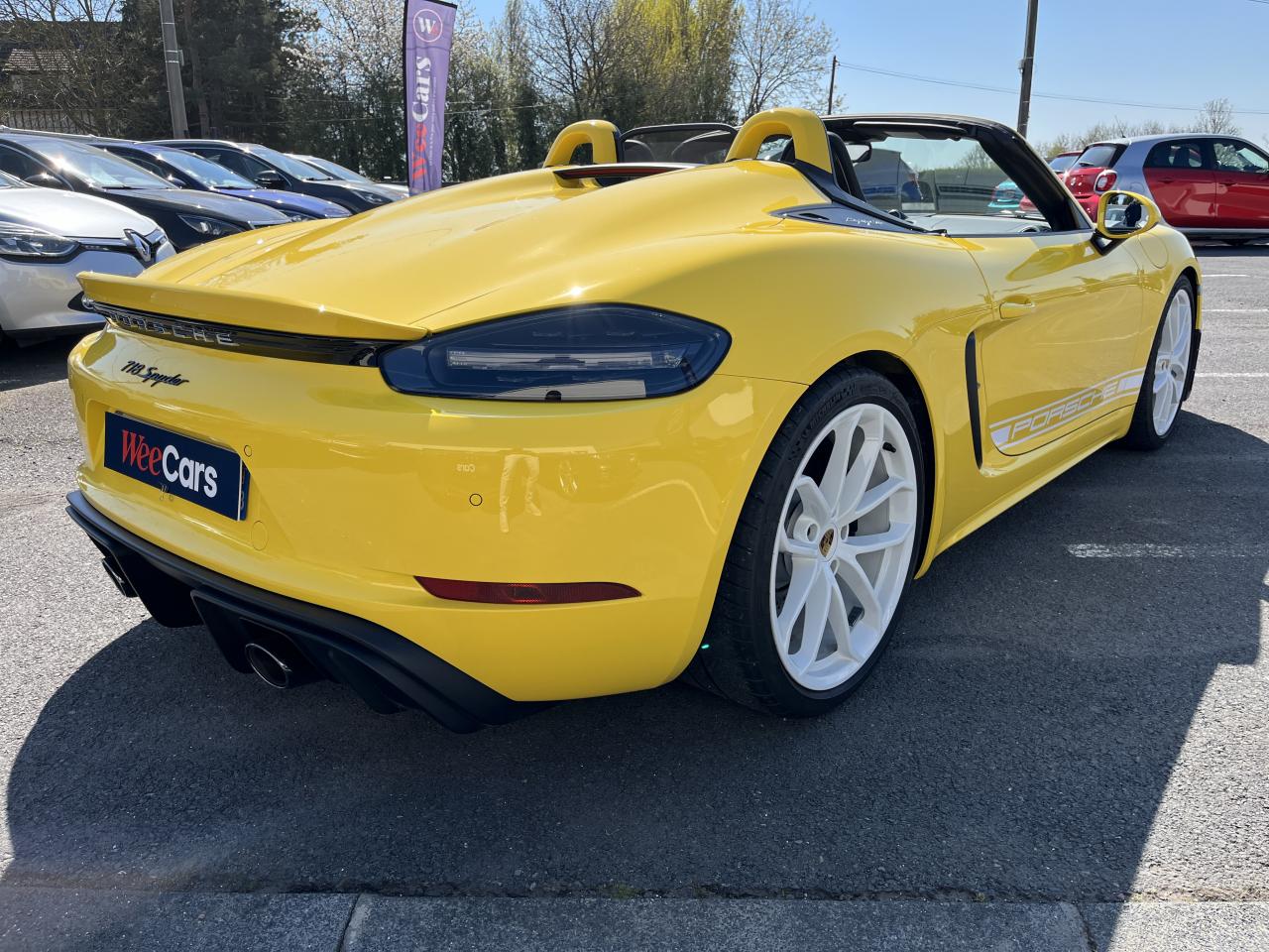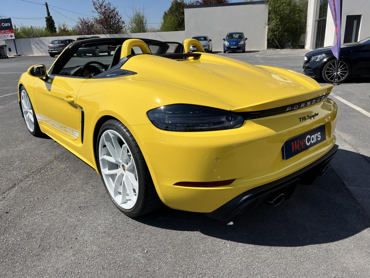 Affichage numérique : vitesse, rapport engagé, kilométrage total et journalier et heureAileron arrière spécifique Spyder à déploiement automatiqueAllumage automatique des feux en cas d'ouverture/fermeture du véhiculeAppuie-tête avec inscription «Spyder » brodée en NoirArceau de sécurité fixeBaguettes de seuil de porte avec désignation du modèleBloc moteur et culasse en aluminiumBoîte de vitesse mécanique à 6 rapports avec volant bimasseCapot arrière en Aluminium avec 2 streamliners dynamiquesCapote allégée, manuelle avec verrouillage électriqueCapote noireChâssis réglable pour l'usage sur circuit (carrossage, voie, barres stabilisatrices)Coffre à l’avant et à l’arrièreCombiné d'instruments avec compte-tours central et écran couleur haute définition de 4,6 poucesContrôle de pression des pneus ( TPMS )Deux catalyseurs à 3 voies et diagnostic embarqué dédié à la surveillance du système de dépollutionDirection électromécanique à assistance variable asservie à la vitesseDisques de freins de 380 mm de diamètre à l’avant, de 380 mm à l’arrière, ventilés et perforésEn Alcantara Noir : couronne du volant, parties centrales des sièges, poignées de porte, panneaux de porte, couvercle du compartiment rangement de la console centrale, ciel de toit. Ceintures en Noir. Coutures décoratives et logo 'Spyder' en NoirEnjoliveurs de roue avec écusson PorscheEntrées d'air latérales en couleur NoirEssieux avant et arrière multibras avec ressort additionnel intégré, barre stabilisatrice, suspension du châssis en partie avec rotules complémentairesEssuie-glaces avec buse de lave-glace intégréeÉtriers fixes monobloc en aluminium à 6 pistons à l'avant et 4 pistons à l'arrièreFeux à LED supplémentaires teintés intégrés au bouclier avant avec feux de position, clignotants et rappels de clignotant latérauxFeux arrière à DEL avec feux stop intégrés 4 points et feux de reculFeux arrière teintésFiltre à particulesFonction Start/StopFrein de parking électriqueJantes 718 Spyder 20 pouces avec pneus sport 245/35 ZR 20 à l'avant et 295/30 ZR 20 à l'arrièreKit de réparation avec compresseur électriqueLevier de vitesse raccourciLogo '718' sur le levier de vitesseLubrification à carter sec avec carter d'huile séparéPack Sport ChronoPanneau de soubassement fermé avec deux entrées de ventilation (type NACA) pour le système d'échappementPartie inférieure du bouclier arrière Noire avec diffuseurParties centrales des sièges en Alcantara, parties latérales et appuis-tête en cuirPorsche Active Suspension Management (PASM) avec réglage sport et abaissement du châssis d'environ 30 mmPorsche Communication Management (PCM) avec pré-équipement pour téléphone portable et interface audioPorsche Side Impact Protection System (POSIP), comprenant les éléments suivants : protection anti-encastrement latérale dans les portes, airbags thorax intégrés dans les bandes latérales des sièges avant et airbags de tête intégrésPorsche Torque Vectoring (PTV) incluant un mécanisme de verrouillage du différentiel arrièreProjecteurs bi-xénon et feux de jours à LEDRepose-pied et pédalier design sportRéservoir 64lRétroviseur extérieur sur panneau de porte, chauffant, réglable électriquement, asphérique côté conducteurServices Porsche Vehicle Tracking System (PVTS) permet l'accès aux services de commande liés au véhicule, à travers les services Porsche Car ConnectSièges sport Plus avec bandes latérales rehaussées, réglage électrique du dossier et réglage manuel de l’avancée et de la hauteur du siège côtés conducteur et passagerSound Package Plus, 6 haut-parleurs, puissance totale de 110 watts avec amplificateur intégré et traitement numérique des signauxSuspension dynamique de la transmissionSystème antidémarrage avec verrouillage centralisé et télécommandeSystème d'alarmeSystème d'échappement sport avec deux sorties d'échappement en acier spécial en Noir (finition brillante)Système de stabilité dynamique du véhicule PSM (Porsche Stability Management) avec ABS, désactivable sur 2 niveaux (SC OFF et SC+TC OFF)VarioCam (régulateur des arbres à cames d'admission et d'échappement)Volant à réglage manuel en hauteur et en profondeurVolant sport GT au design particulièrement sportif