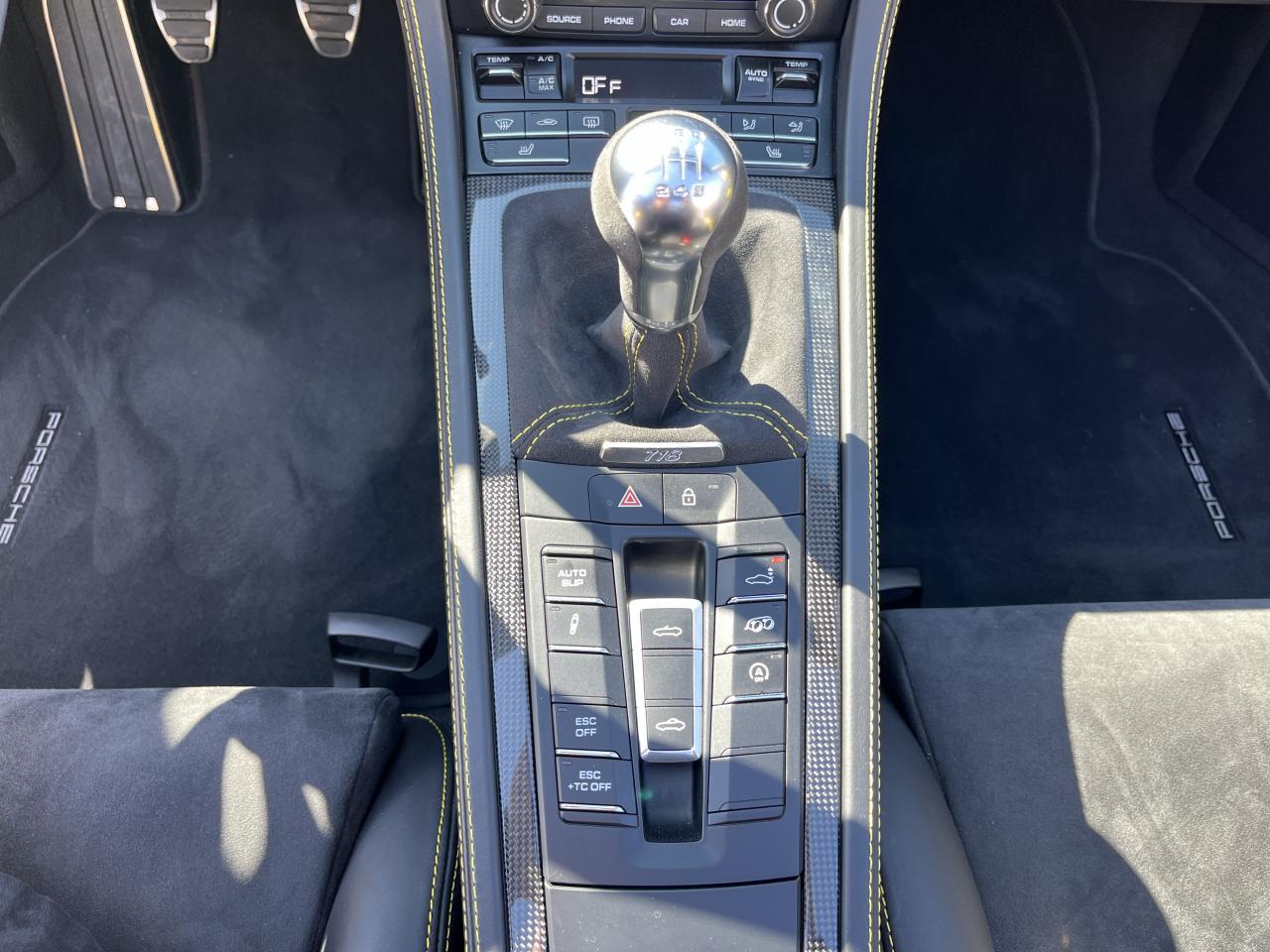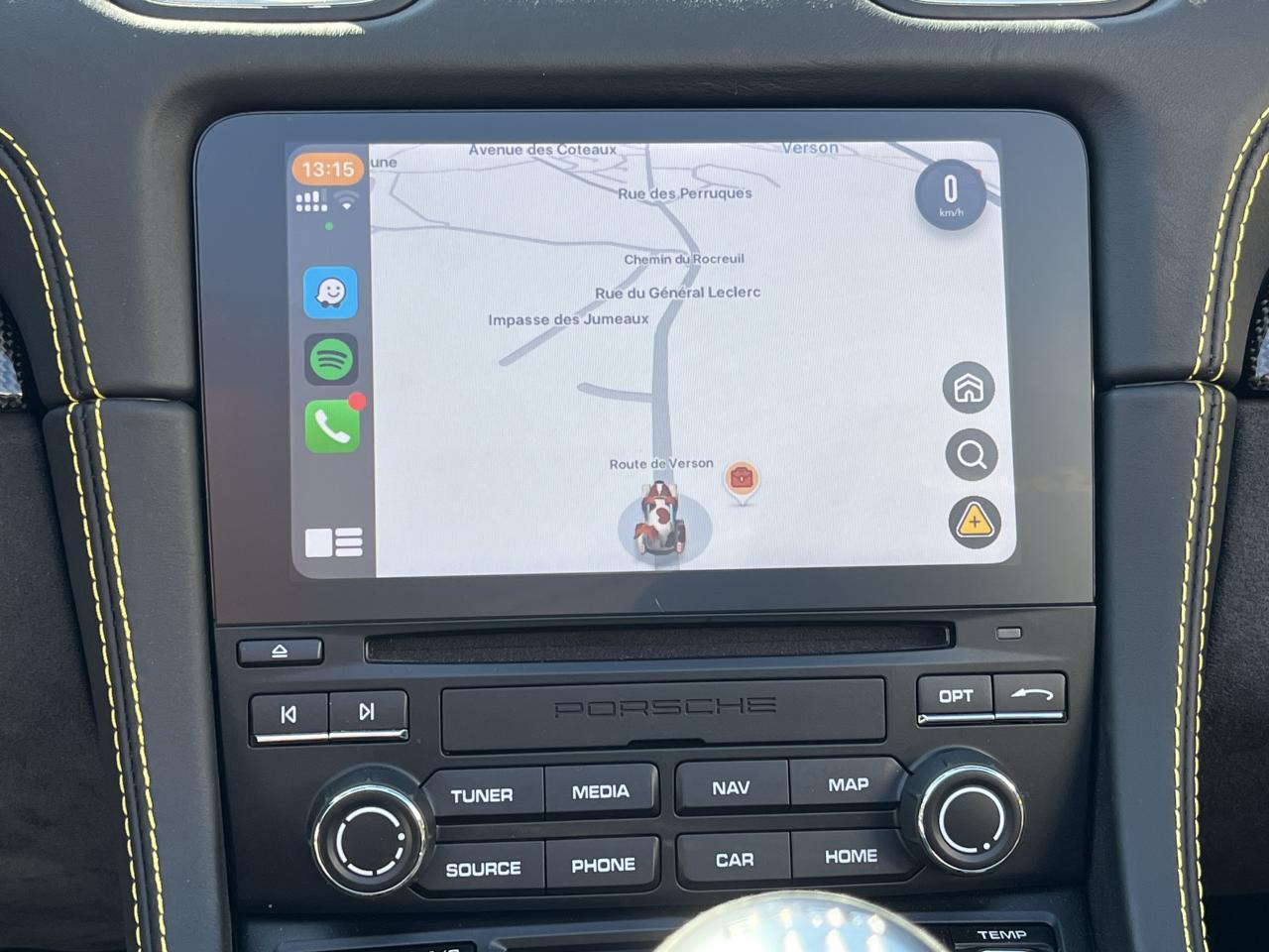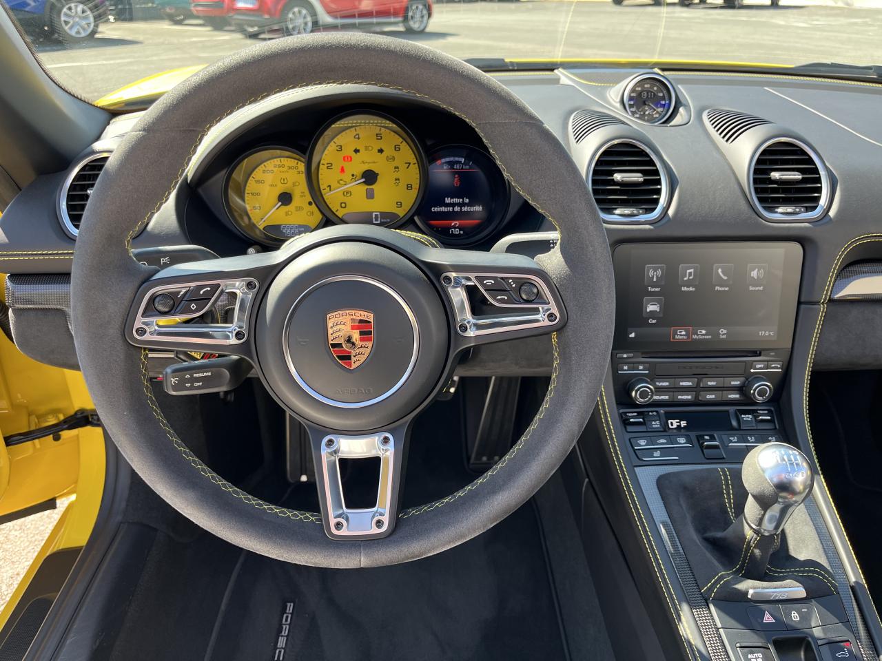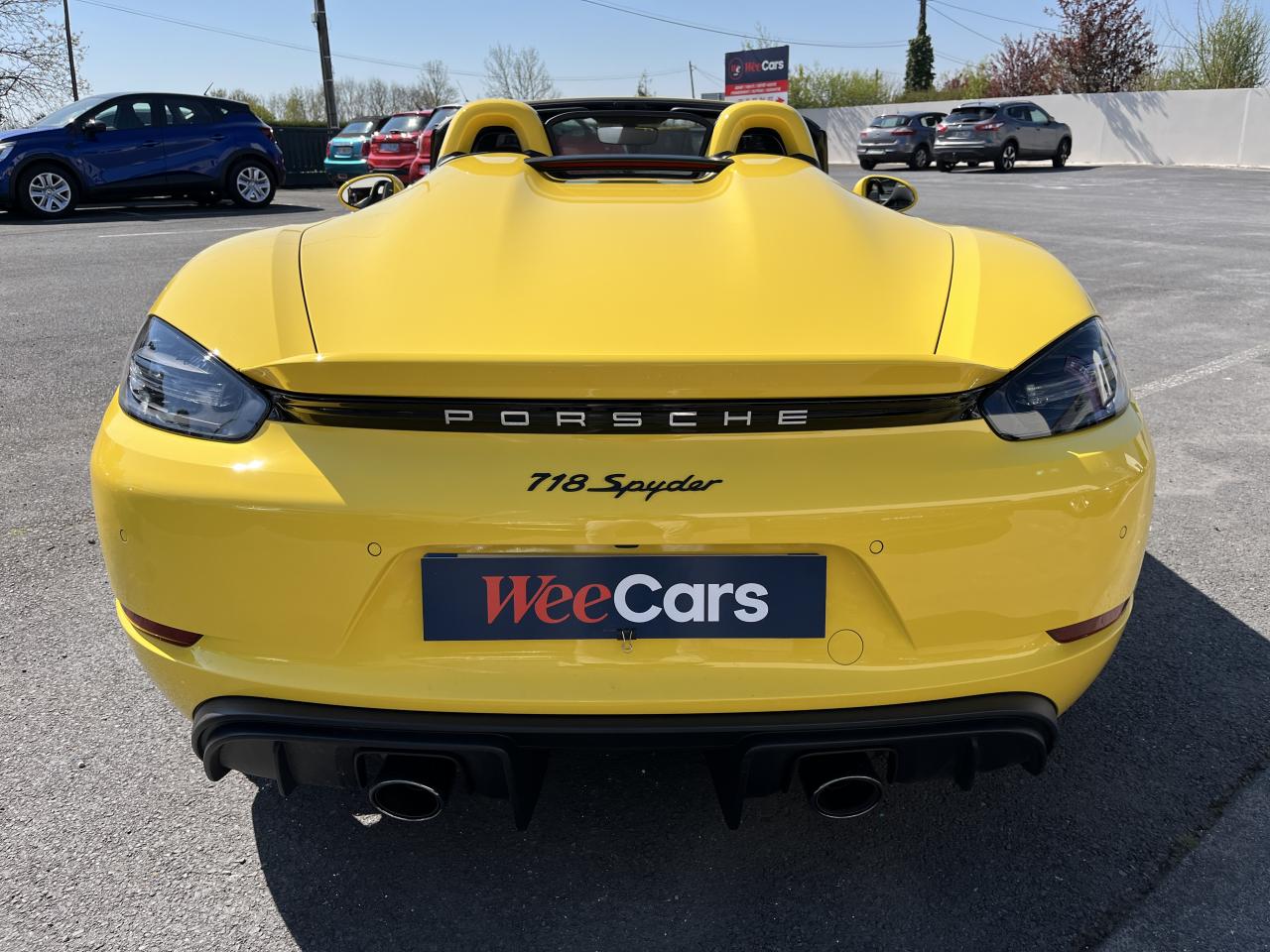 Affichage numérique : vitesse, rapport engagé, kilométrage total et journalier et heureAileron arrière spécifique Spyder à déploiement automatiqueAllumage automatique des feux en cas d'ouverture/fermeture du véhiculeAppuie-tête avec inscription «Spyder » brodée en NoirArceau de sécurité fixeBaguettes de seuil de porte avec désignation du modèleBloc moteur et culasse en aluminiumBoîte de vitesse mécanique à 6 rapports avec volant bimasseCapot arrière en Aluminium avec 2 streamliners dynamiquesCapote allégée, manuelle avec verrouillage électriqueCapote noireChâssis réglable pour l'usage sur circuit (carrossage, voie, barres stabilisatrices)Coffre à l’avant et à l’arrièreCombiné d'instruments avec compte-tours central et écran couleur haute définition de 4,6 poucesContrôle de pression des pneus ( TPMS )Deux catalyseurs à 3 voies et diagnostic embarqué dédié à la surveillance du système de dépollutionDirection électromécanique à assistance variable asservie à la vitesseDisques de freins de 380 mm de diamètre à l’avant, de 380 mm à l’arrière, ventilés et perforésEn Alcantara Noir : couronne du volant, parties centrales des sièges, poignées de porte, panneaux de porte, couvercle du compartiment rangement de la console centrale, ciel de toit. Ceintures en Noir. Coutures décoratives et logo 'Spyder' en NoirEnjoliveurs de roue avec écusson PorscheEntrées d'air latérales en couleur NoirEssieux avant et arrière multibras avec ressort additionnel intégré, barre stabilisatrice, suspension du châssis en partie avec rotules complémentairesEssuie-glaces avec buse de lave-glace intégréeÉtriers fixes monobloc en aluminium à 6 pistons à l'avant et 4 pistons à l'arrièreFeux à LED supplémentaires teintés intégrés au bouclier avant avec feux de position, clignotants et rappels de clignotant latérauxFeux arrière à DEL avec feux stop intégrés 4 points et feux de reculFeux arrière teintésFiltre à particulesFonction Start/StopFrein de parking électriqueJantes 718 Spyder 20 pouces avec pneus sport 245/35 ZR 20 à l'avant et 295/30 ZR 20 à l'arrièreKit de réparation avec compresseur électriqueLevier de vitesse raccourciLogo '718' sur le levier de vitesseLubrification à carter sec avec carter d'huile séparéPack Sport ChronoPanneau de soubassement fermé avec deux entrées de ventilation (type NACA) pour le système d'échappementPartie inférieure du bouclier arrière Noire avec diffuseurParties centrales des sièges en Alcantara, parties latérales et appuis-tête en cuirPorsche Active Suspension Management (PASM) avec réglage sport et abaissement du châssis d'environ 30 mmPorsche Communication Management (PCM) avec pré-équipement pour téléphone portable et interface audioPorsche Side Impact Protection System (POSIP), comprenant les éléments suivants : protection anti-encastrement latérale dans les portes, airbags thorax intégrés dans les bandes latérales des sièges avant et airbags de tête intégrésPorsche Torque Vectoring (PTV) incluant un mécanisme de verrouillage du différentiel arrièreProjecteurs bi-xénon et feux de jours à LEDRepose-pied et pédalier design sportRéservoir 64lRétroviseur extérieur sur panneau de porte, chauffant, réglable électriquement, asphérique côté conducteurServices Porsche Vehicle Tracking System (PVTS) permet l'accès aux services de commande liés au véhicule, à travers les services Porsche Car ConnectSièges sport Plus avec bandes latérales rehaussées, réglage électrique du dossier et réglage manuel de l’avancée et de la hauteur du siège côtés conducteur et passagerSound Package Plus, 6 haut-parleurs, puissance totale de 110 watts avec amplificateur intégré et traitement numérique des signauxSuspension dynamique de la transmissionSystème antidémarrage avec verrouillage centralisé et télécommandeSystème d'alarmeSystème d'échappement sport avec deux sorties d'échappement en acier spécial en Noir (finition brillante)Système de stabilité dynamique du véhicule PSM (Porsche Stability Management) avec ABS, désactivable sur 2 niveaux (SC OFF et SC+TC OFF)VarioCam (régulateur des arbres à cames d'admission et d'échappement)Volant à réglage manuel en hauteur et en profondeurVolant sport GT au design particulièrement sportif