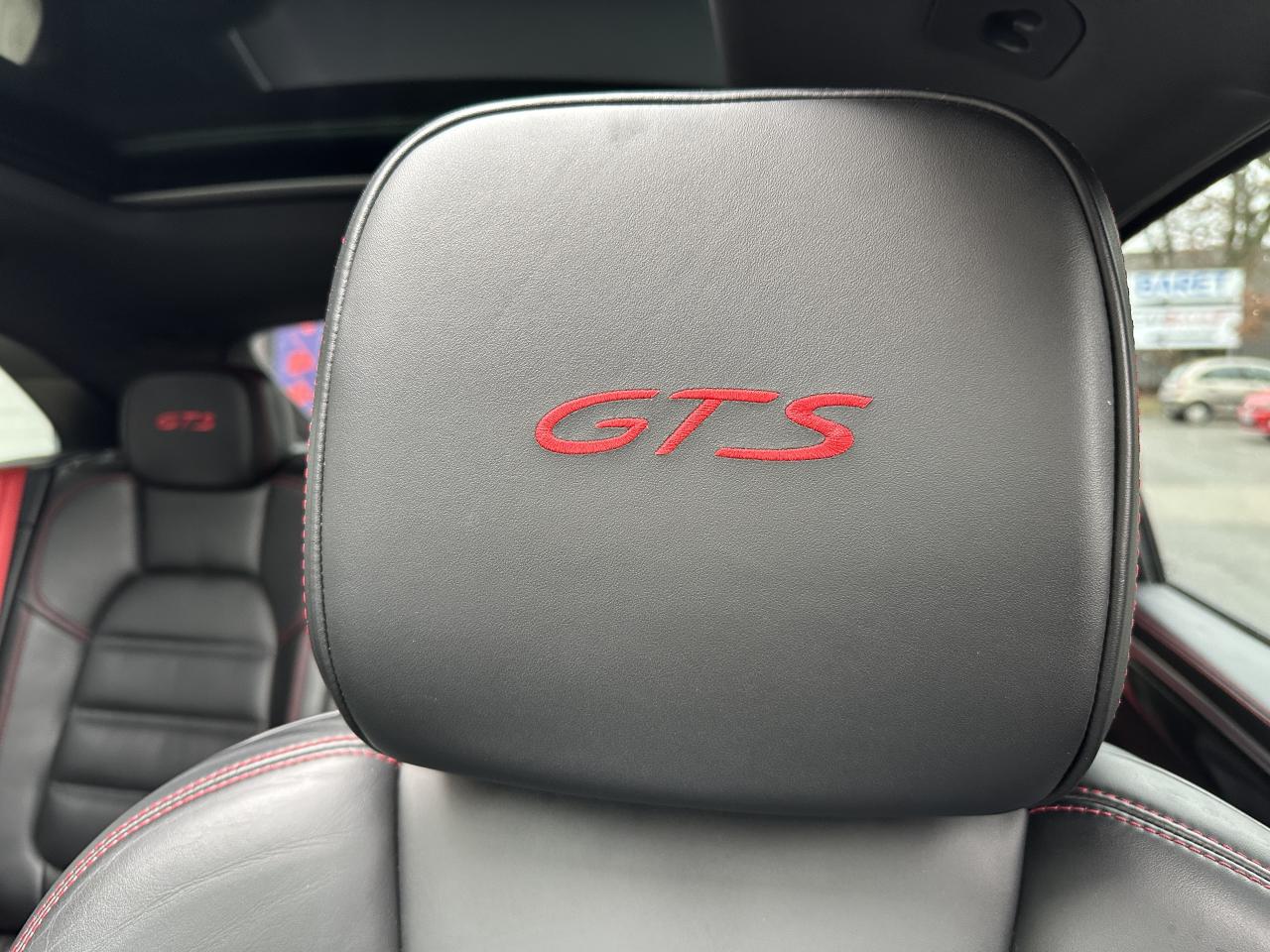 3 instruments ronds intégrés dans le cockpit, 4 soupapes par cylindre, Accélérateur électronique, Antenne intégrées dédiées à la radio, la navigation, le téléphone et la TV, Avertisseur de changement de voie, Bobines d'allumage séparées (distribution statique à haute tension), Boîte Porsche Doppelkupplung (PDK) à 7 rapports, avec modes manuel en utilisant les palettes au volant ou mode automatique, affichage du passage optimal à la vitesse supérieure pour la consommation d'essence, Capacité du réservoir : 65 litres, Climatisation 3 zones, Compensation hydraulique du jeu des soupapes, Controle en descente (Porsche Hill Control PHC), Deux sorties d'échappement doubles couleur Argent mat, Ecran TFT couleur haute définition 4,8 pouces, affichage des rapports de la PDK, des intervalles de révision, de la température extérieure et des différents témoins d'alarme, Gestion thermique, Hayon arrière avec becquet intégré, Hayon automatique, Injection directe d'essence (Direct Fuel Injection, DFI), Logo GTS sur les appuie-tête avant et arrière, Pack Audio Plus, Pack Intérieur Aluminium brossé, Pack intérieur cuir GTS, Porsche Active Suspension Management (PASM), Porsche Communication Management (PCM) avec pré-équipement pour téléphone portable et interface audio, Porsche Traction Management (PTM) : transmission intégrale dynamique avec différentiel central multidisque électronique, différentiel de freinage automatique (ABD), système de régulation antipatinage (ASR), Porsche Vehicle Tracking System (PVTS), Régulation lambda stéréo, Régulation sélective du cliquetis, Sidesblades en Noir mat avec logo GTS, Sièges sport GTS avec 8 réglages électriques, Signature "PORSCHE" avec monogramme arrière en Noir mat, Touche AC MAX, Touche SPORT, VarioCam Plus avec calage variable des arbres à cames et de la levée des soupapes, Volant Multifonction avec palettes de passage des rapports