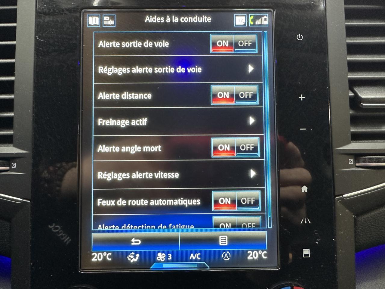 1 prise jack aux places avant2 Prises USBABS avec aide au freinage d'urgenceAérateurs aux places arrièresAffichage tête hauteAide au démarrage en côteAirbags frontaux conducteur et passager adaptatifs (airbag passager déconnectable)Airbags latéraux (thorax / bassin) avantAirbags rideaux de tête aux places avant et arrièreAmbiance lumineuseBanquette 60/40 fractionnable avec accoudoir et trappe à skisBas de planche de bord gainéBoîte à gantsCapteur de toxicitéCarte Renault mains-libres avec allumage des feux à l'approcheClimatisation automatique bi-zoneCommandes de l'autoradio au volantCompartimentage de coffre verticalCompatibilité Apple CarPlay et Android AutoCompteur digital TFT 7“Condamnation automatique des ouvrants en roulantContrôle dynamique de trajectoire (ESC)Détecteur de pluie et allumage automatique des projecteursEclairage d'accueil sur rétroviseurs extérieursEco driving (Monitoring, Scoring, Coaching et conseils)Feux arrière avec signature lumineuse à LED à technologie EDGE et effet 3D, clignotants et feux stop à LEDFeux de jour à LEDFeux LED Pure VisionFiltre combinéFixations Isofix et i-Size 2 sièges arrièreFollow-me homeFrein de parking assistéJantes alliage 18" DuettoLève vitres avant électriques à impulsionLève-vitres arrière électriques impulsionnelsMiroirs de courtoisie éclairésMode EcoOrdinateur de bordPack Aides à la conduitePack Renault R-Link 2 avec écran 8,7"Pack Visio SystemPlafonnier éclairage LEDPlanche de bord noirePoches aumônières au dos des sièges avantPoignées de portes ton caisse avec décors chromésPrédisposition pour alarme disponible en accessoirePrise électrique 12V dans le coffrePrises 12 V à l'avant et à l'arrièreProjecteurs antibrouillard avec enjoliveurs chromésProjecteurs antibrouillard LED avec fonction corneringRadio Numérique DABRails de toit en aluminiumRangement bouteille réfrigéré en consoleRangement console sous accoudoir avec plateau amovibleRenault Multi-SenseRétroviseur intérieur électrochromeRétroviseurs extérieurs électriques, dégivrants et rabattables électriquementRideaux pare-soleil aux portes arrièreSellerie mixte similicuir / textileSeuils de portes avantSiège conducteur massant à réglages manuels avec réglages lombaires électriquesSiège passager avec réglage lombaire manuelSon Arkamys 8 haut-parleursSurtapis aux places avant et arrièreSystème d'aide au parking avant et arrièreSystème de surveillance de la pression des pneumatiquesSystème Easy Break pour banquette arrièreSystème Stop & StartTendelet rétractable 2 positionsVitres latérales et lunette arrière surteintéesVolant et pommeau de levier de vitesse en cuirVolant réglable en hauteur et en profondeur