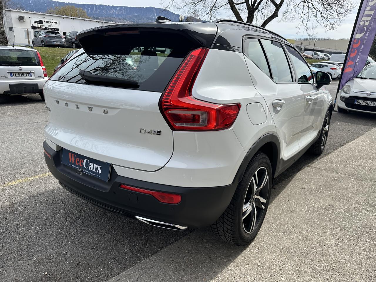 2 porte-cintres, Airbag genoux conducteur, Airbag passager désactivable avec témoin d'indication (on/off), Airbags conducteur et passager à déclenchement différencié, Airbags latéraux conducteur et passager, Airbags rideaux, Alerte franchissement de ligne active, Allumage automatique des projecteurs, Antibrouillards avant à LED avec éclairage d'intersection, Apple CarPlay / Google Android Auto, Appuie-tête réglables en hauteur sur les sièges avant, Assise des sièges avant à absorption d'énergie, Assise des sièges avant extensible manuellement, Assistance au démarrage en côte, Badge R-design à l'arrière sur le hayon, Bas de caisse et passages de roues Anthracite, Bouton de verrouillage centralisé, Calandre spécifique R-design avec contour noir brillant, Capteur de pluie, Ceintures de sécurité à inertie à 3 points d'ancrage sur les 5 sièges, Ceintures de sécurité actives à prétensionneurs, Chargeur de téléphone portable à induction, Châssis “Sport”, City Safety, système d'anticipation de collision intelligent, Clé R-design gainée de Cuir, CleanZone Filtre à charbon de climatisation multi-actif AQS et fonction pré-ventilation, Climatisation automatique, Combiné d'instruments digital 12,3” personnalisable, Commande vocale avancée, Commandes audio au volant, Connexion Bluetooth, Contrôle de la stabilité au roulis RSC, Coque rétroviseur Noir brillant, Corbeille intégrée et amovible au niveau du tunnel central avant, Correcteur électronique de trajectoire (ESC), Crochet pour sacs intégré à la boîte à gants, Déclenchement automatique des feux de détresse lors d'un freinage d'urgence, Diffuseur arrière spécifique R-design, Direction assistée électrique asservie à la vitesse, Dossier arrière rabattable 60 / 40, Double sortie d'échappement rectangulaire chromée intégrée, Eclairage d'approche et d'accompagnement, Eclairage dans le coffre, Ecran tactile multimédia haute résolution 9”, personnalisable, Feu arrière antibrouillard, Feux de freinage d'urgence, Feux de jour à LED, Filtre à particules sans entretien, Fonction climatisation de l'habitacle moteur coupé, Fonction Eco+ : optimisation des paramètres véhicule pour une conduite économique et écologique, Fonction Start/Stop, Frein de parking électronique automatique avec fonction Auto Hold (désactivable), Freinage automatique post-collision, Incrustations Aluminium R-design, Indicateur de perte de pression des pneumatiques, Jantes alliage 18” 5 branches double Noir Mat / Argent avec pneus 235/55 R18, Kit anti-crevaison, Logo R-design au niveau des montants arrière, Matériaux anti-allergènes dans l'habitacle (sellerie,ceintures de sécurité, incrustations), Miroirs de courtoisie éclairés, Mode de conduite personnalisable, Pack Business, Pack Eclairage Supérieur, Pare-brise en verre feuilleté et colonne de direction rétractable en cas de choc, Parties inférieures des rétroviseurs extérieurs peintes en Noir, Pavillon de toit Anthracite, Pédale de frein rétractable en cas de collision, Pédalier R-design en Aluminium, Phares LED avec correcteur dynamique de la portée, feux de route adaptatifs et feux de jour design marteau de Thor, Porte-cartes bancaires et cartes de services intégré dans la planche de bord, Porte-ticket de parking et d'autoroute, Pré-câblage électrique pour le crochet d'attelage, Préparation pour le système de fixation Isofix (sièges latéraux de la banquette arrière), Protections de pare-chocs avant et arrière Noir brillant, Rails de toit et parties inférieures des vitres noir brillant, Rangement sous la console centrale, Rappel d'oubli de bouclage des ceintures de sécurité avant et arrière, Rappels de clignotants à LED intégrés aux rétroviseurs extérieurs, Reconnaissance des panneaux de signalisation, Réglage en hauteur manuel des ceintures avant, Réglages lombaires électriques des sièges conducteur et passager, Régulateur et limiteur de vitesse, Rétroviseur extérieur conducteur grand angle, Rétroviseurs extérieurs rabattables électriquement avec éclairage du sol, Rétroviseurs intérieur sans contours et extérieurs électrochromes, Sellerie Nubuck / Cuir R-design avec surpiqûres et passepoil Beige, Sensus Connect : Applications web, affichage et lecture vocale des SMS (TTS), eManuel utilisateur et service révision connectée, Seuil de coffre en aluminium, Seuils de portes avant R-design en Aluminium, Siège conducteur réglable manuellement en hauteur, Siège passager réglable en hauteur manuellement, Sièges conducteur et passager avant avec réglage manuel de la longueur et inclinaison, Sonde de température extérieure et horloge, Spots de lecture à l'avant, Système audio Volvo High Performance, Système de contrôle de la descente (HDC), Système de contrôle de la stabilité et de la traction STC, Système de contrôle du freinage du véhicule VDC, Système de protection anti-sortie de route, Système de protection collision frontale, Système de récupération de l'énergie au freinage, Système de réglage en hauteur des phares, Système de surveillance de la vigilance du conducteur, Système intelligent d'informations au conducteur IDIS, Tapis de sol R-design, Télécommande de verrouillage centralisé avec clé de contact intégrée, fermeture à distance des vitres et du toit ouvrant et fonction panique (déclenchement du klaxon et des feux de détresse), Toit contrasté noir, Trappe à carburant intelligente sans bouchon, Trousse de 1er secours et triangle de présignalisation, Tunnel de la console centrale Noir brillant, Verrouillage automatique des portes à partir de 7 km/h, Verrouillage manuel de sécurité enfant, Vitres avant et arrière électriques à impulsion (montée et descente) avec système anti-pincement, Vitres teintées à 25 %, Volant R-design en Cuir perforé avec insert Aluminium, Volant réglable en hauteur et en profondeur, Volvo On Call avec fonction Car Sharing
